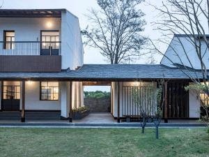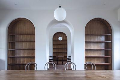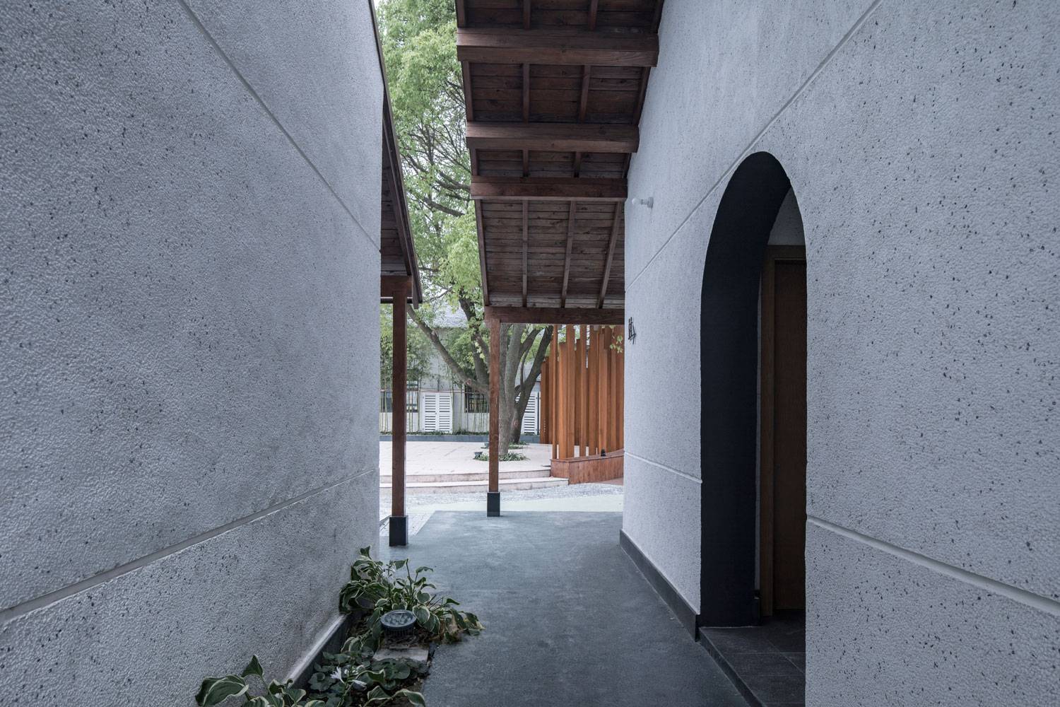 江南民居建筑最顯著的特點(diǎn)就是白墻黑瓦,屋面使用了比傳統(tǒng)青瓦更輕的青石板平瓦,外墻使用當(dāng)?shù)卦旆孔映S玫乃词?,白石子里摻少量黑石子,時(shí)間長(zhǎng)了外墻會(huì)變深但不顯臟。檐廊地面是黑色環(huán)氧金剛砂材質(zhì),讓房子的基底顯得更加沉穩(wěn)。南北朝向的門窗洞口形狀方正,洞口側(cè)邊涂上黑色,曾經(jīng)是主流的老鋼窗也在這里登場(chǎng);南北山墻側(cè)的門窗洞口則設(shè)計(jì)成圓拱形,增添空間的戲劇性。