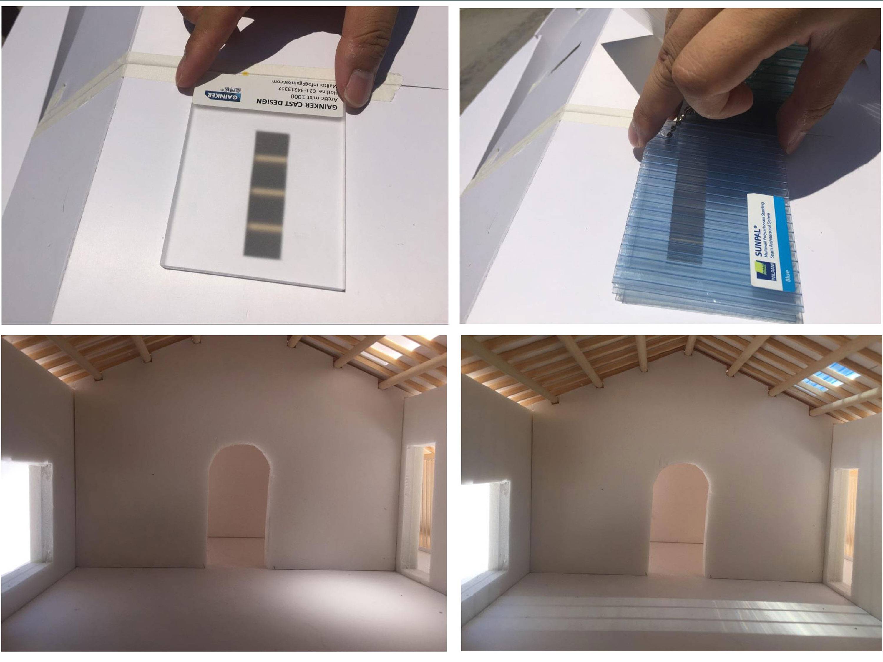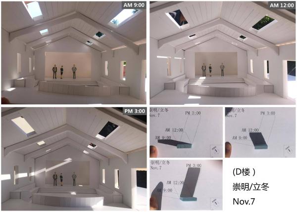 檐廊帶來(lái)了半戶外空間,但同時(shí)也遮擋了南向窗戶的采光,于是天窗的設(shè)計(jì)就隨之產(chǎn)生。設(shè)計(jì)師希望室內(nèi)是個(gè)明亮的空間,白天可以不開燈,完全依靠自然天光,也盡量讓冬天有更多的陽(yáng)光能進(jìn)入室內(nèi)。因此我們選擇立春,大暑,立秋,立冬四天中的上午9點(diǎn)、中午12點(diǎn),下午3點(diǎn)三個(gè)時(shí)間段,用太陽(yáng)投影對(duì)位的方法,在戶外用實(shí)體模型進(jìn)行比較分析,決定了天窗的位置和尺寸。同時(shí)為了避免太陽(yáng)光線過(guò)強(qiáng)而干擾室內(nèi)的活動(dòng),最終決定用磨砂玻璃,讓光線散射進(jìn)入室內(nèi)。另外使用稻草漆(麻刀灰)批墻,讓空間彌漫著柔和的光線。
