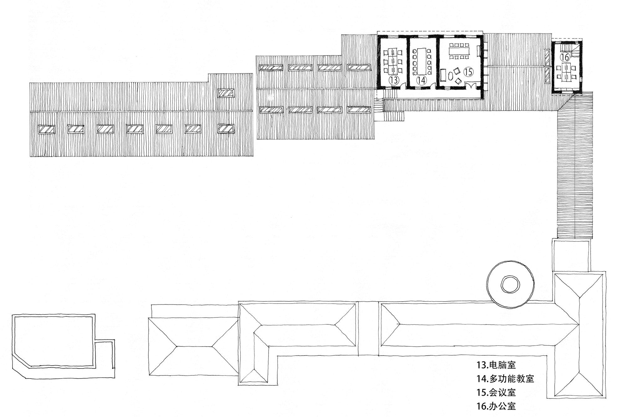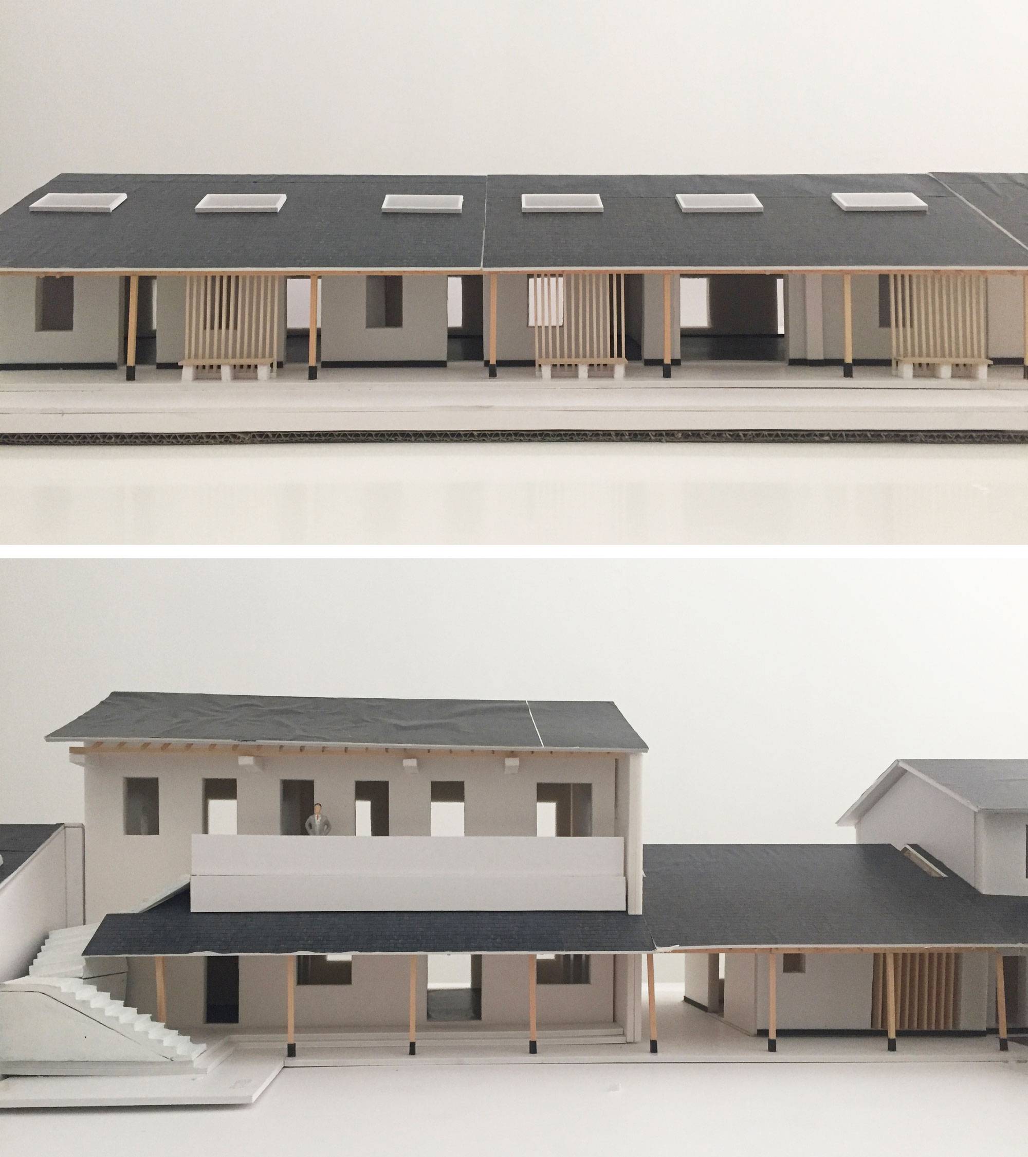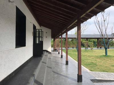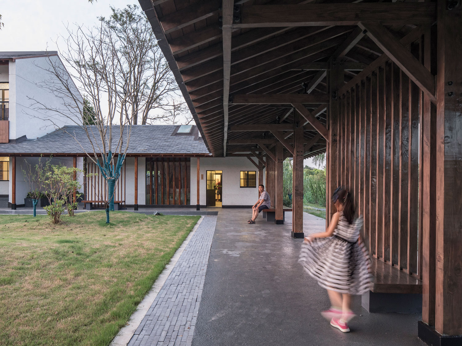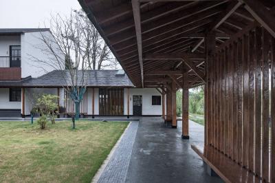 在設(shè)計(jì)初期,我們思考著如何在這些房間之間設(shè)計(jì)一條互通的交通動(dòng)線,檐廊的設(shè)計(jì)想法就應(yīng)運(yùn)而生。屋檐順著現(xiàn)有建筑的屋面坡度挑出,檐口高度壓至2.3米,檐廊將各棟建筑連接起來(lái);直到東側(cè)河畔,檐廊則轉(zhuǎn)變?yōu)榛乩?,形成了連續(xù)的半戶外空間,為人們提供交流、休憩、觀景的場(chǎng)所。房子南面面向開放的活動(dòng)場(chǎng)地,北面是圍墻圍合的后院,房子之間設(shè)計(jì)了兩處通往后院的過(guò)廊。