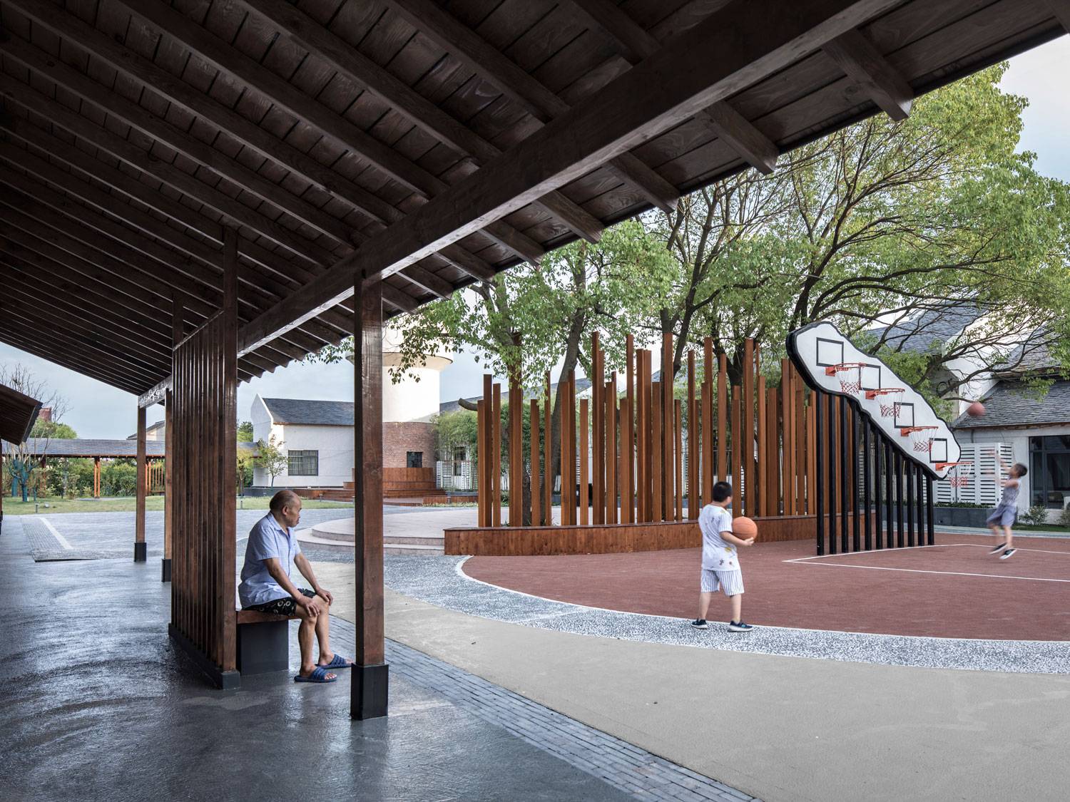 場(chǎng)地中央的4棵老樟樹形成了天然的庇護(hù)空間,在這里設(shè)計(jì)了一個(gè)橢圓形的戶外舞臺(tái),可以舉行鎮(zhèn)里定期的文藝表演,平時(shí)傍晚則是阿姨們跳廣場(chǎng)舞的地方。大樹西側(cè)布置3個(gè)運(yùn)動(dòng)場(chǎng)地,籃球、羽毛球、健身器材區(qū),右側(cè)是舞臺(tái)觀看區(qū)、綠地草坪,水塔下是兒童活動(dòng)的木平臺(tái)。