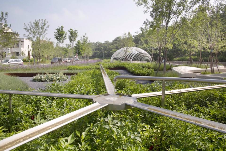 海星花田,池塘收集的雨水通過互動(dòng)提水裝置流經(jīng)水渠,為蔬菜提供灌溉