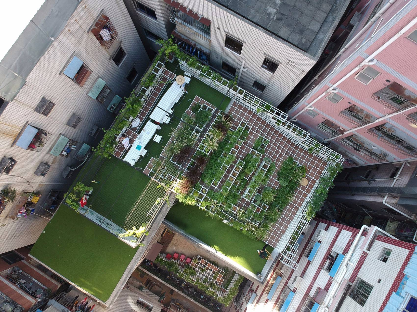 希望通過本次Urban Mountain的實施,能起到相應(yīng)的示范帶動作用,使得周邊的村民能真切的看到其成效,從而自發(fā)性地學(xué)習(xí)Urban Mountain營造,甚至復(fù)制至自家的屋面之上。當城中村內(nèi)一座又一座Urban Mountain被建造出來,Urban Mountain慢慢在城中村的上空交織在一起,最后在城中村的上空構(gòu)筑成一個充滿綠色與歡樂的新地表 — the Green Cloud。經(jīng)過多處的實地考察,團隊最終選定了深圳崗廈村的一處80年代建設(shè)的民房作為本次Urban Mountain(城中綠山)計劃的試驗場地,并確立了本次實踐嘗試計劃為“愚公計劃2.0”,由“現(xiàn)代愚公”為崗廈村搬來第?座Urban Mountain(城中綠山)?!坝薰媱?.0”自2017年11?27日開工,至2017年12月20日完工,歷時兩個月。