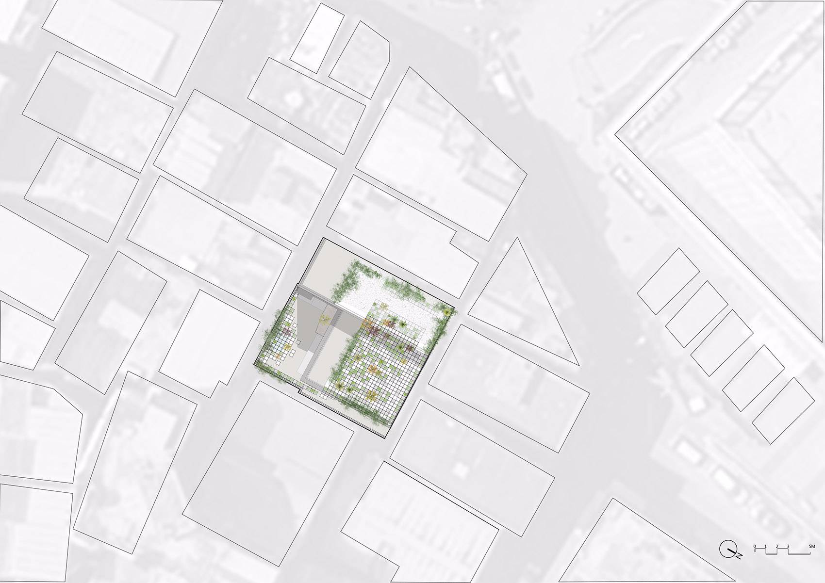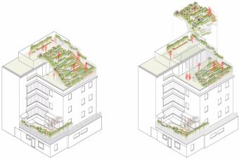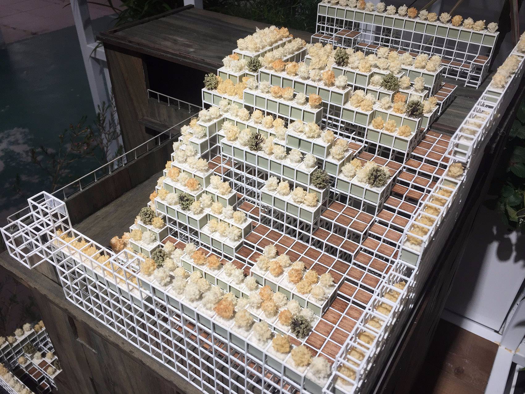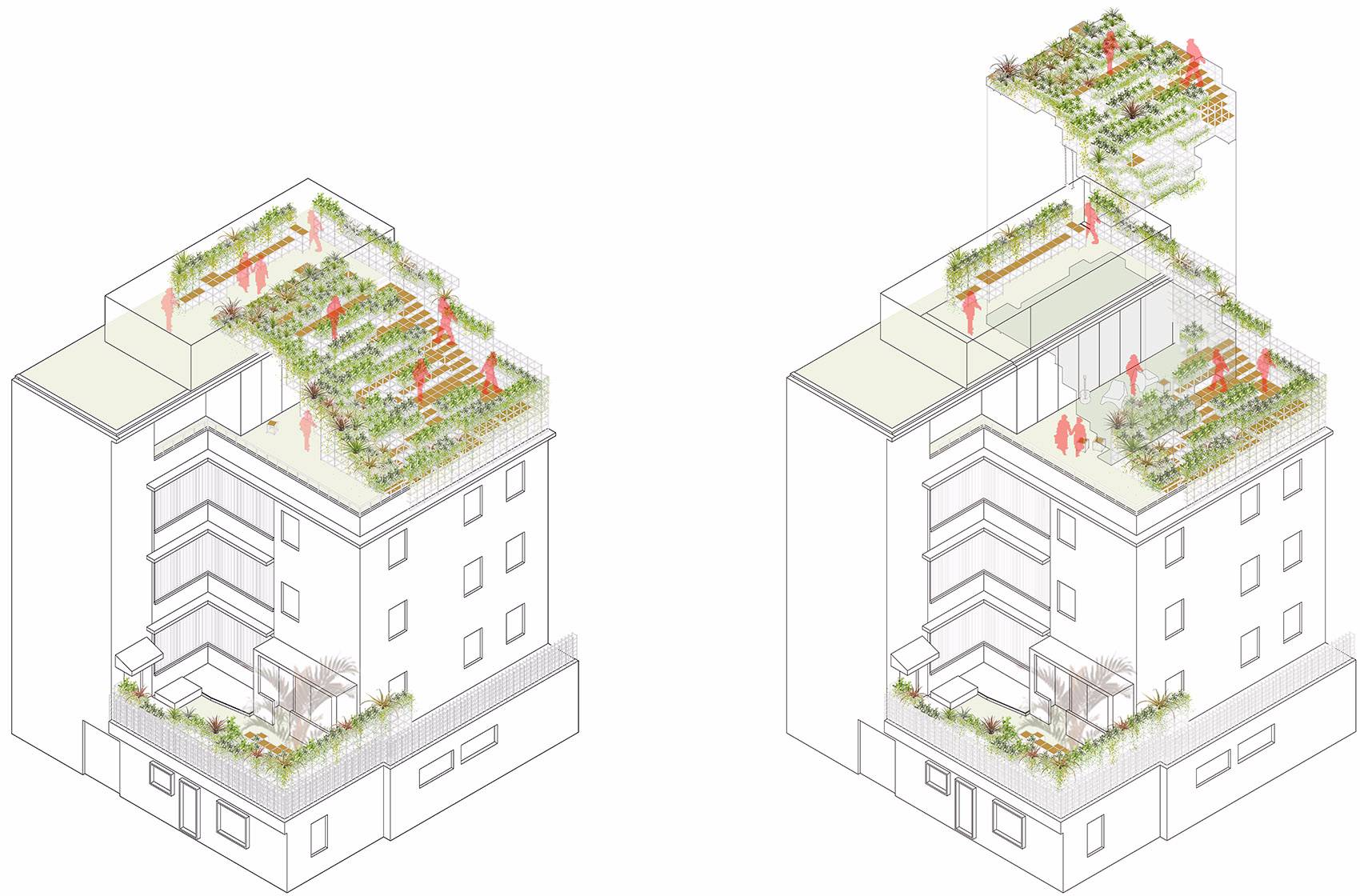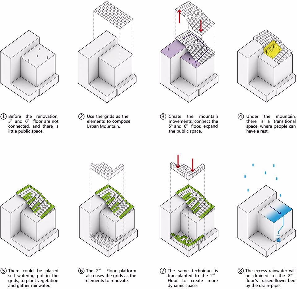 “愚公計劃2.0”主要手段為將場地內(nèi)尚未有效利用的屋面增厚,置入第二地表。第二地表用于涵養(yǎng)雨水,增添綠化(可作為蔬菜或景觀植物種植)。二維的地表依據(jù)各場地空間的特性在Z軸產(chǎn)?生變化,其下產(chǎn)生了可促進鄰里社交的亭、臺、樓、閣。其上則是可坐可行的“綠山”。