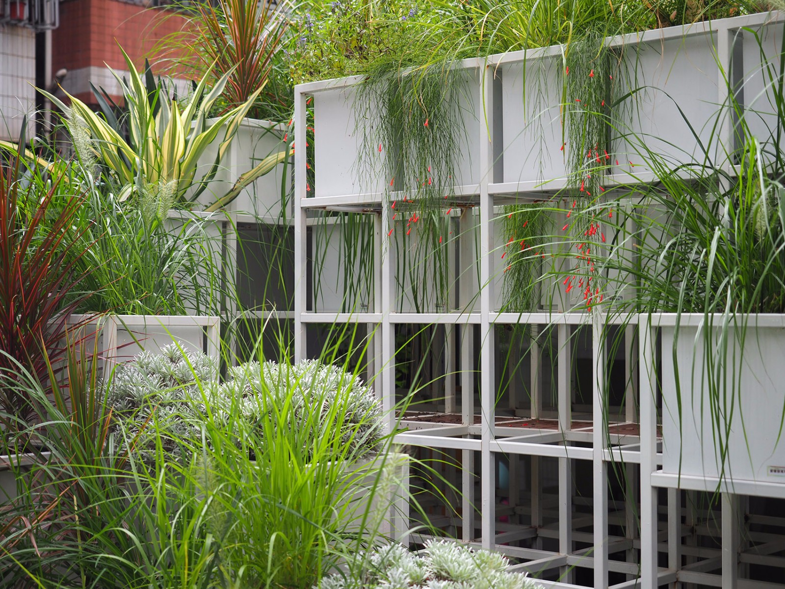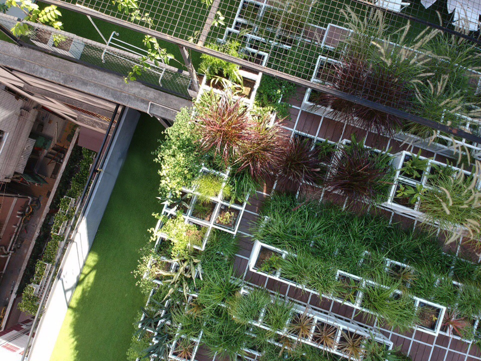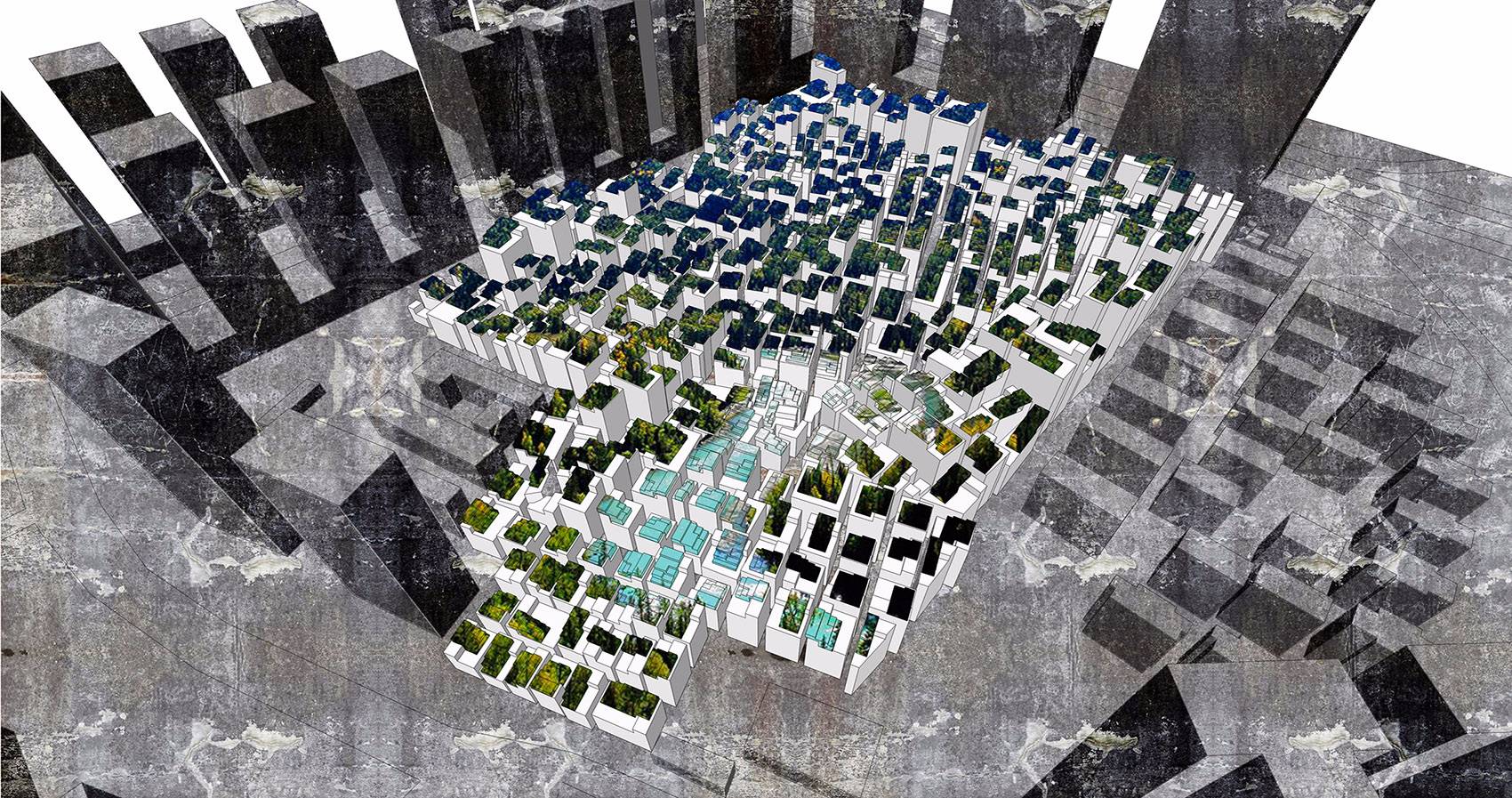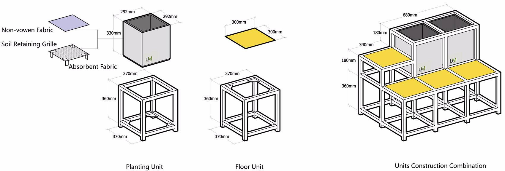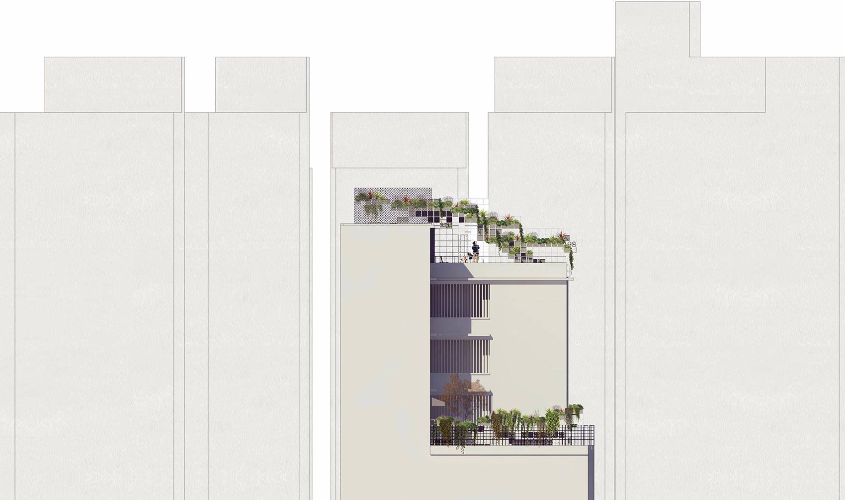 “愚公計劃2.0”主要手段為將場地內(nèi)尚未有效利用的屋面增厚,置入第二地表。第二地表用于涵養(yǎng)雨水,增添綠化(可作為蔬菜或景觀植物種植)。二維的地表依據(jù)各場地空間的特性在Z軸產(chǎn)?生變化,其下產(chǎn)生了可促進鄰里社交的亭、臺、樓、閣。其上則是可坐可行的“綠山”。