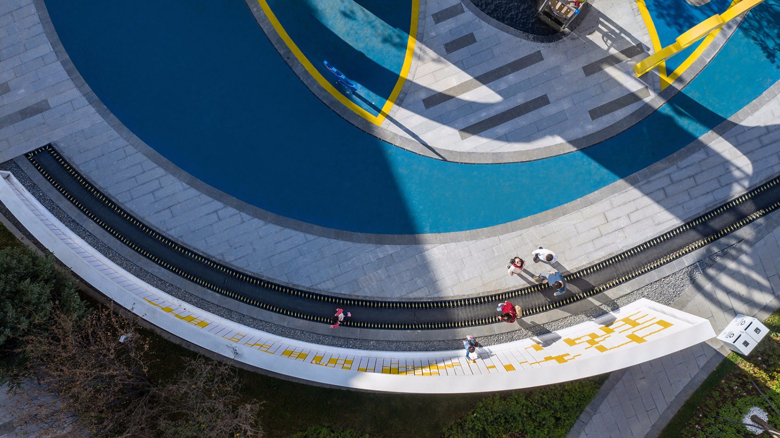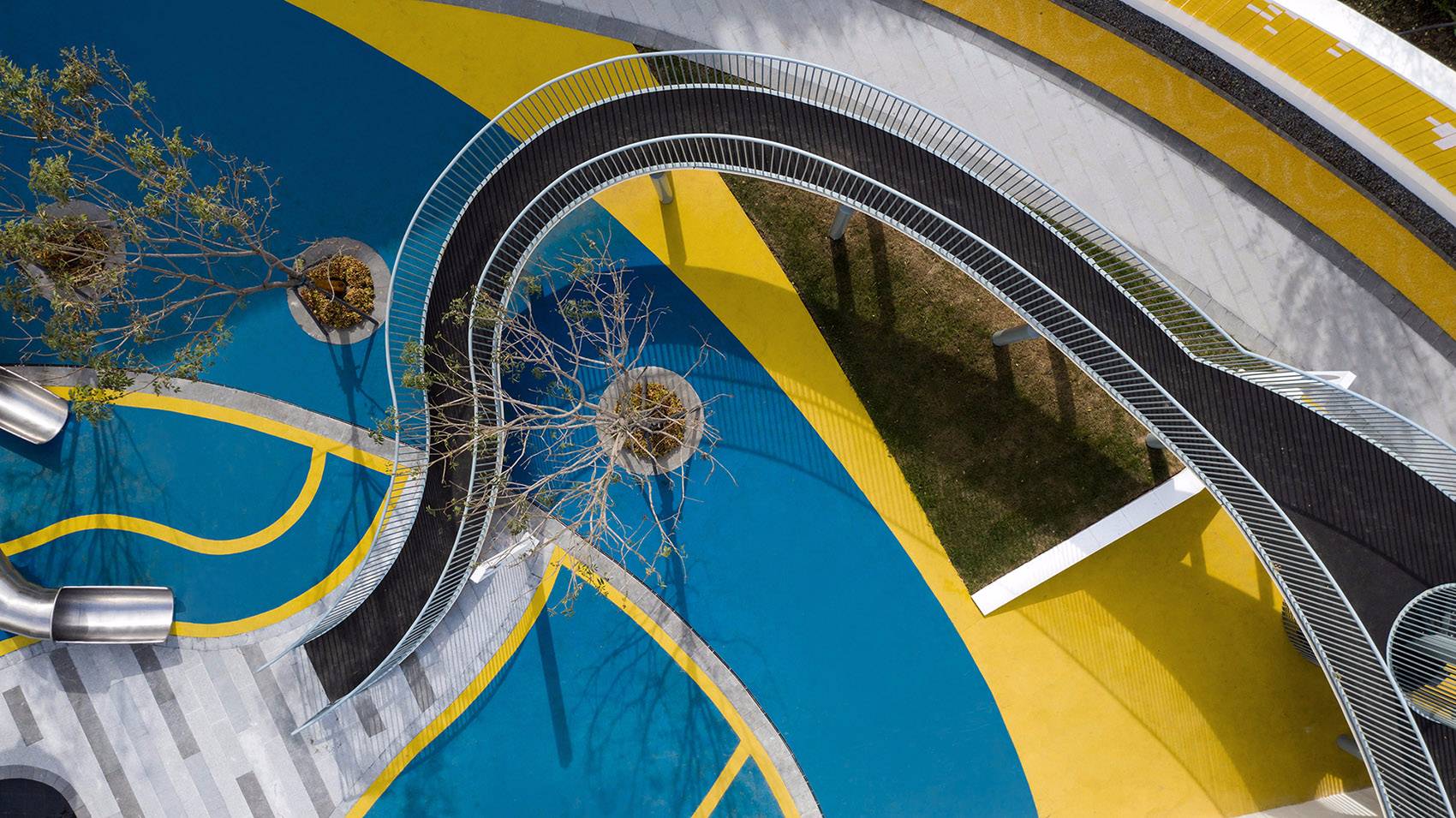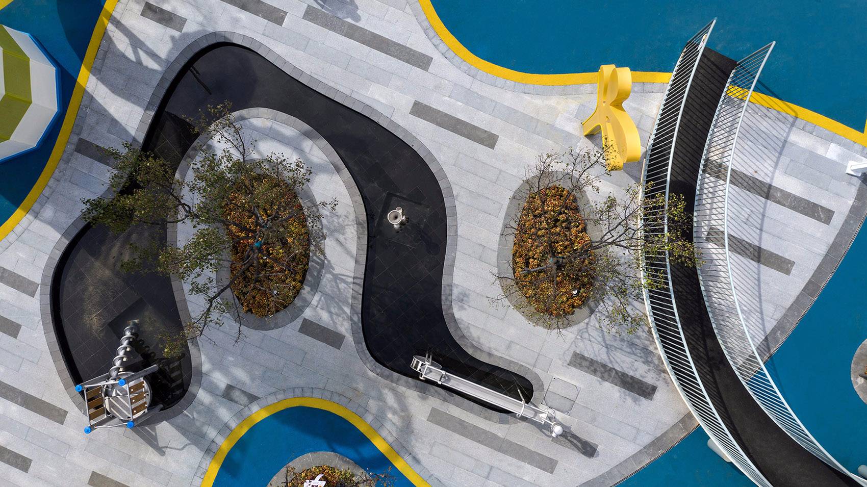 橢圓和自由曲線形成功能性的綜合場(chǎng)地。藍(lán)色與黃色的EPDM塑膠地墊拼貼組合,形成幾何化場(chǎng)地,容納安放趣味和想象。