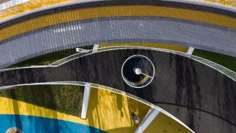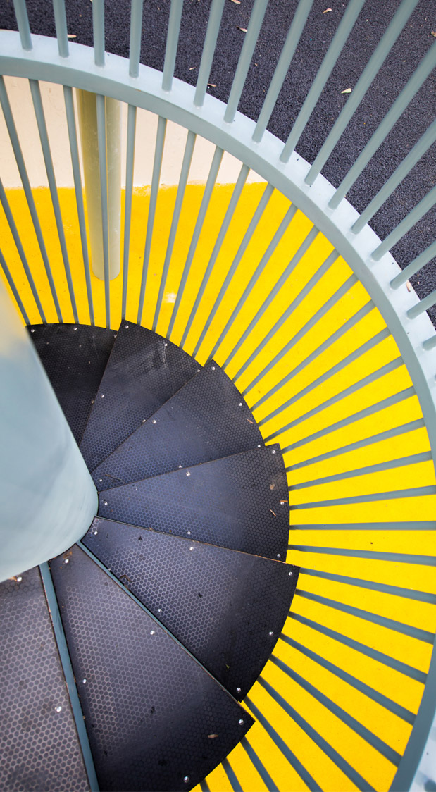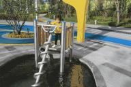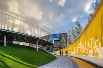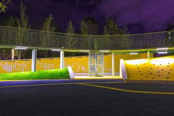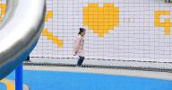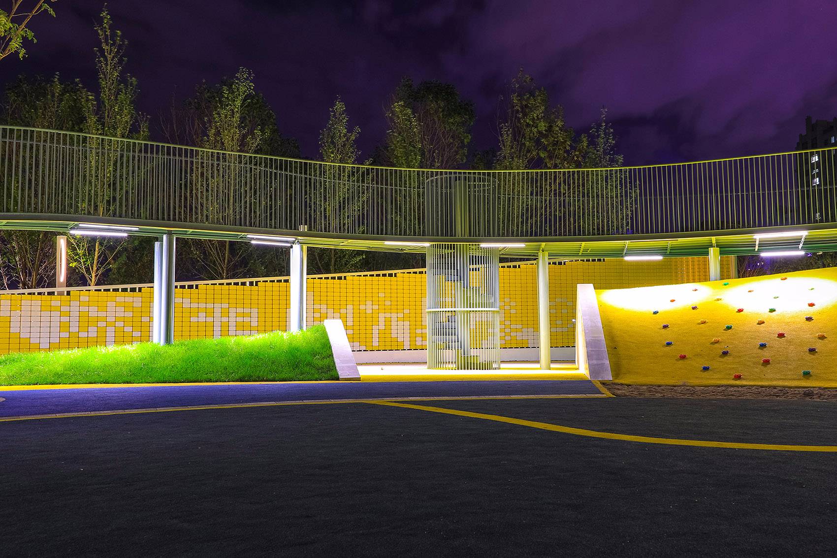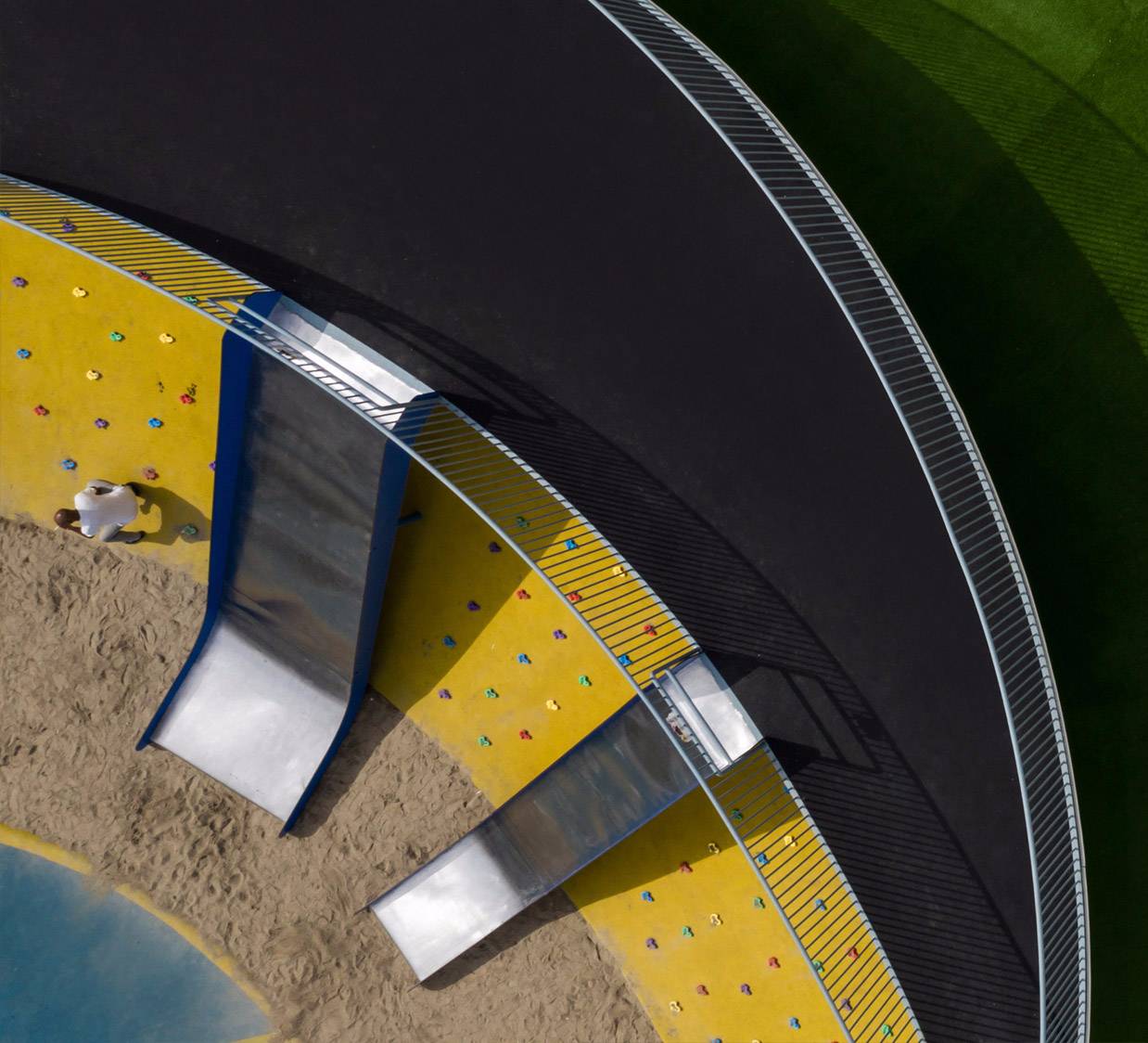 橢圓和自由曲線形成功能性的綜合場(chǎng)地。藍(lán)色與黃色的EPDM塑膠地墊拼貼組合,形成幾何化場(chǎng)地,容納安放趣味和想象。