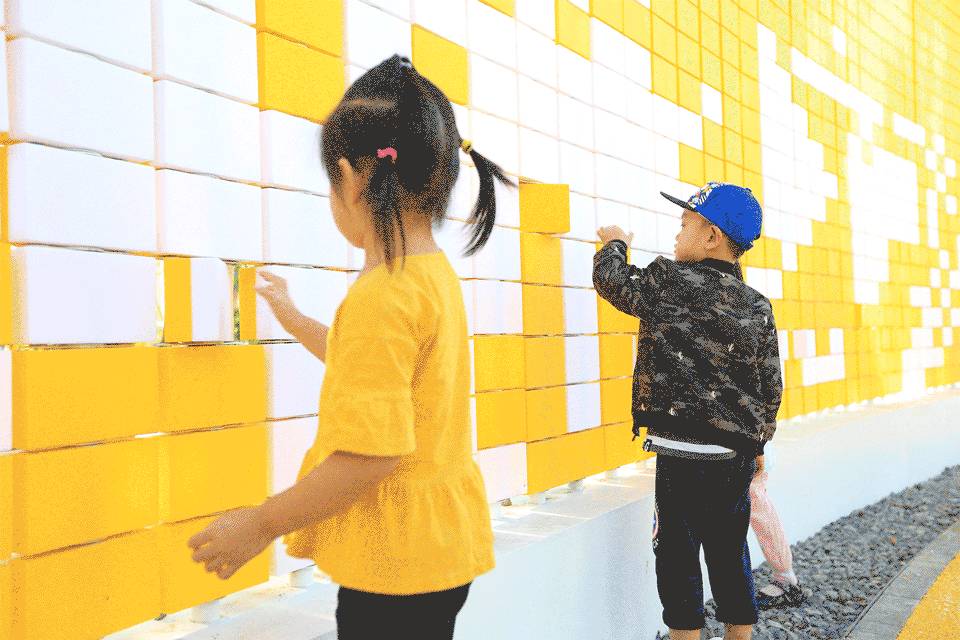 我們希望不僅僅放置一面阻擋視線的隔墻,而是采用翻板景墻的互動(dòng)方式,激活場(chǎng)地邊緣活力,鼓勵(lì)大家在此游戲、涂鴉與創(chuàng)作。