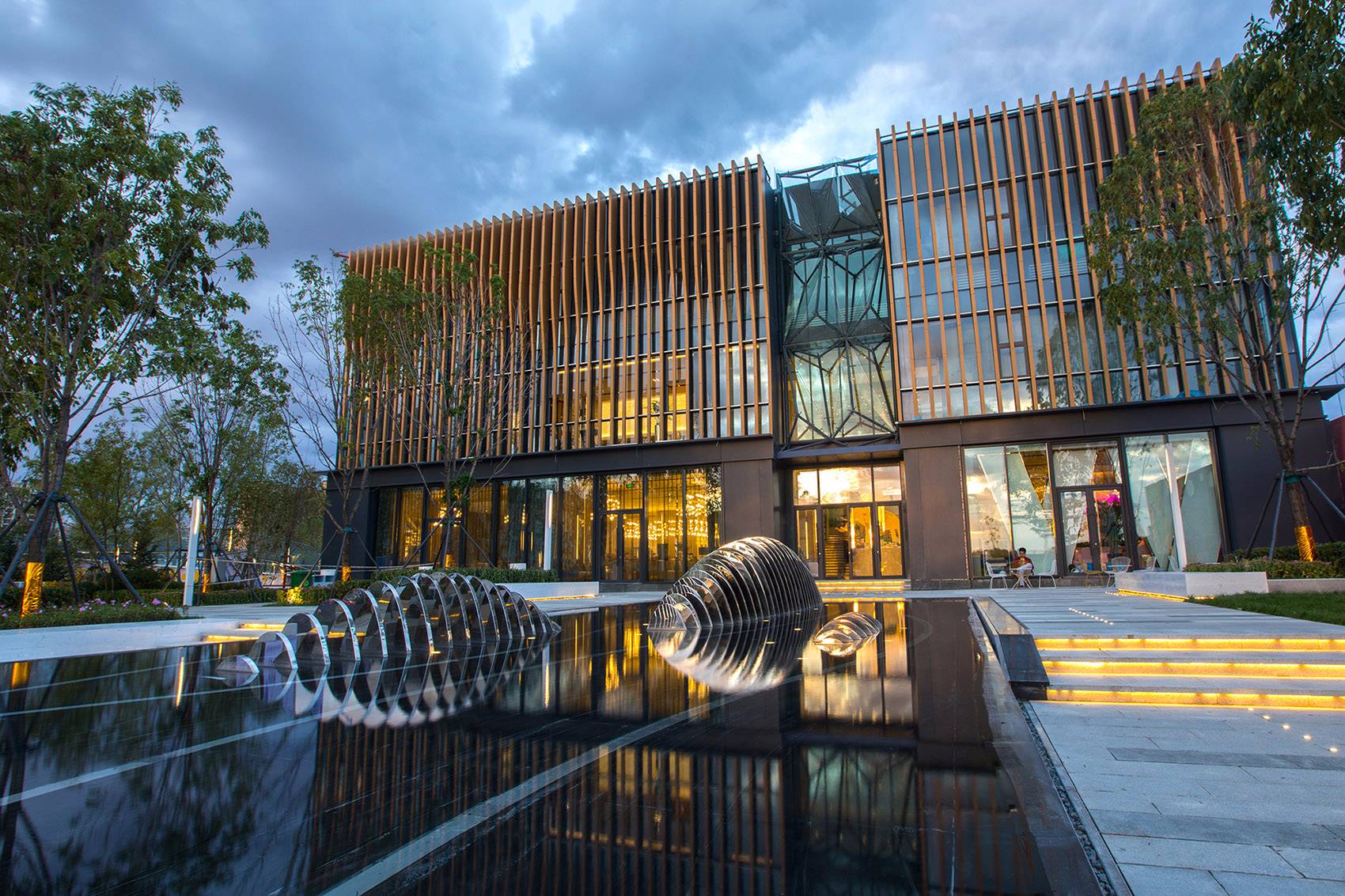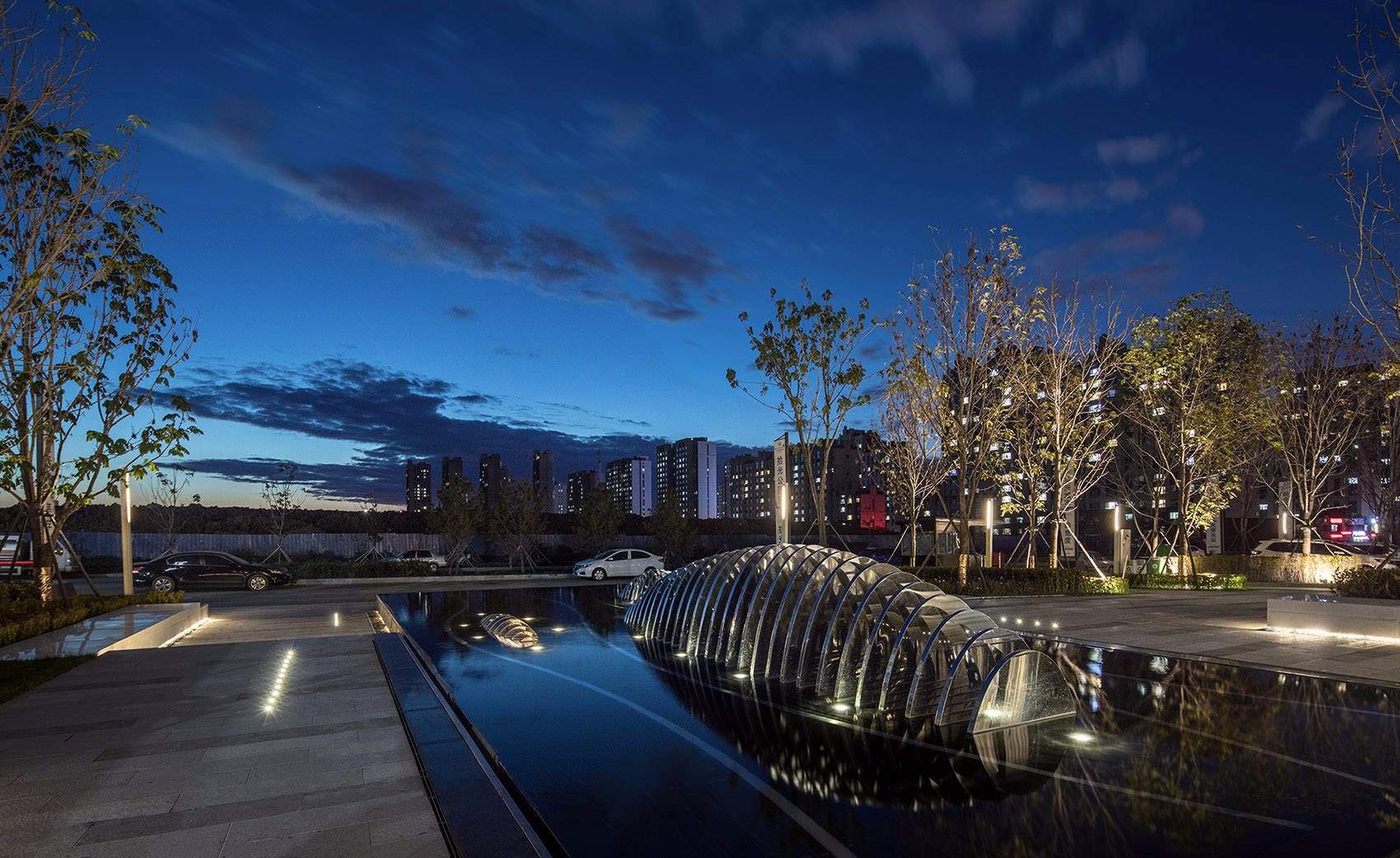 銷售中心前的“鯨群”雕塑,巧妙展現(xiàn)出“鯨奇谷地”的不同意趣。夏季水池蓄滿,鏡面水景反射出群魚的躍動(dòng),冬季水落石出,層層階梯顯露出對(duì)山林谷地的回應(yīng)。
