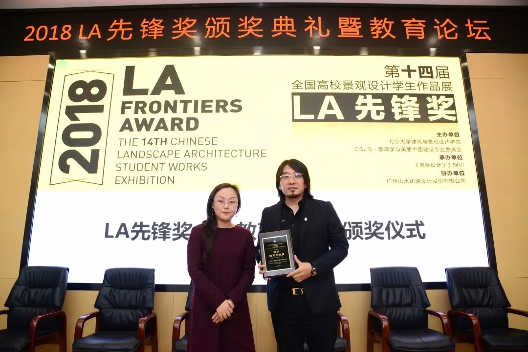 同時(shí),山水比德董事長兼首席設(shè)計(jì)師孫虎代表本次LA先鋒獎(jiǎng)的獨(dú)家支持贊助公司——山水比德,接受了主辦方頒發(fā)的“企業(yè)教育貢獻(xiàn)獎(jiǎng)”。