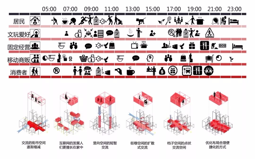 精選點(diǎn)評(píng):充滿人文關(guān)懷的項(xiàng)目。在老街區(qū)的街道空間內(nèi)與周邊建筑物結(jié)合,以微笑的動(dòng)作、少量的資源消耗形成豐富的、彈性可變的人文小商業(yè)氛圍,活化了街道、為小商販群體提供了機(jī)會(huì)、形成了特色的人文空間。整體邏輯清晰,圖紙序列明了,表達(dá)到位。對(duì)部分建筑物現(xiàn)狀的分析有缺失。