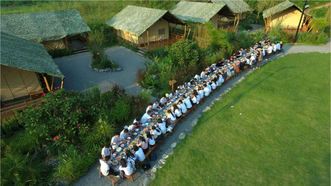 ●變業(yè)態(tài)為內(nèi)容玩法,把異客共享空間變成內(nèi)容運營,進行一些社交的旅游村,實現(xiàn)心靈的歸屬感,從而實現(xiàn)變現(xiàn)。怡境在清遠黃花鎮(zhèn)的營地項目中,做了社群活動定制,長桌宴等活動擴大了消費的范圍,使消費變現(xiàn)能力增強,并增加二消能力。