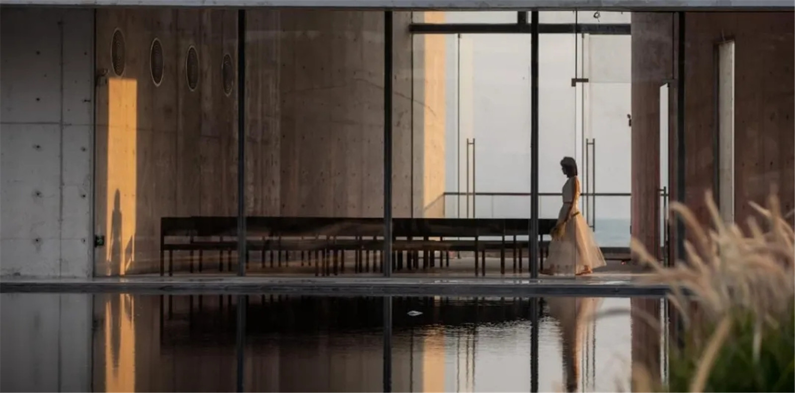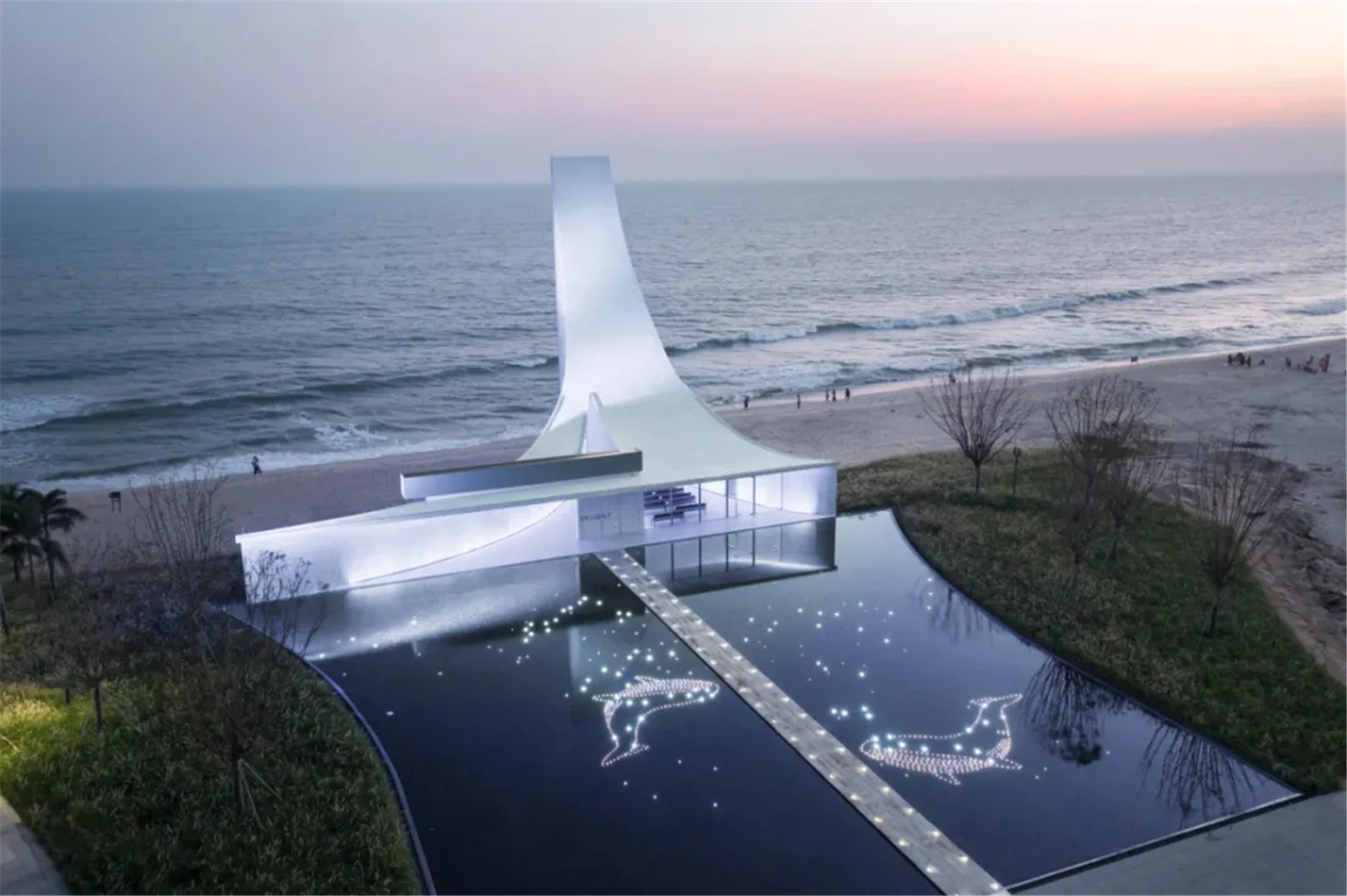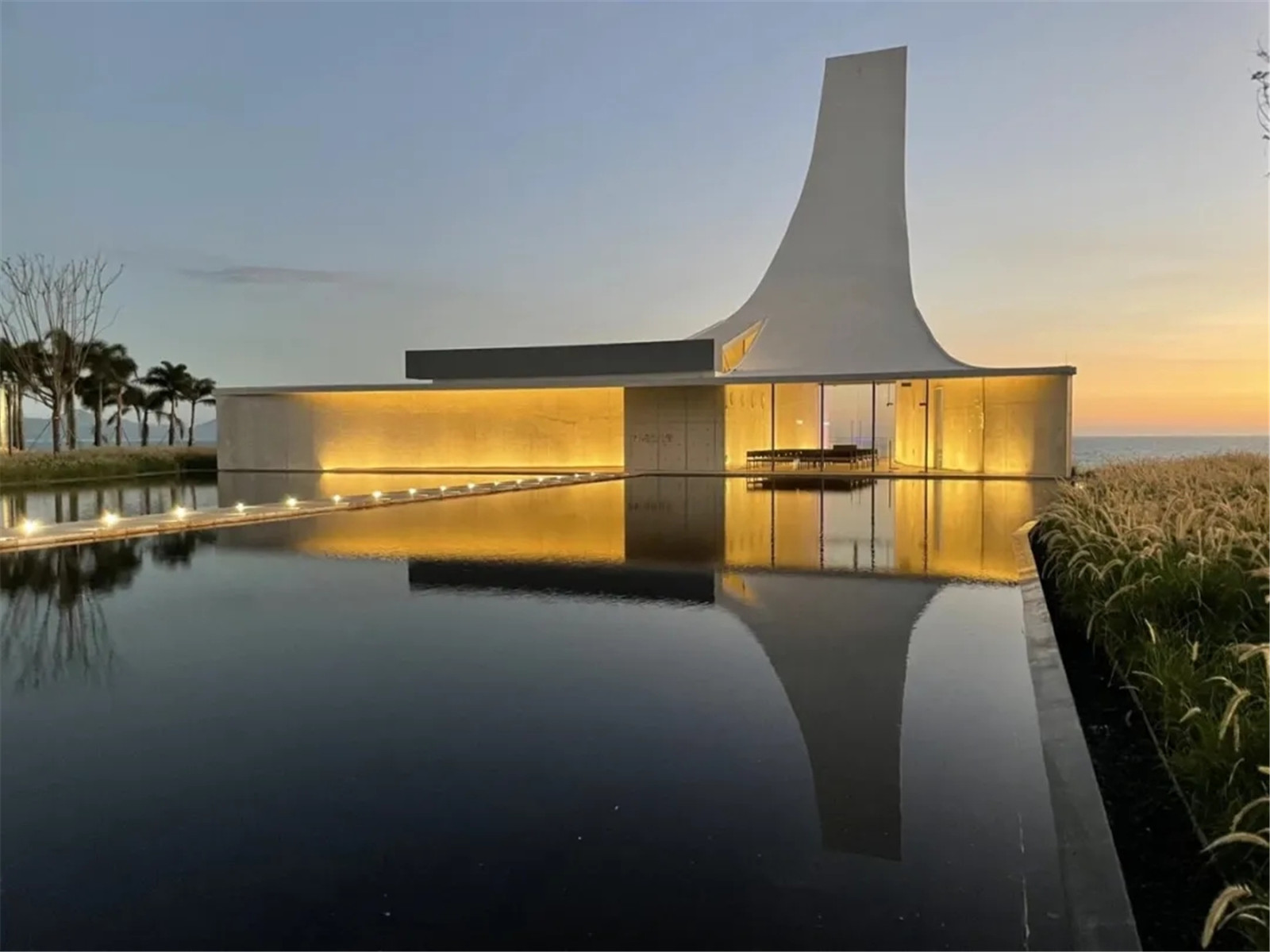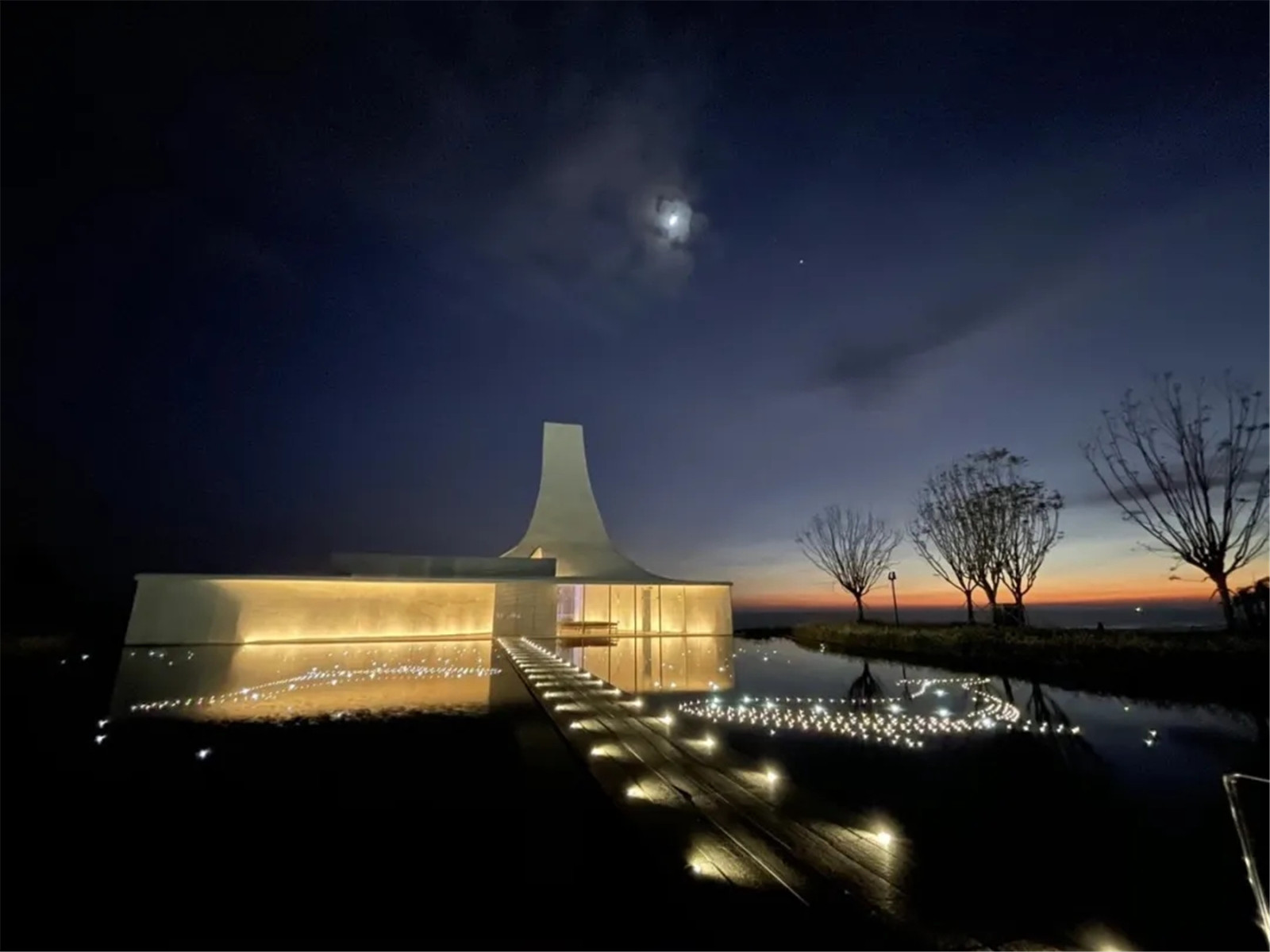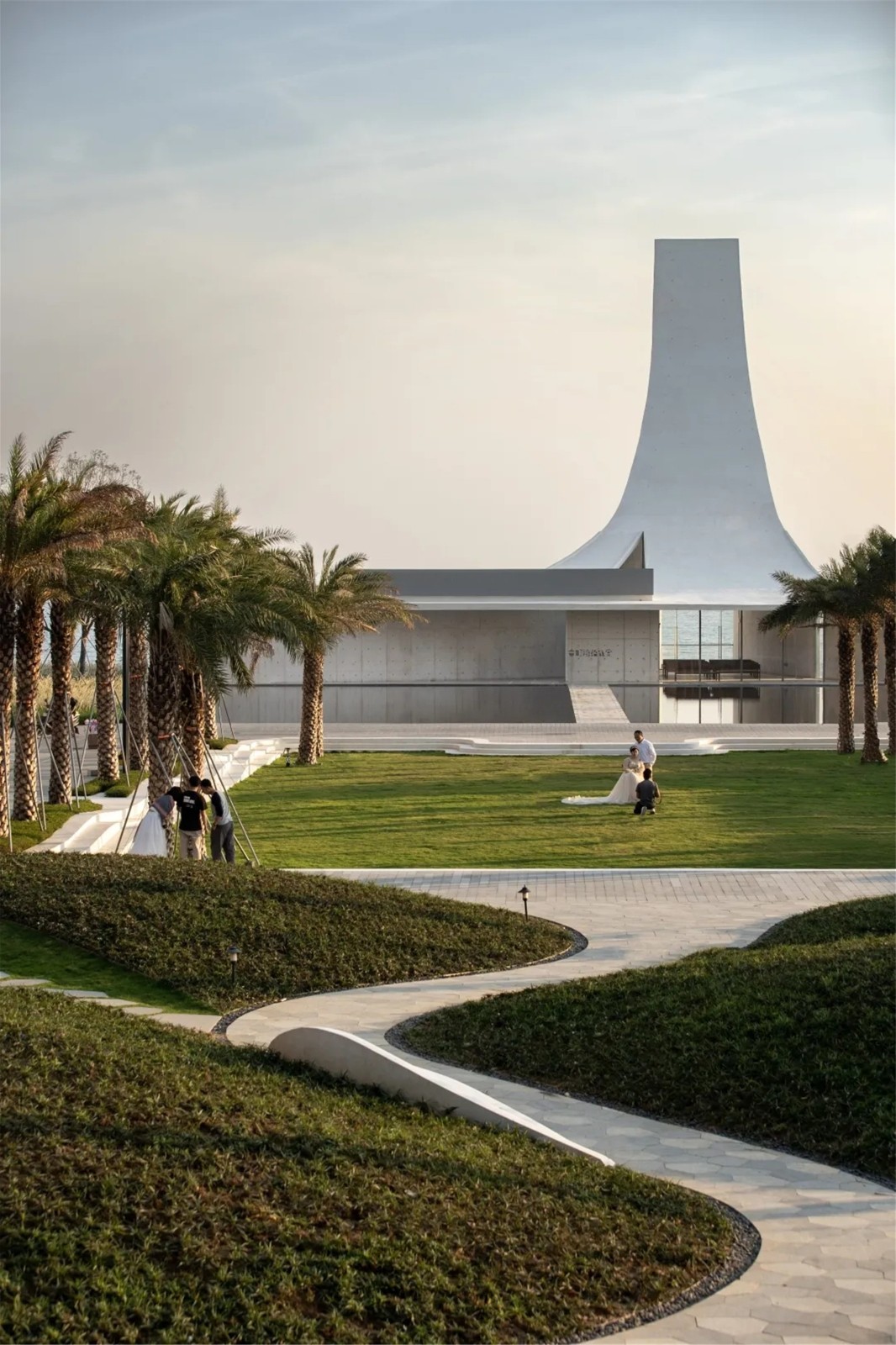 ▲風(fēng)帆禮堂:簡約流暢的線條、自然質(zhì)樸的立面,如此純粹的建筑結(jié)合對(duì)稱布局的鏡面湖水、 星光投影、軸線步道以及景觀草海,在光影變幻中,營造浪漫典雅的婚慶游覽體驗(yàn)區(qū)。