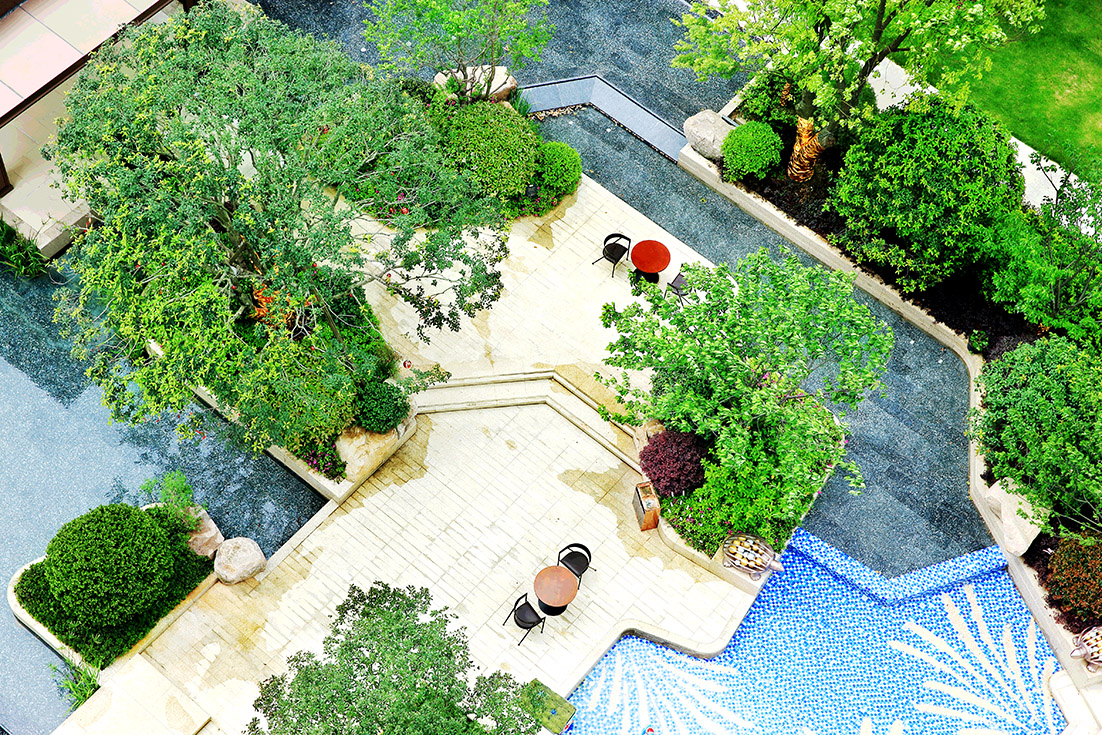 在有限的場地里,上層覆蓋綠化,下層活動空間,居民俯視像潘多拉魔幻的盒子,打開了鑲嵌水晶的藍寶石把全景的熱帶度假酒店水院帶回家!