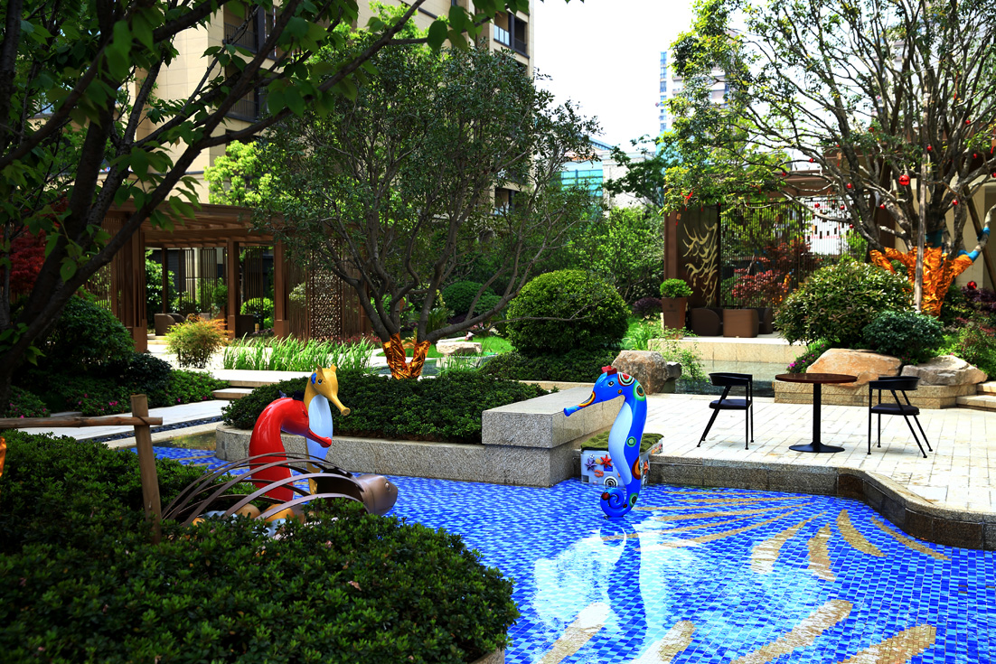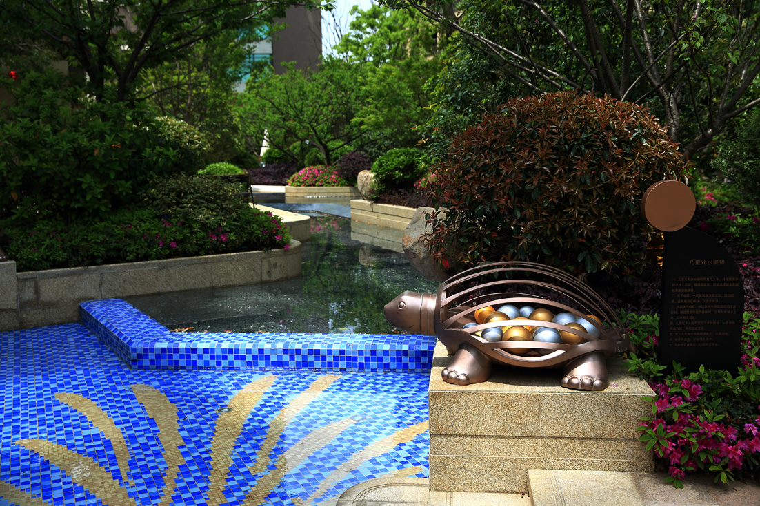 ▲ 精致的噴水小品環(huán)繞著戲水池