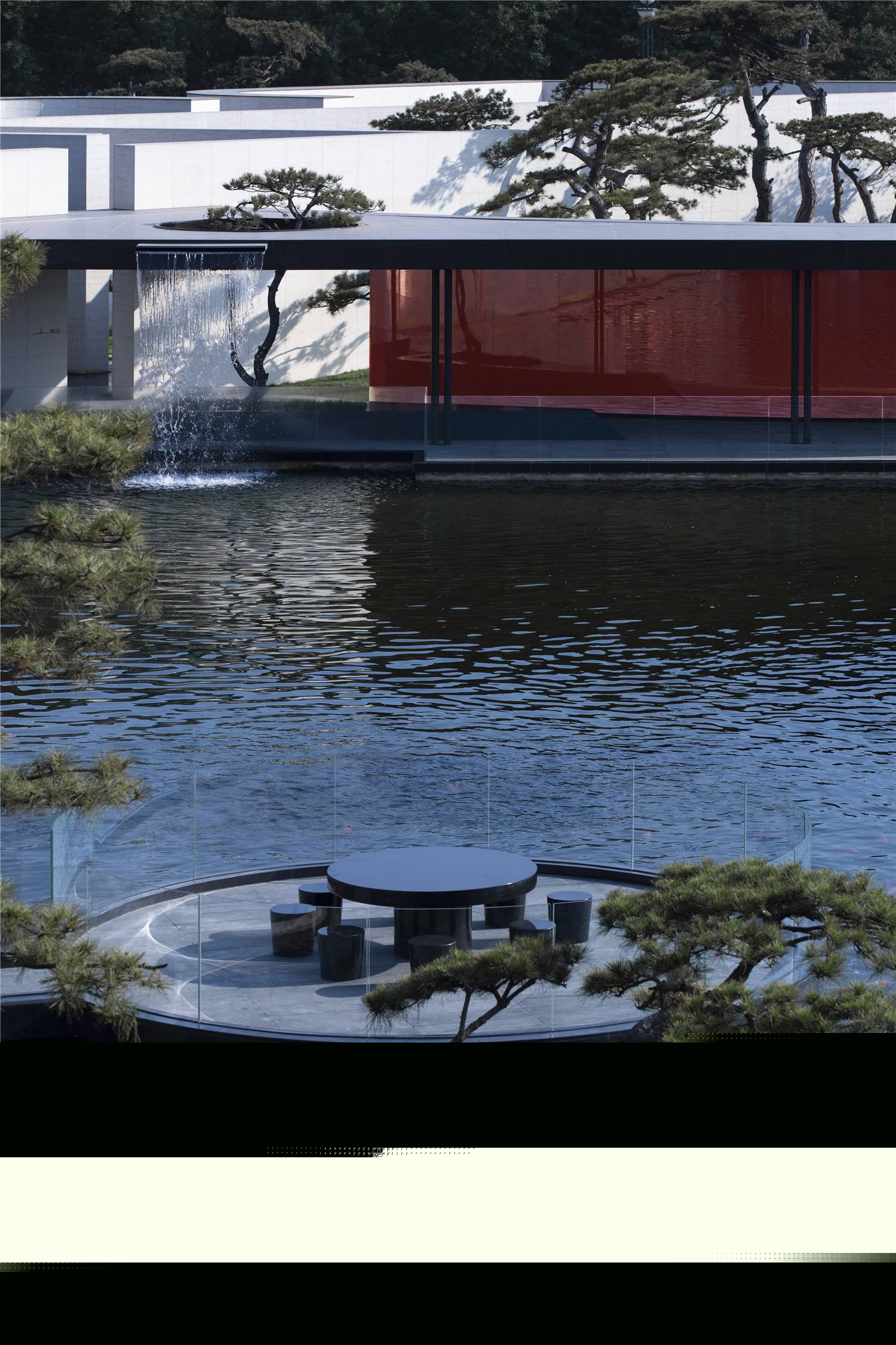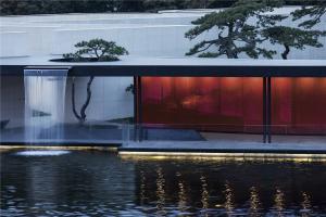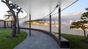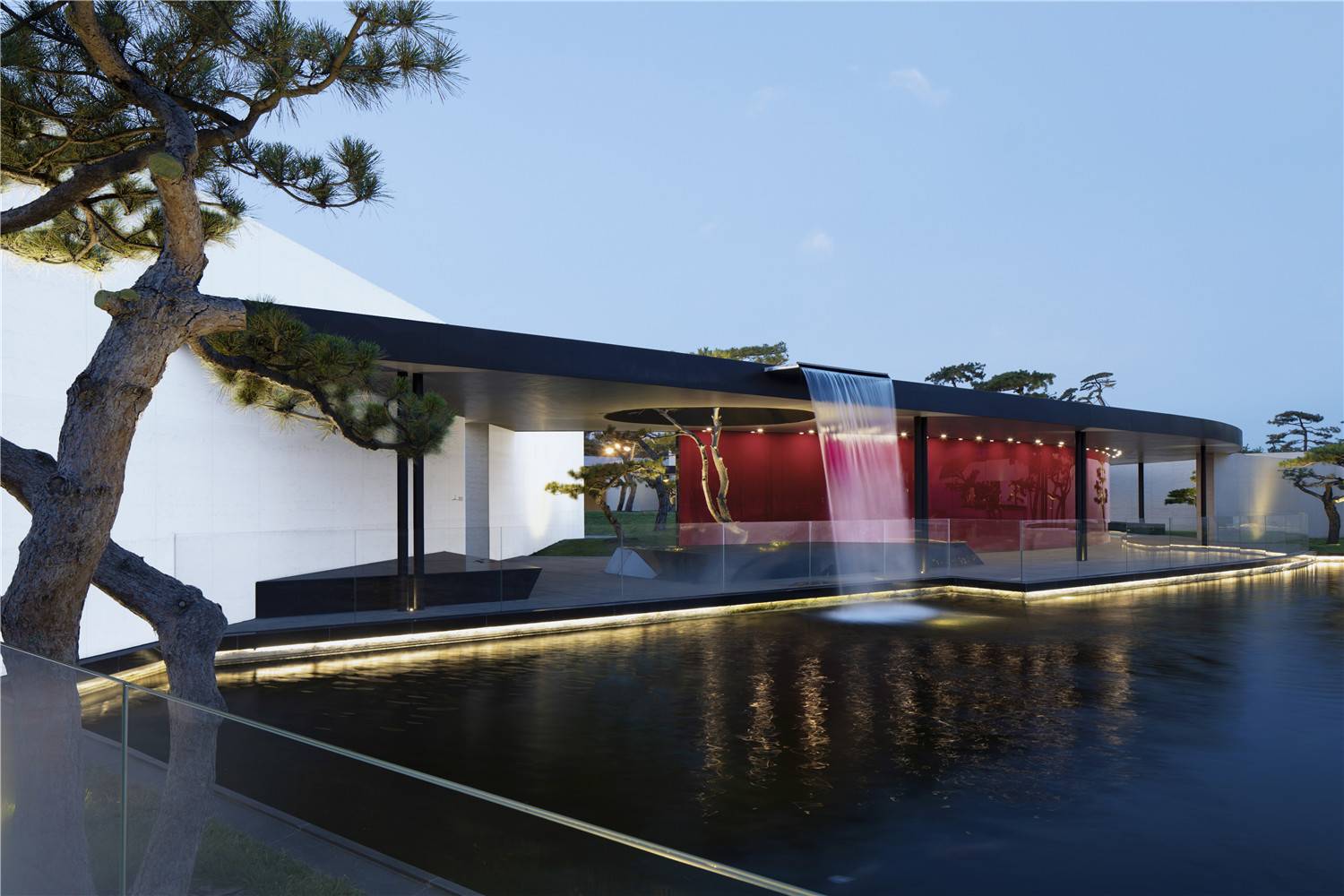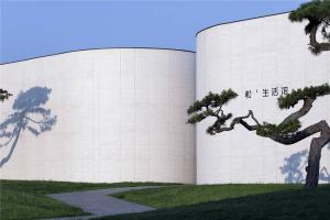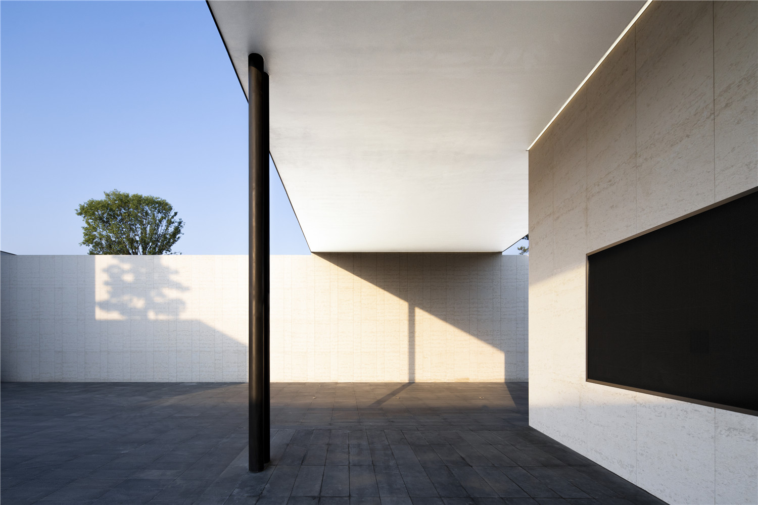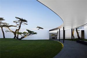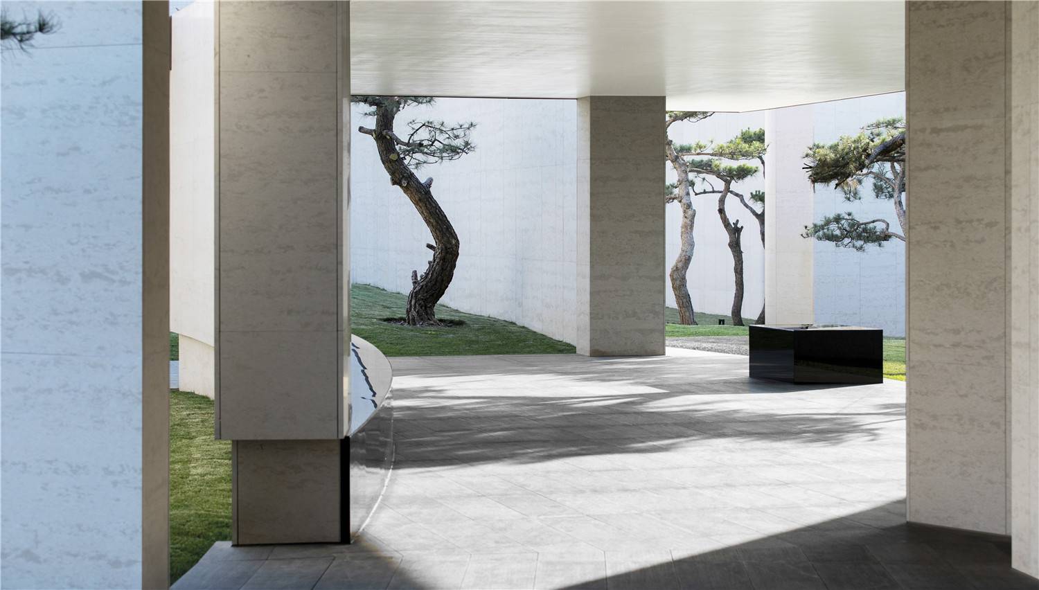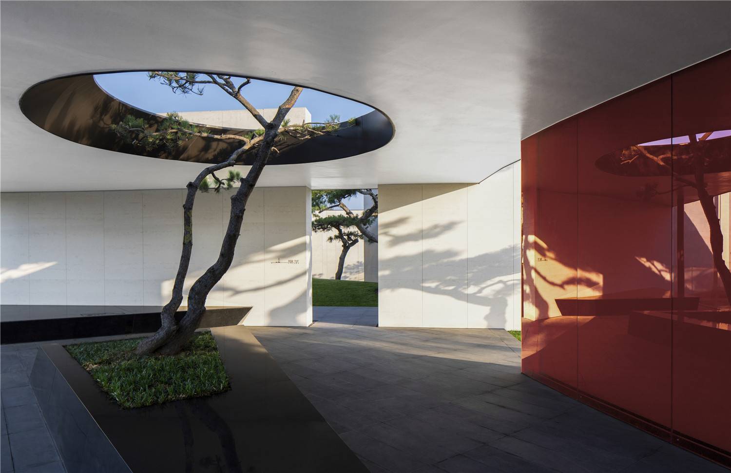 入口處,意象化的體塊構(gòu)成,一反門樓的常態(tài),再現(xiàn)了匡廬圖的北方山勢之巍峨,綴之以松,延枝迎賓,在光影斑駁的背后,一副深遠(yuǎn)不盡的藏奧之感,使人欲窮其中。
