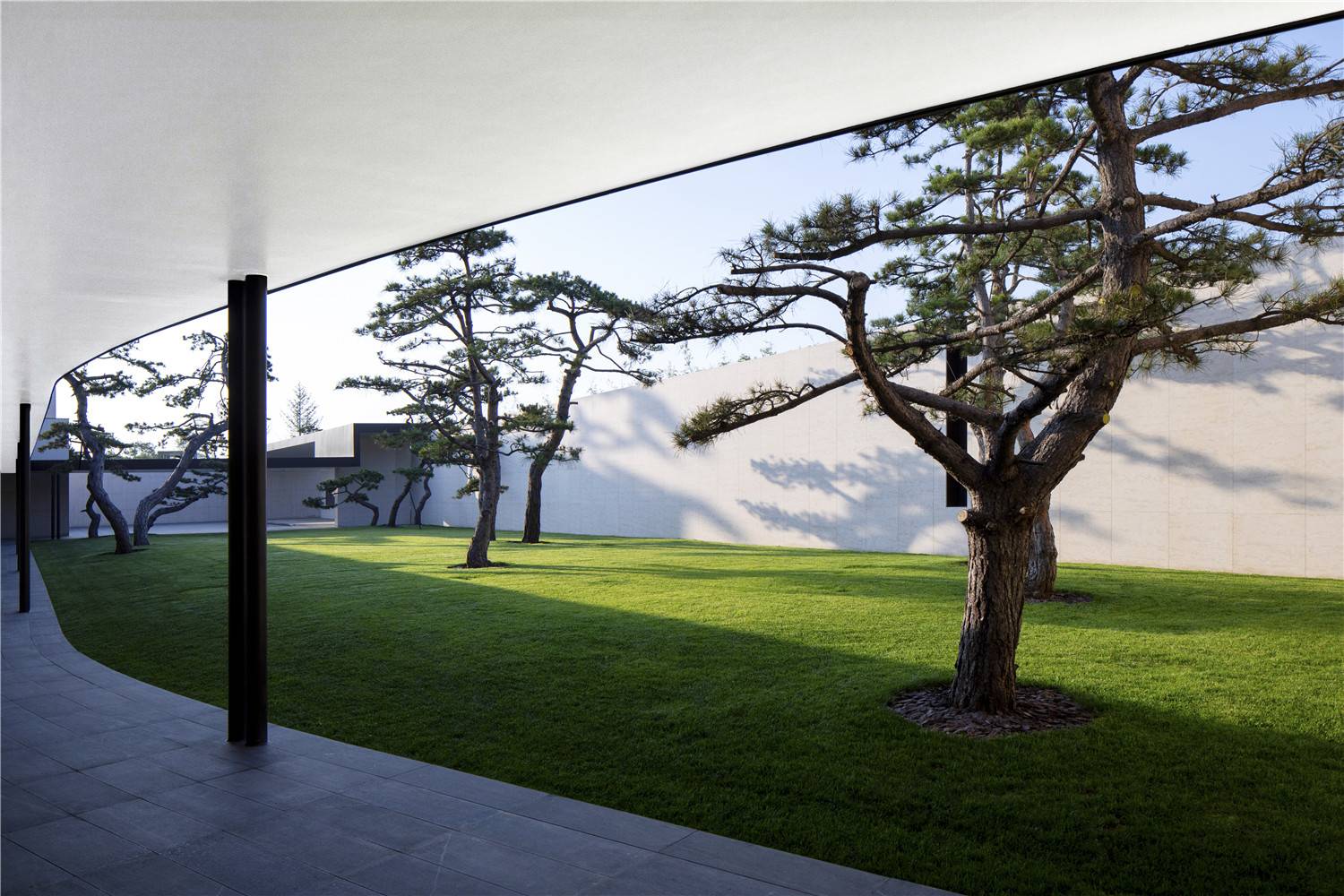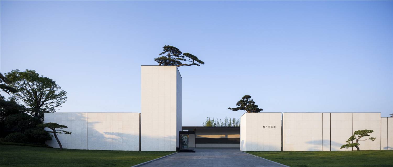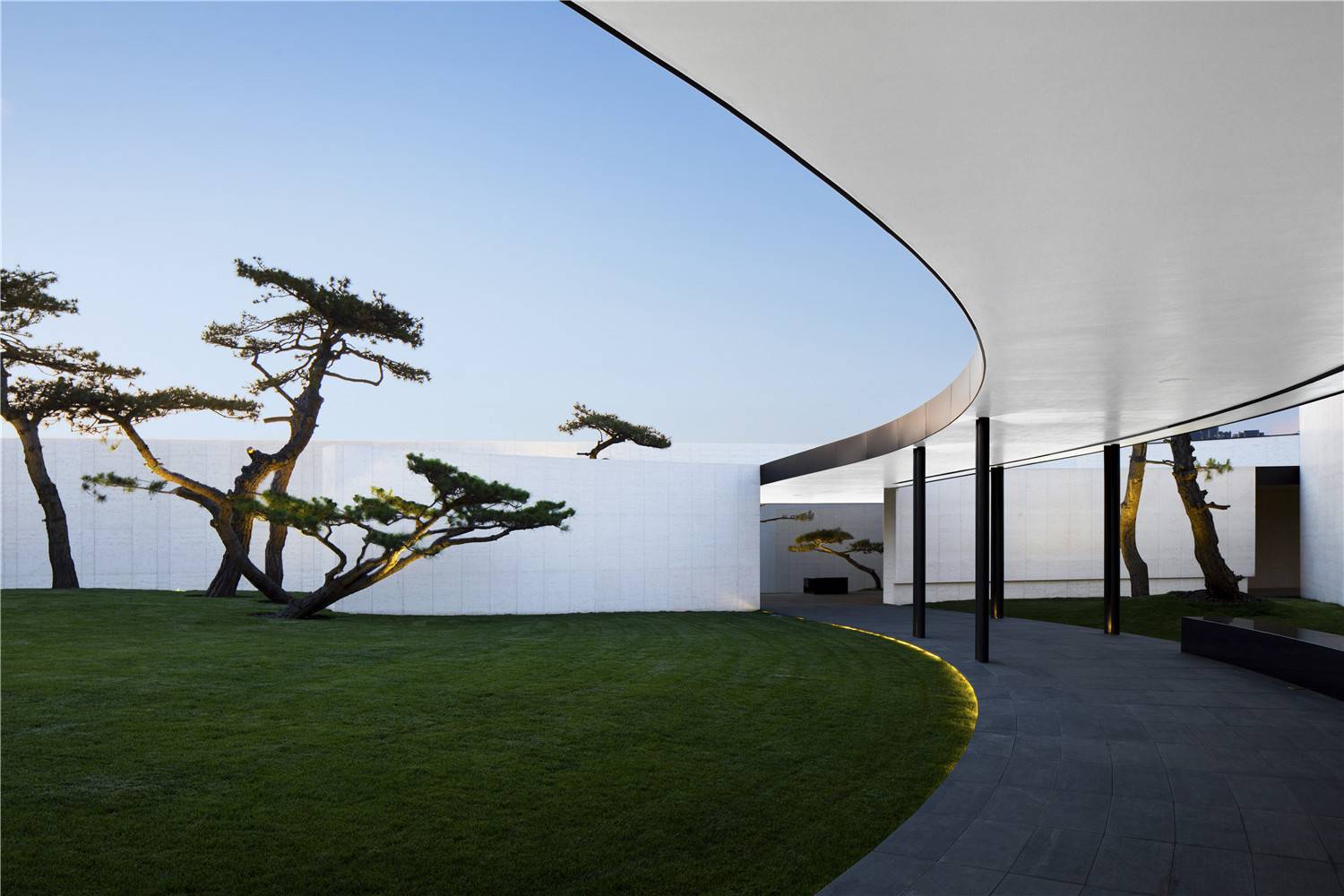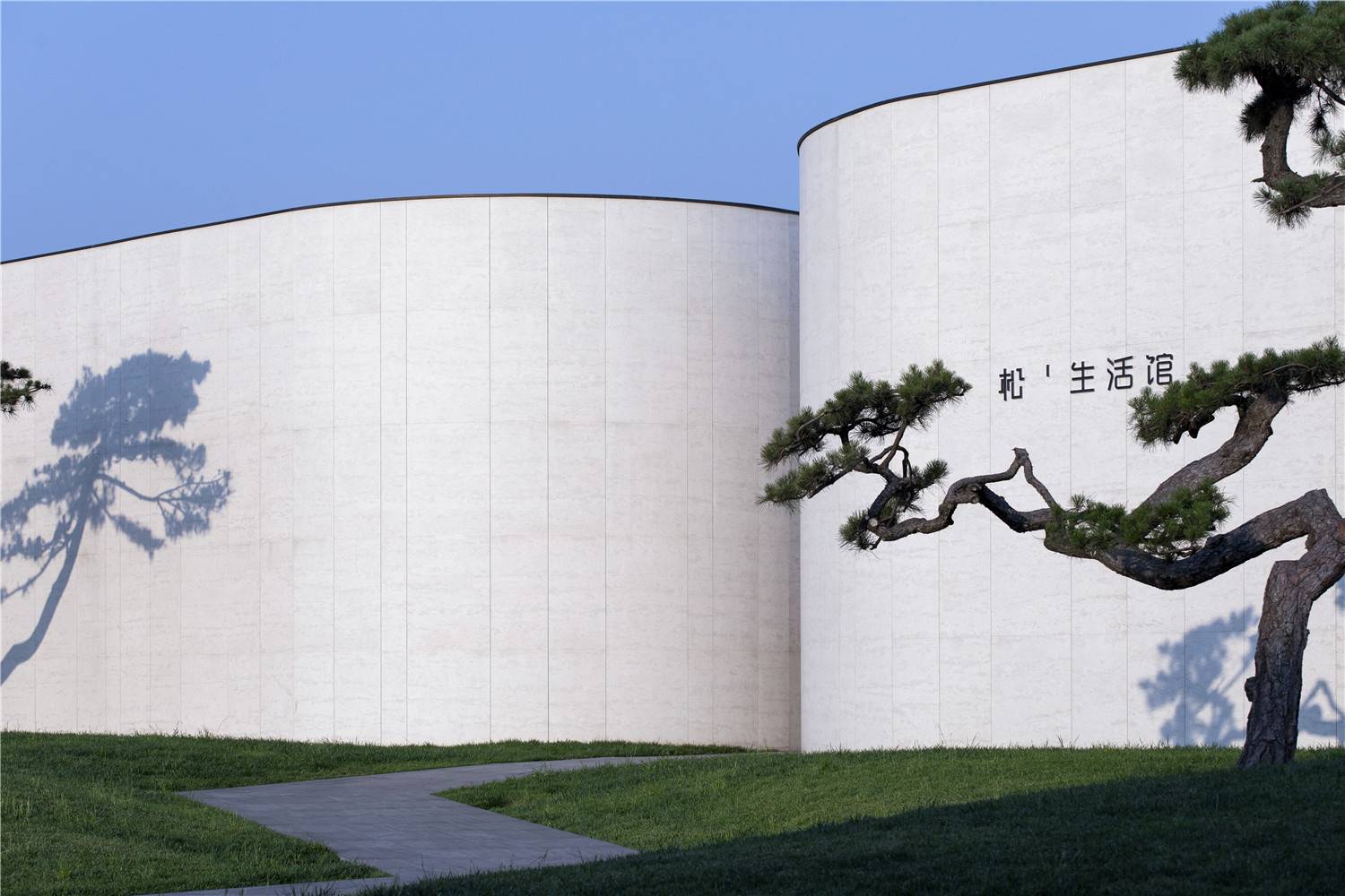 向心的花園,形勝而幾何。一動一靜,一方一弧 ,一線一面,白墻翠玉,正如藝術(shù)收納的容器,廊影之下,松影舞動,松生活館,通過翠松形成“生活”的空間動線,生活意趣巧妙地串聯(lián)于此。
