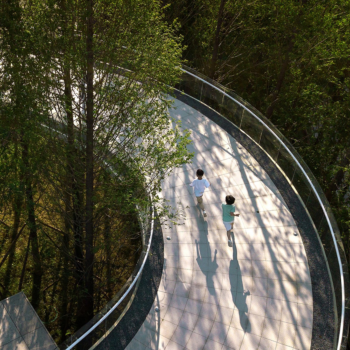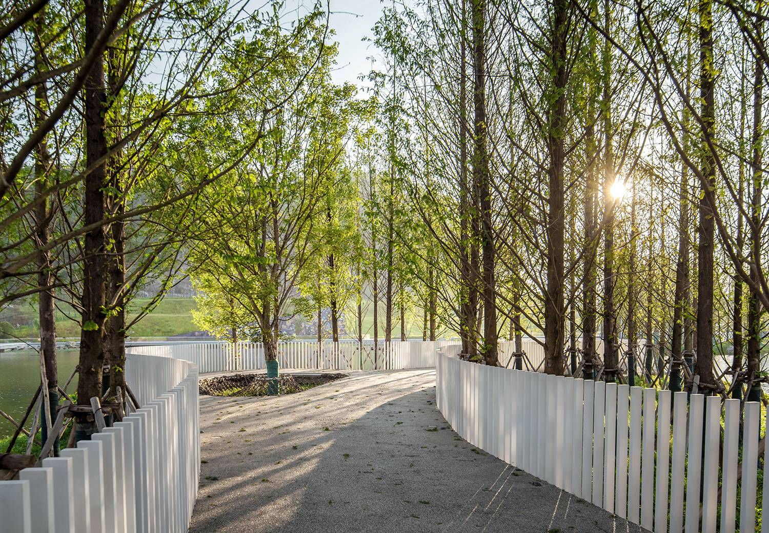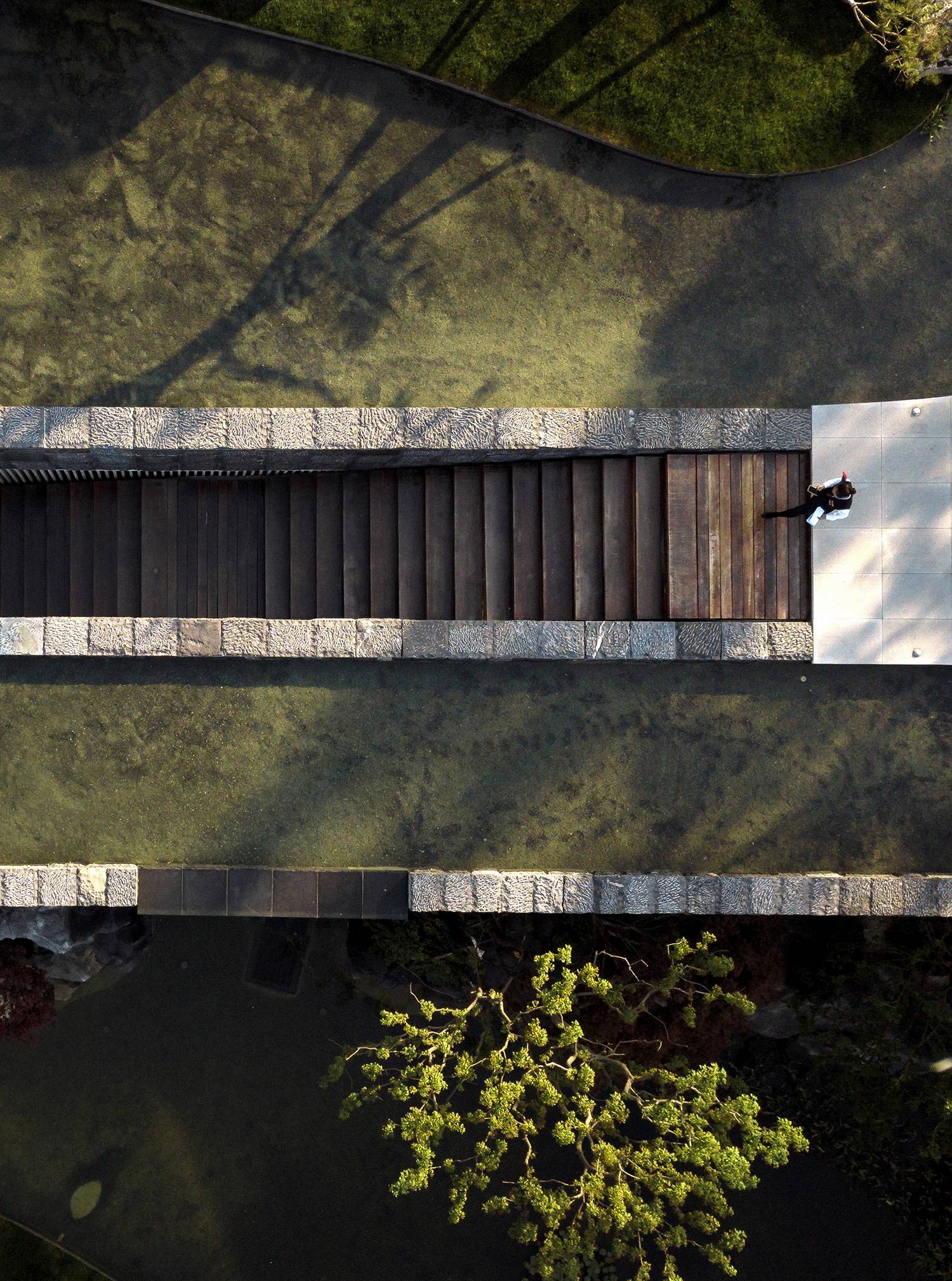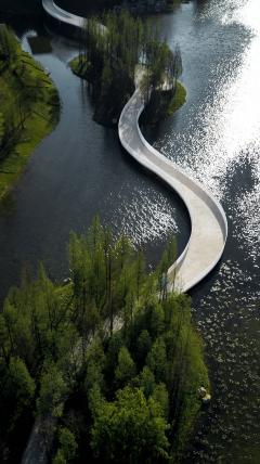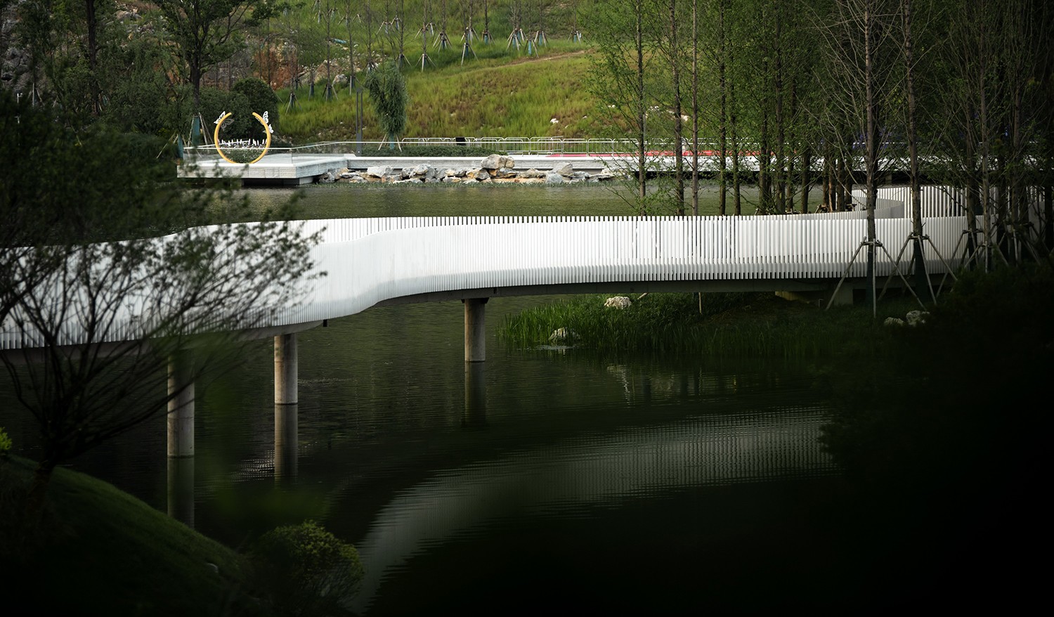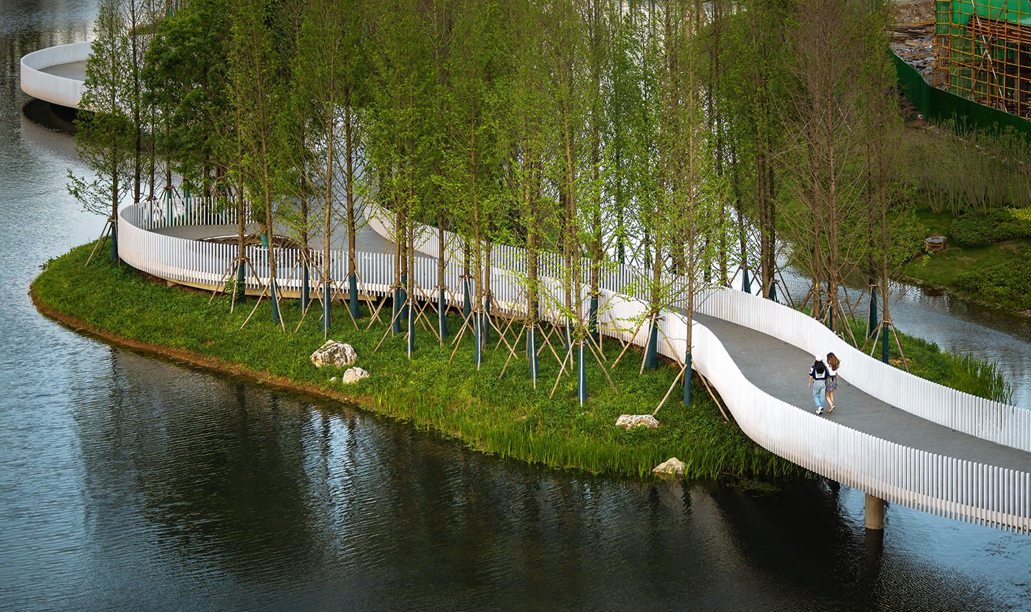 婉轉(zhuǎn)綿延的橋飄浮在湖面,使長橋、湖光與綠島共同生長,建筑、景觀與場地相輔相成。它不僅連接著兩岸,還連接著兩岸的人,連接著人與故鄉(xiāng)。