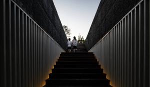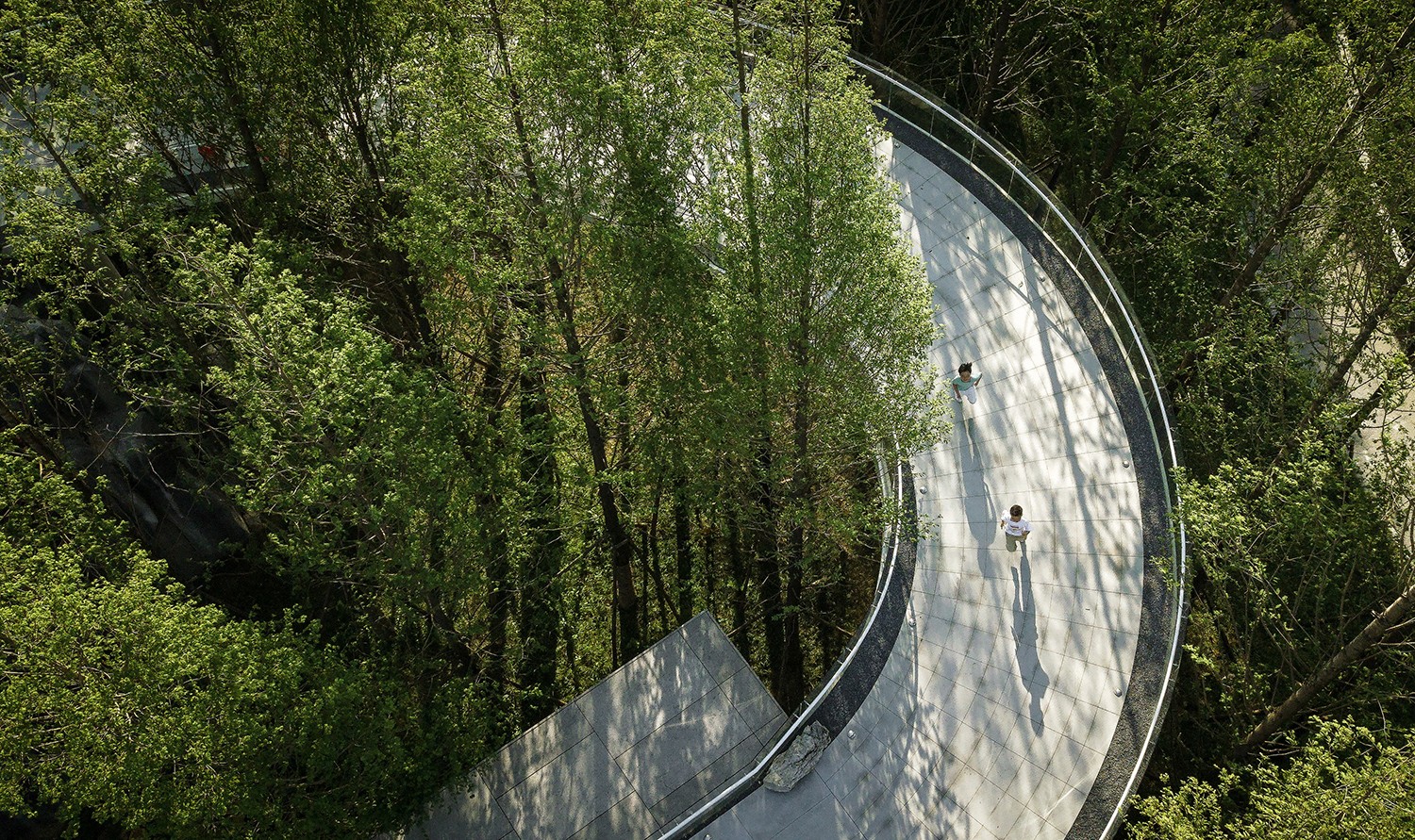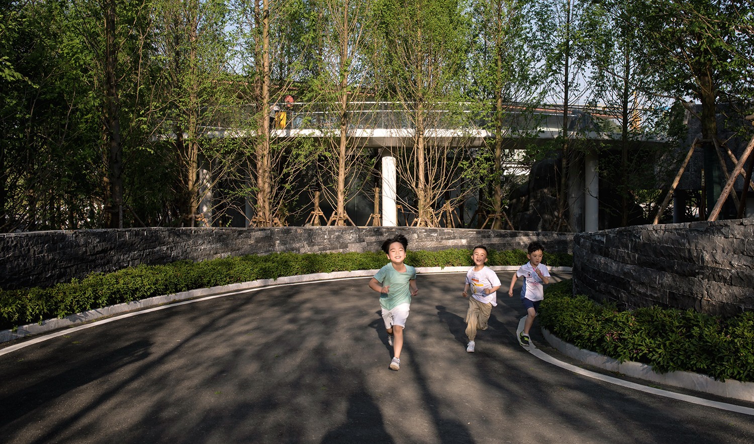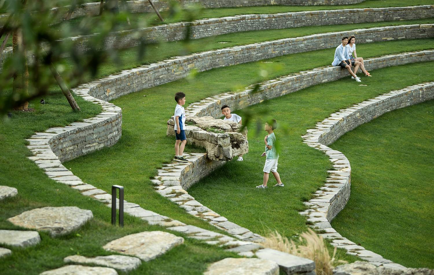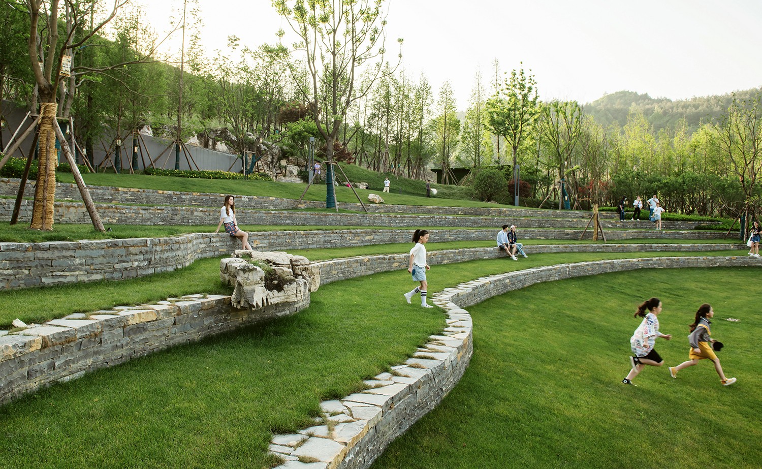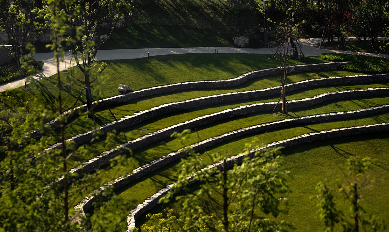In the landscape theater there are outdoor grass terraces to connect people with the surroundings and remind people of beautiful memories.