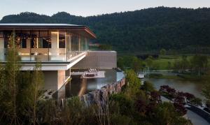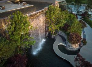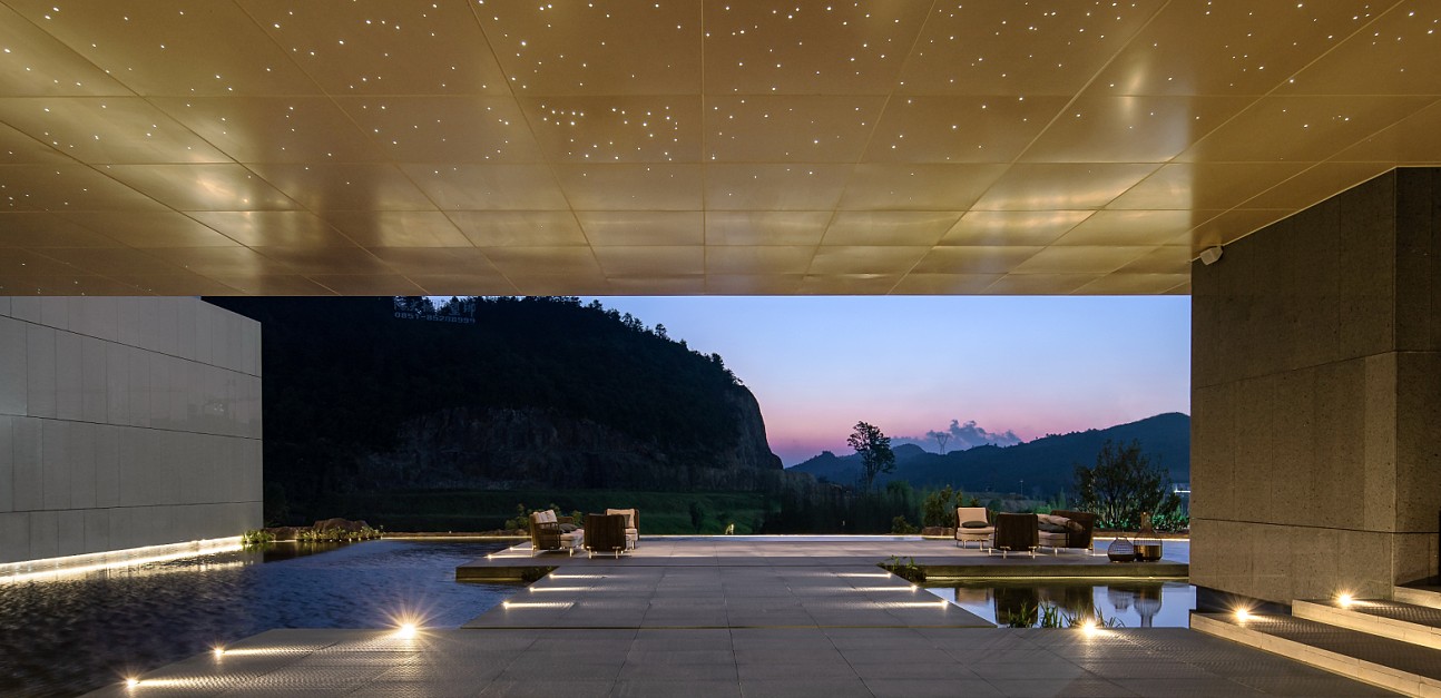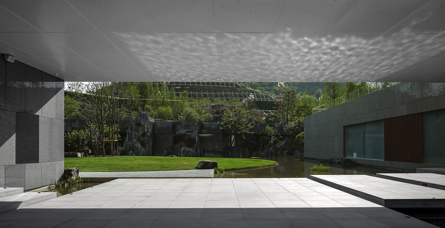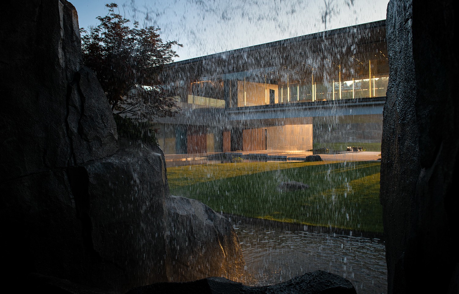 靜謐和閑適是對中心庭院最恰當(dāng)?shù)男稳荩瑨伻チ烁∈赖募姅_,閉上眼在呼吸間放松身心,跌瀑營造的自然聲響,緩緩開啟人們對于故鄉(xiāng)的記憶。