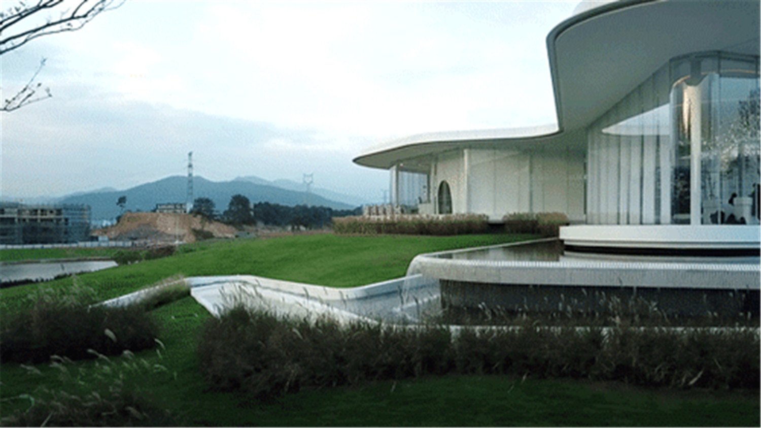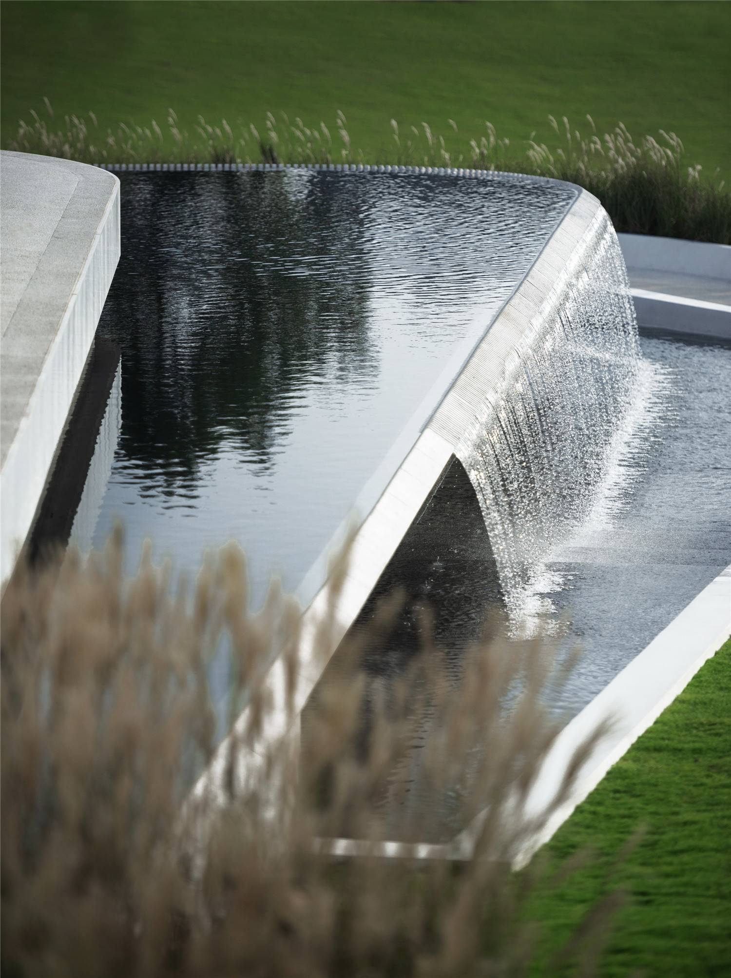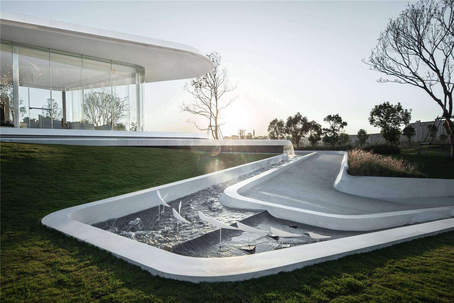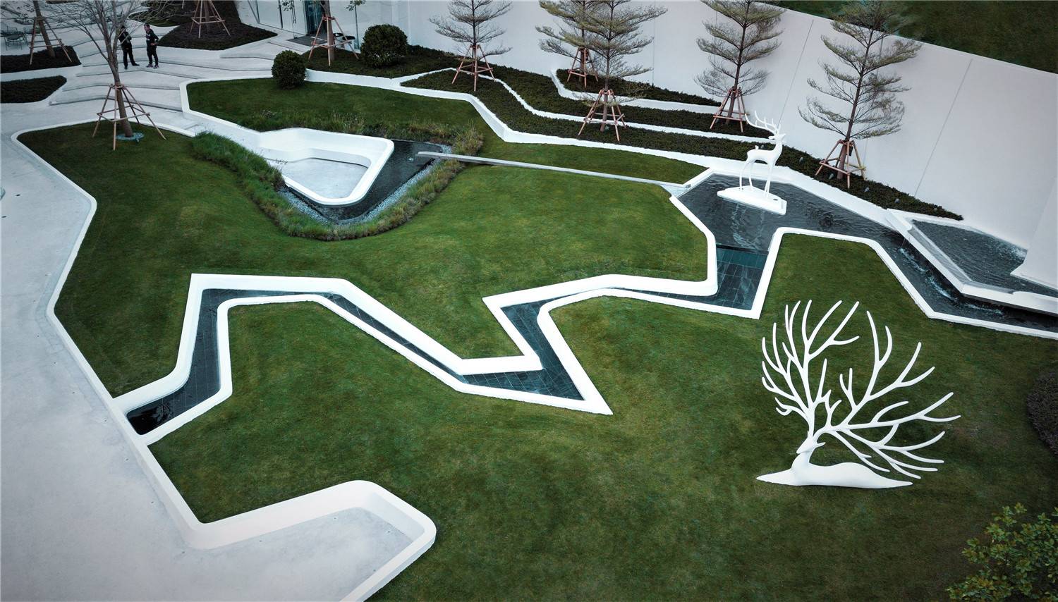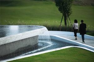 尋溪而上,一路流水潺潺,抽象形態(tài)的魚兒雕塑穿梭著,現(xiàn)代美感呼之欲出。泛起的漣漪與升騰的霧氣,為穿尋仙境的過程增添未知感。曲折的步道與場地相互滲透著,讓逐步靠近建筑的體驗感更為豐富,營造出漫步漂浮于草坡之上的獨特藝術氛圍。