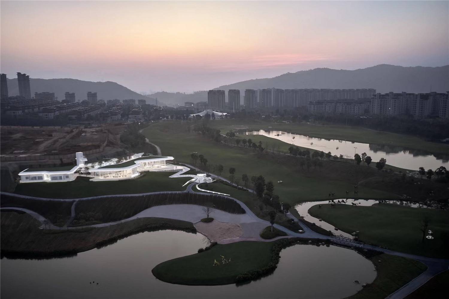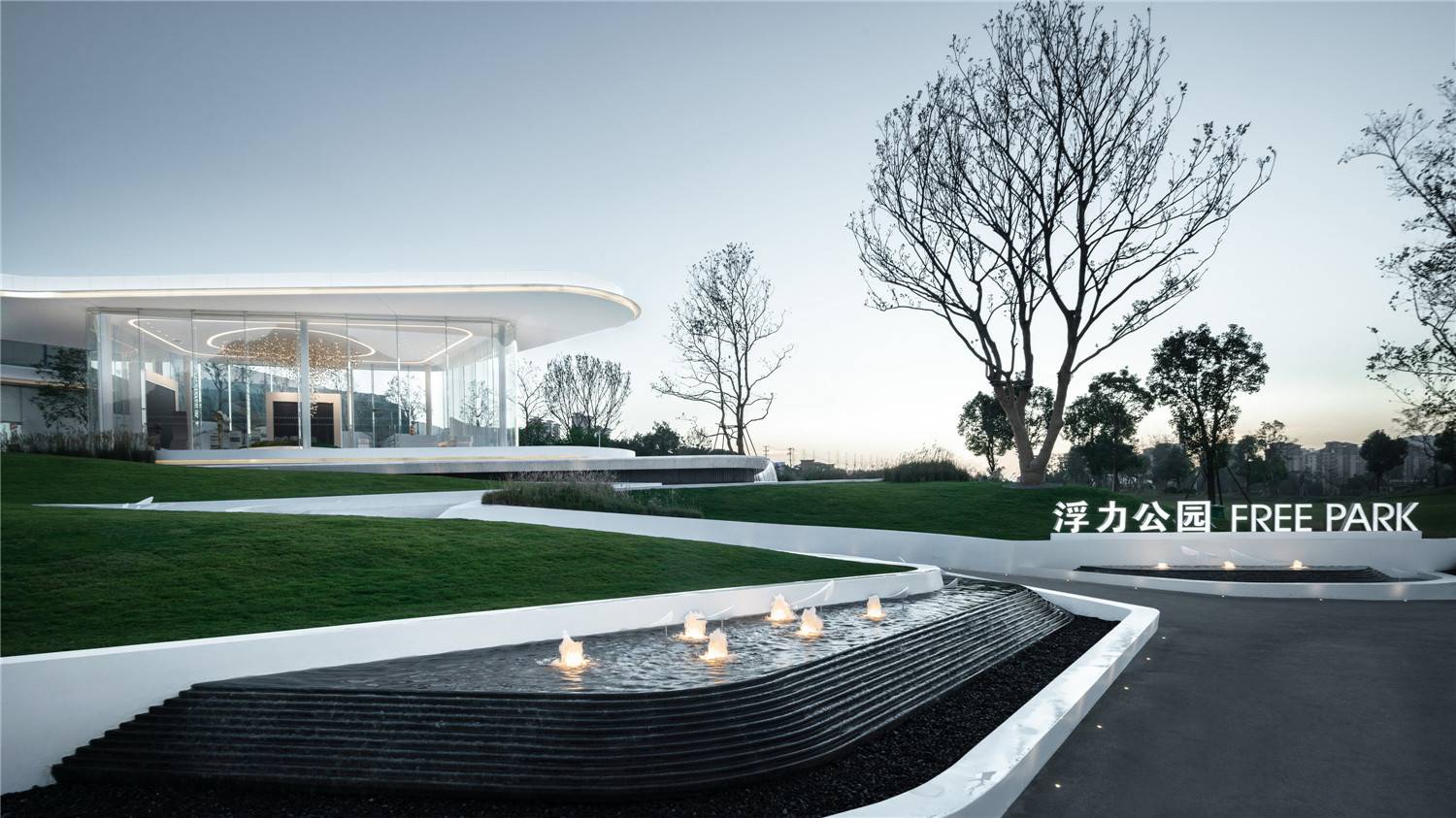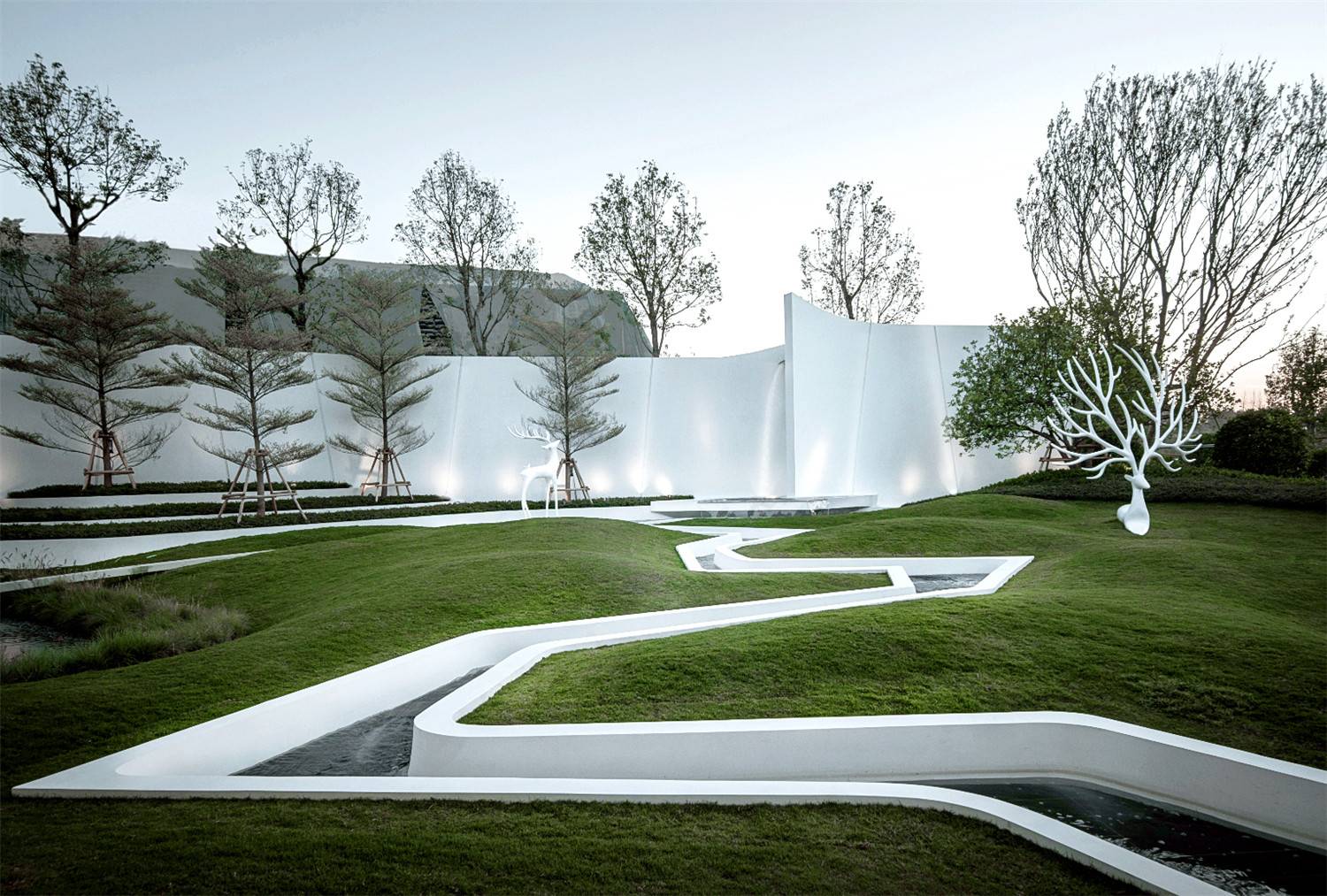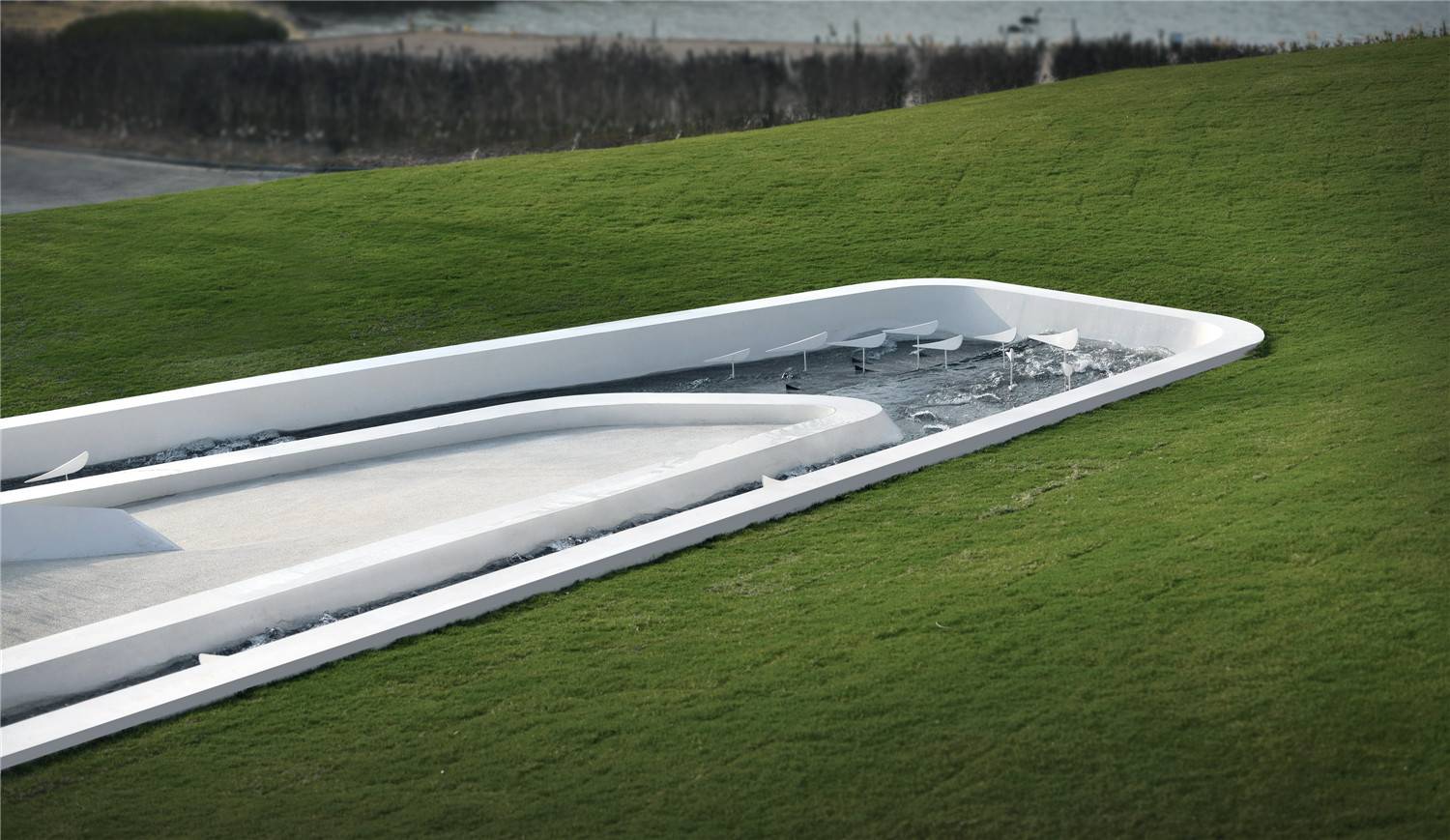 尋溪而上,一路流水潺潺,抽象形態(tài)的魚兒雕塑穿梭著,現(xiàn)代美感呼之欲出。泛起的漣漪與升騰的霧氣,為穿尋仙境的過程增添未知感。曲折的步道與場地相互滲透著,讓逐步靠近建筑的體驗感更為豐富,營造出漫步漂浮于草坡之上的獨特藝術氛圍。
