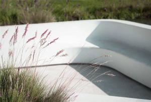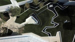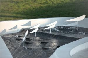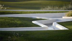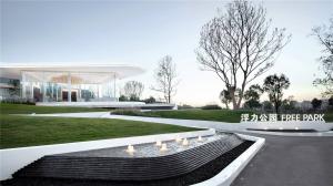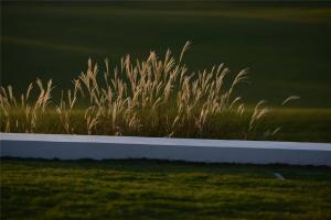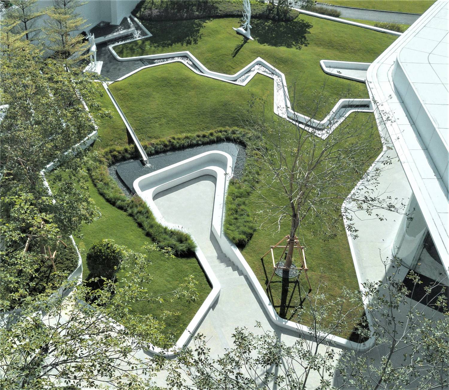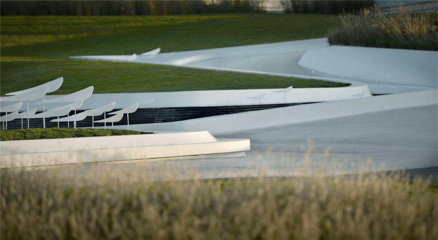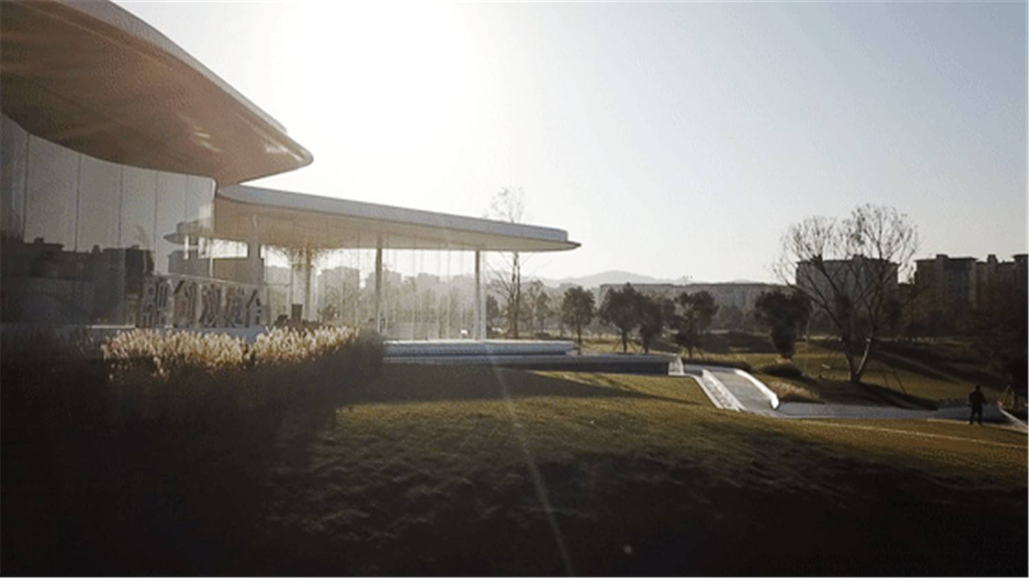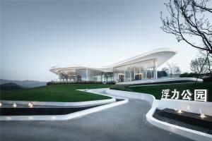 尋溪而上,一路流水潺潺,抽象形態(tài)的魚兒雕塑穿梭著,現(xiàn)代美感呼之欲出。泛起的漣漪與升騰的霧氣,為穿尋仙境的過程增添未知感。曲折的步道與場地相互滲透著,讓逐步靠近建筑的體驗感更為豐富,營造出漫步漂浮于草坡之上的獨特藝術氛圍。