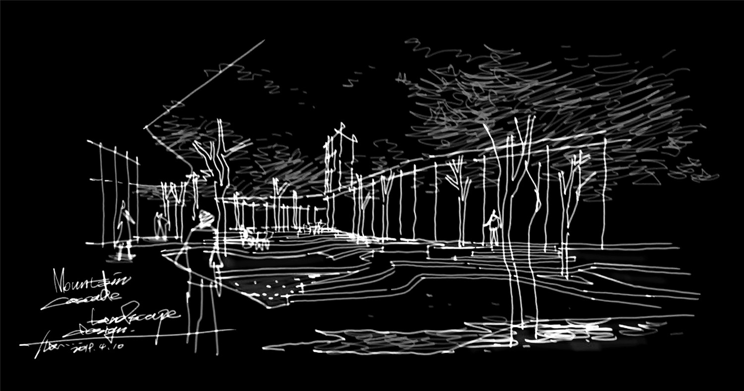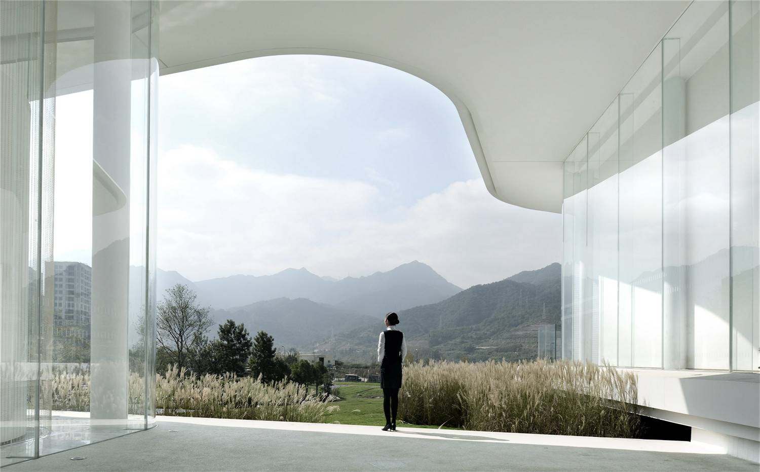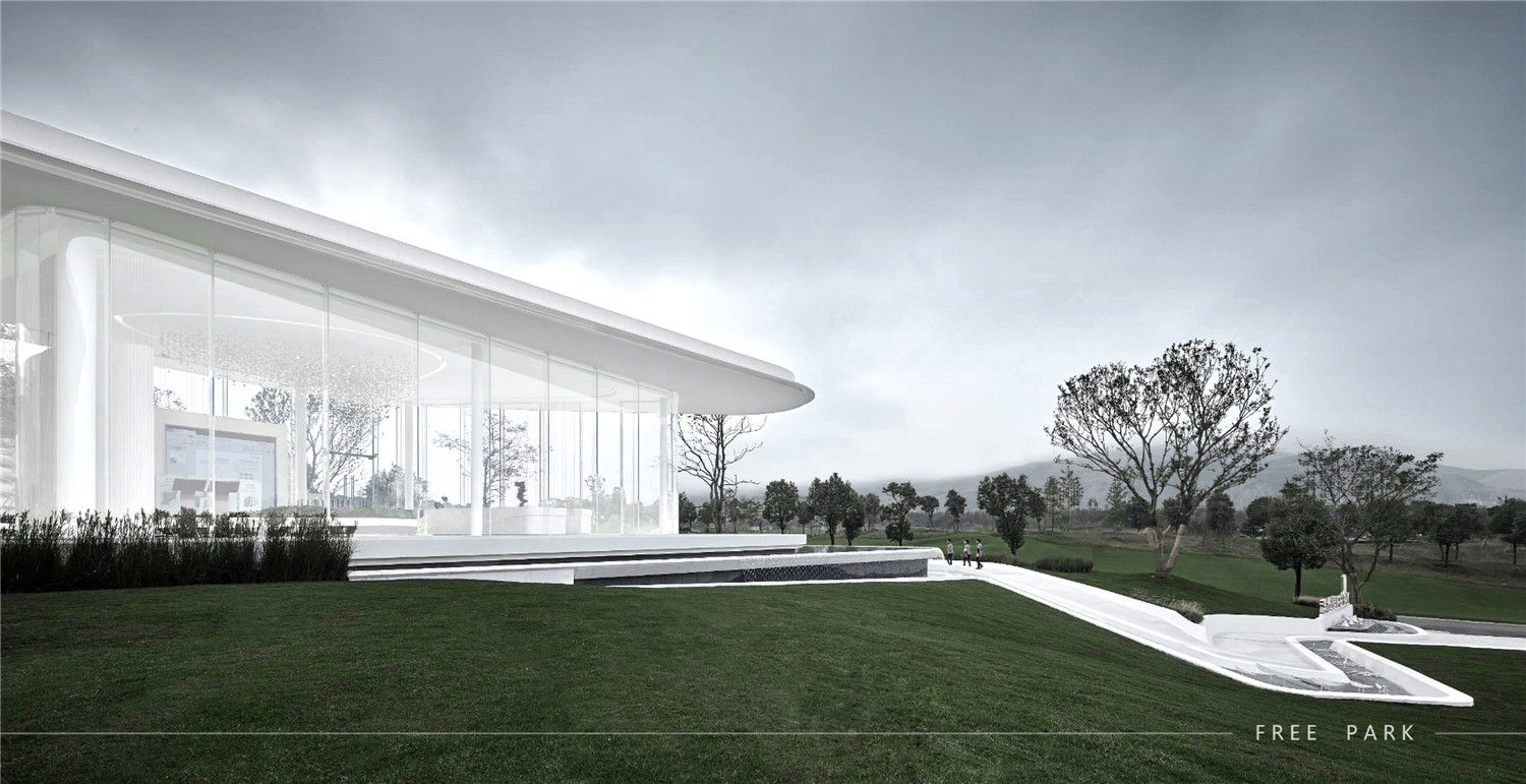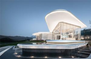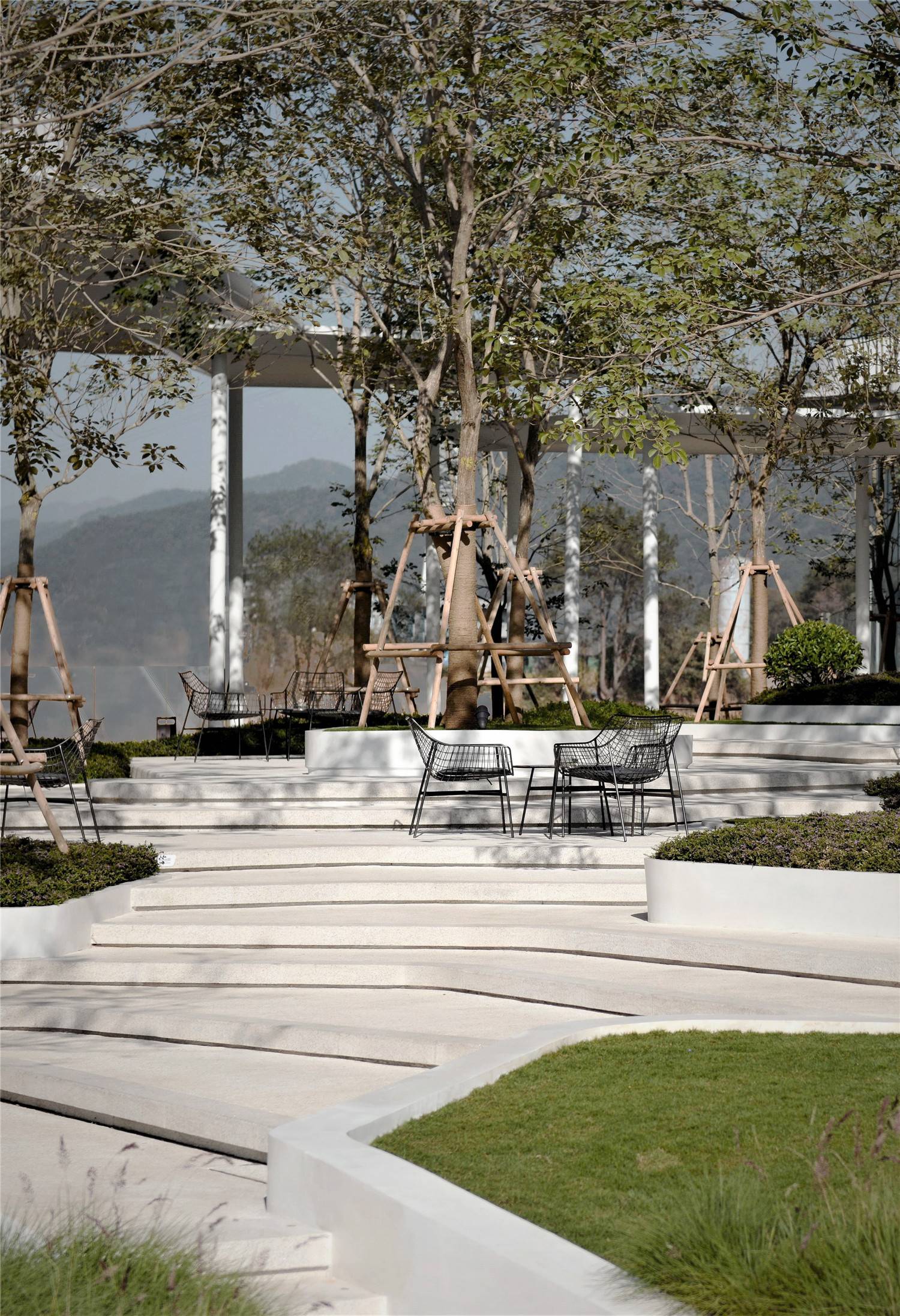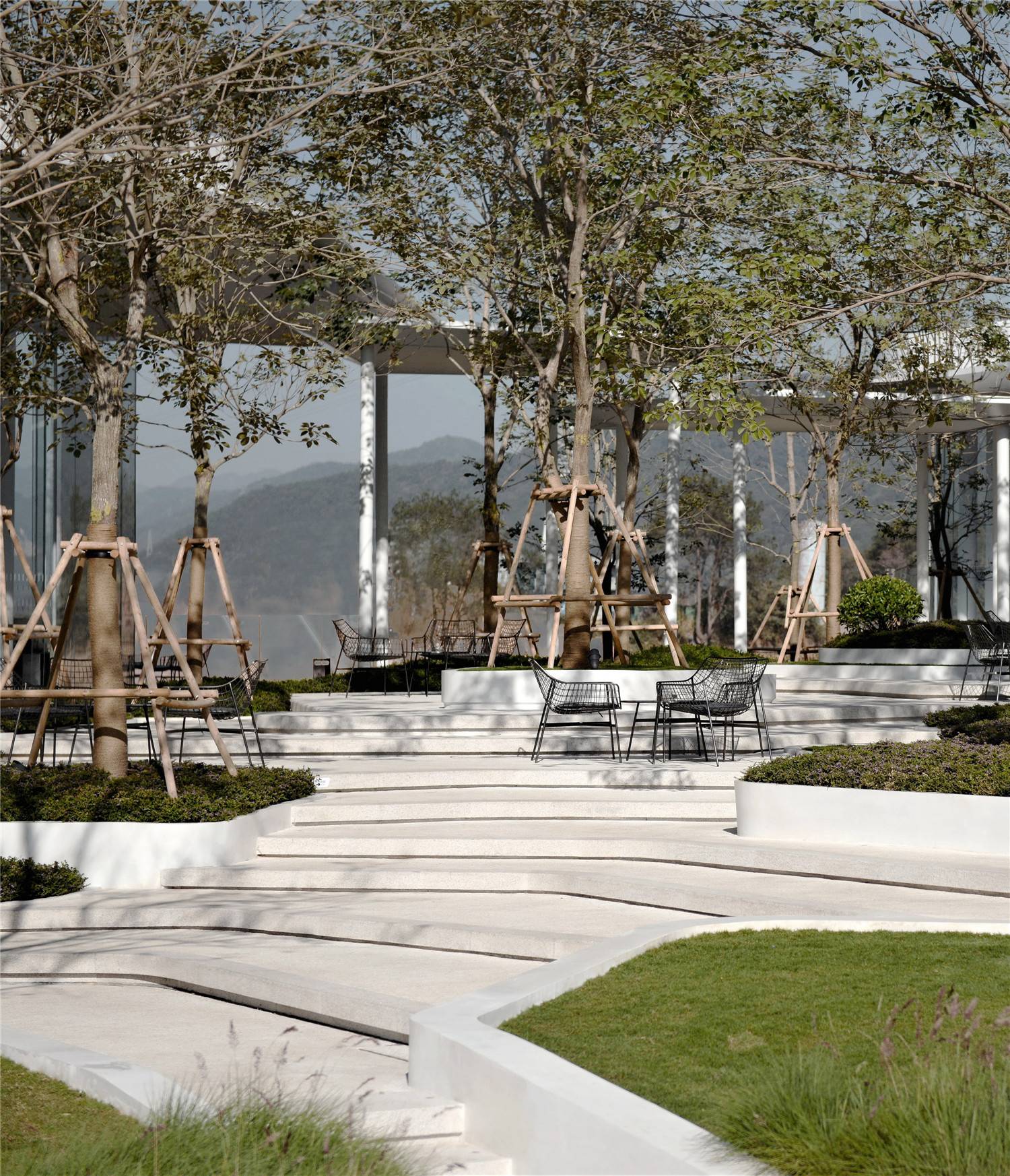 在層巒疊嶂的映襯下,漂浮在山坡上的建筑猶如一座透明水晶宮,具有戲劇沖突性的基調(diào)?;诖?,我們將場地的自然風貌與人文藝術用景觀的手法加以修飾過渡,將恢弘的自然最大化呈現(xiàn)于眼前,讓建筑、景觀、人在此相融。