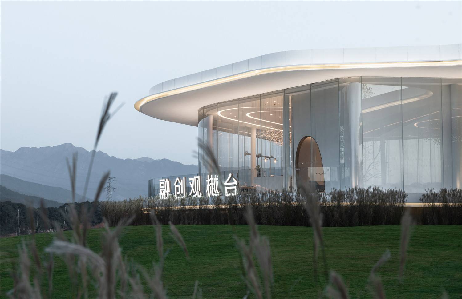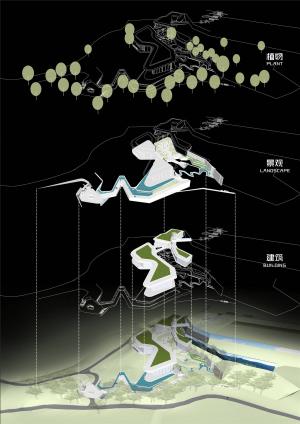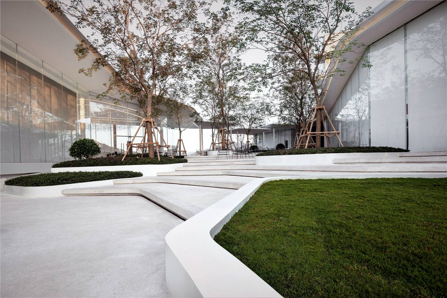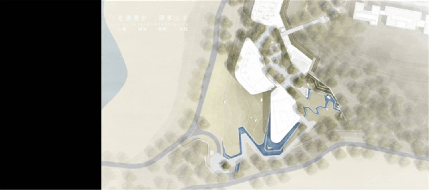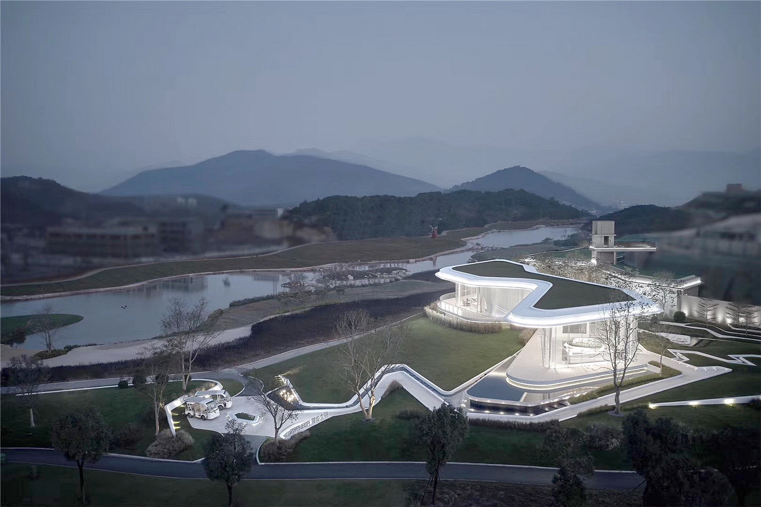 在層巒疊嶂的映襯下,漂浮在山坡上的建筑猶如一座透明水晶宮,具有戲劇沖突性的基調(diào)?;诖?,我們將場地的自然風貌與人文藝術用景觀的手法加以修飾過渡,將恢弘的自然最大化呈現(xiàn)于眼前,讓建筑、景觀、人在此相融。