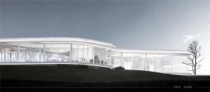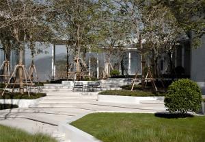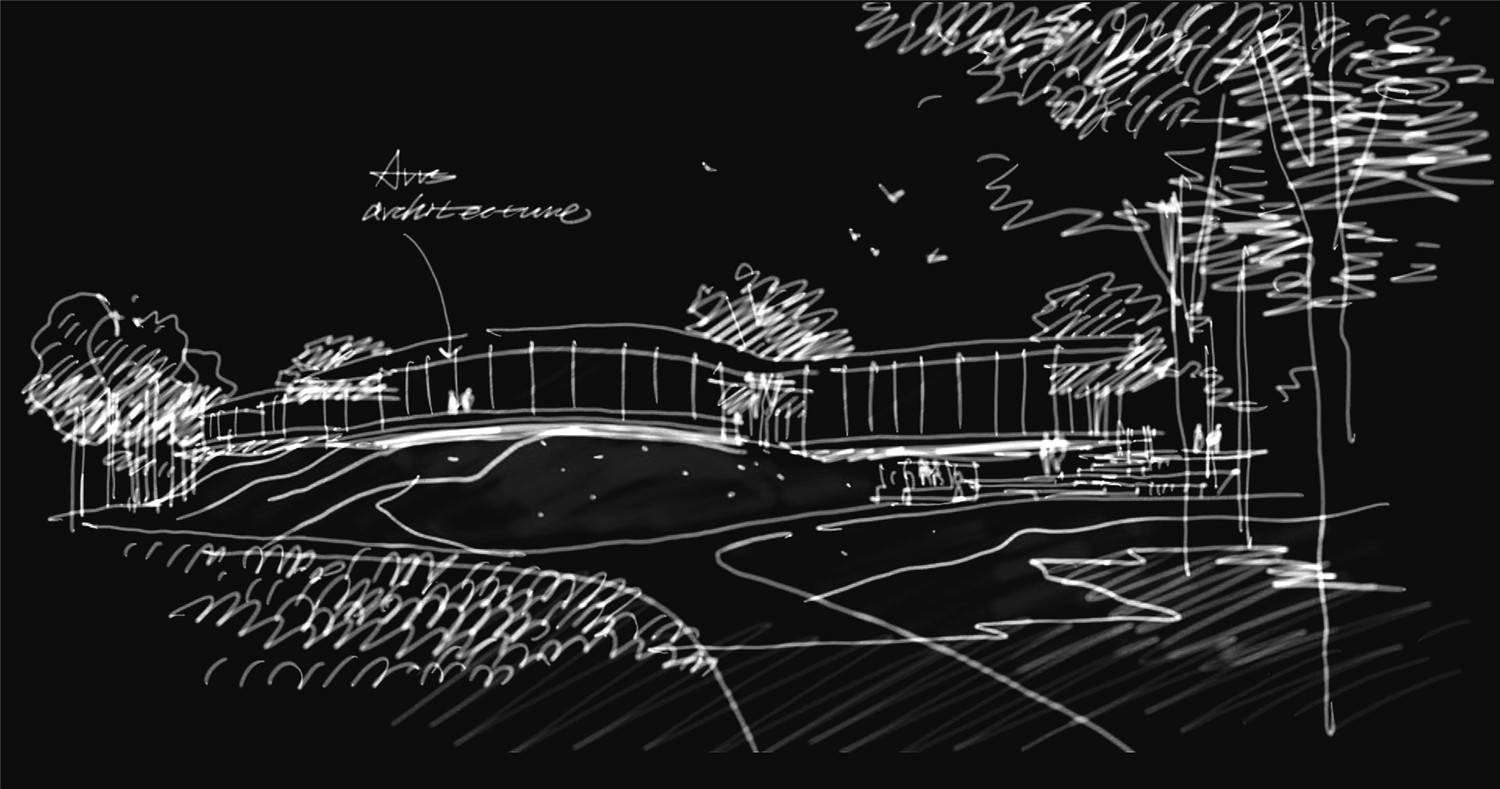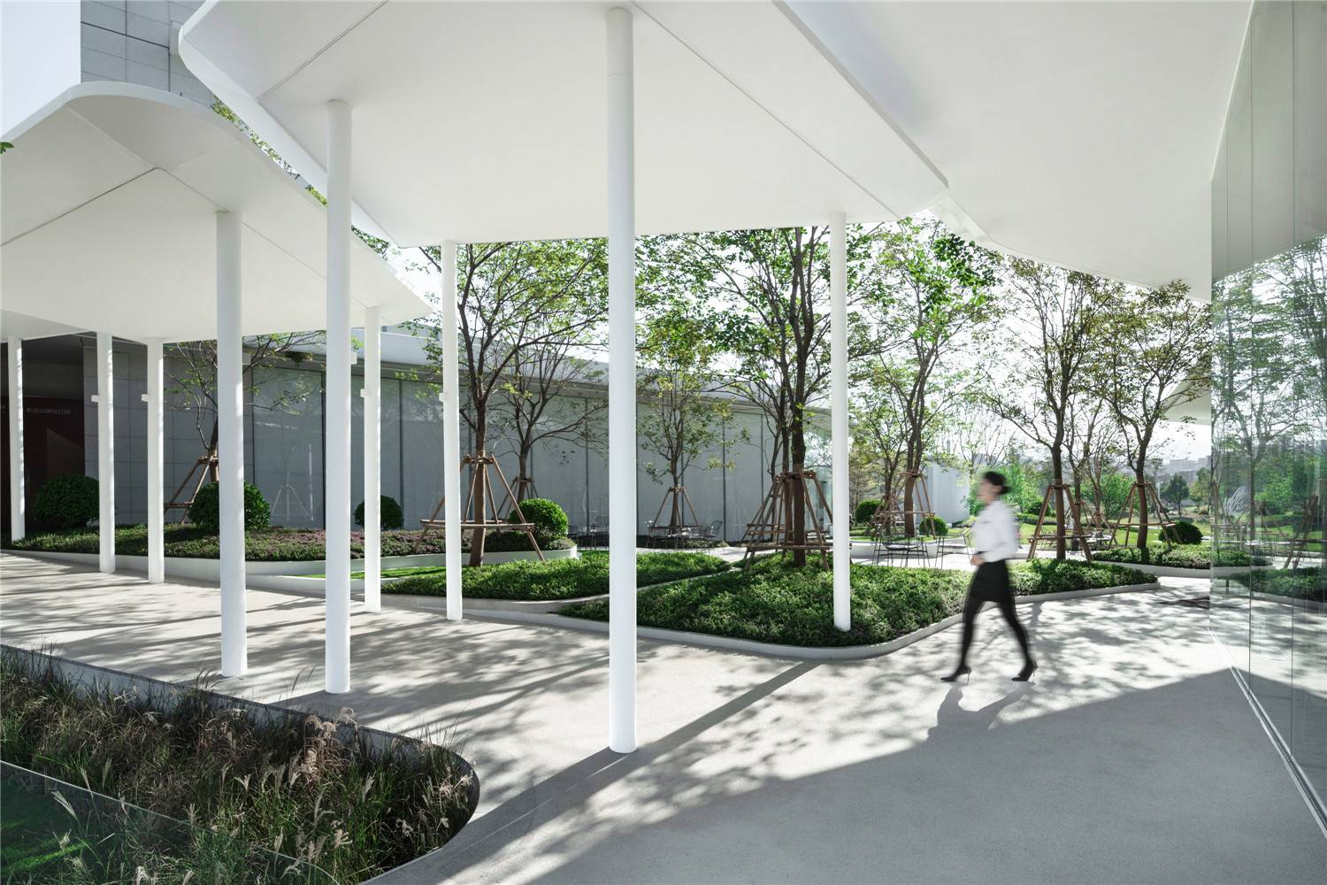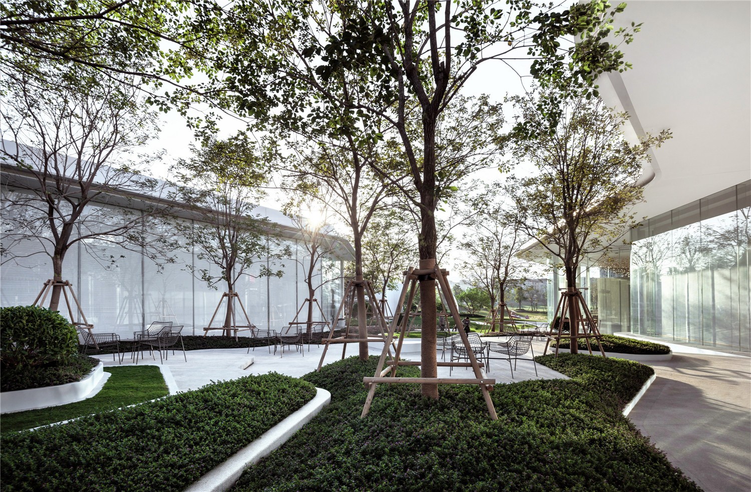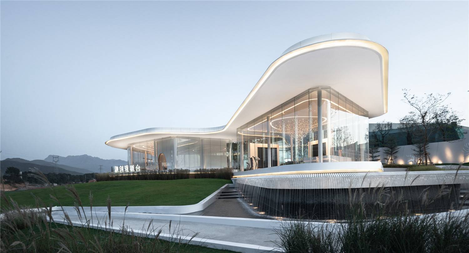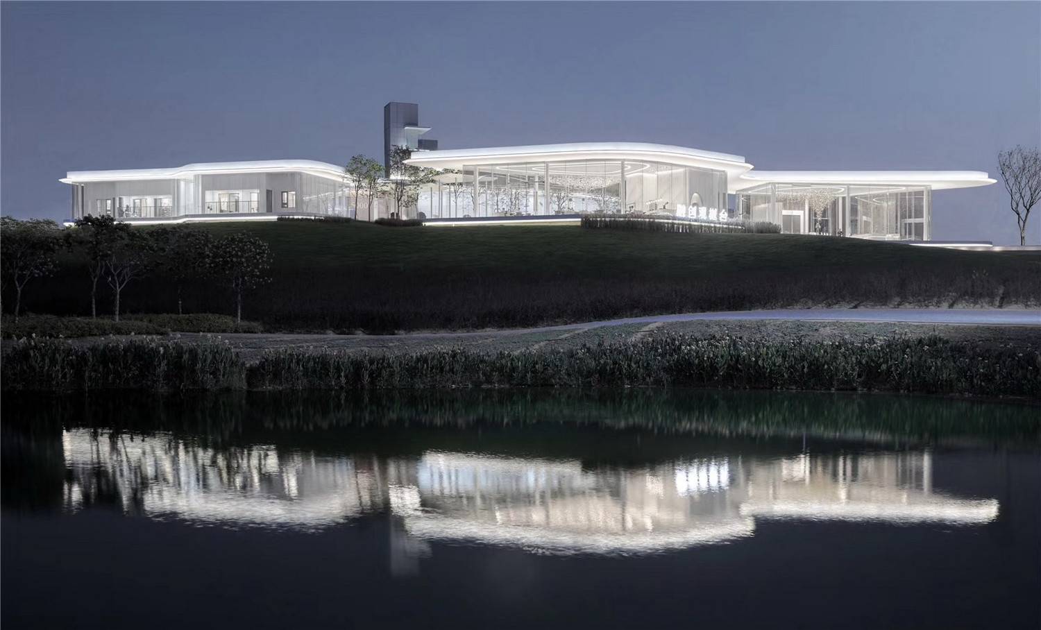 在層巒疊嶂的映襯下,漂浮在山坡上的建筑猶如一座透明水晶宮,具有戲劇沖突性的基調(diào)?;诖?,我們將場地的自然風貌與人文藝術用景觀的手法加以修飾過渡,將恢弘的自然最大化呈現(xiàn)于眼前,讓建筑、景觀、人在此相融。