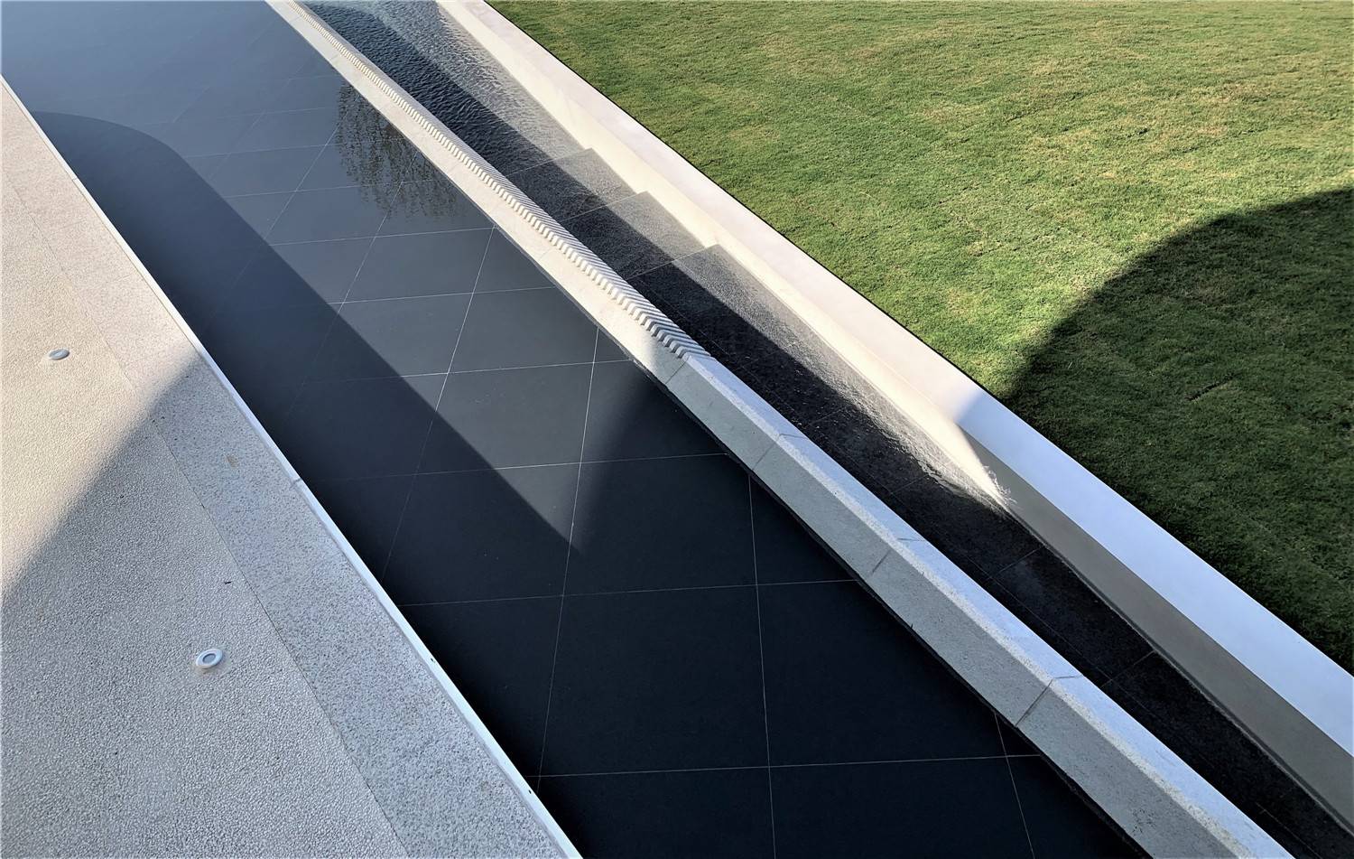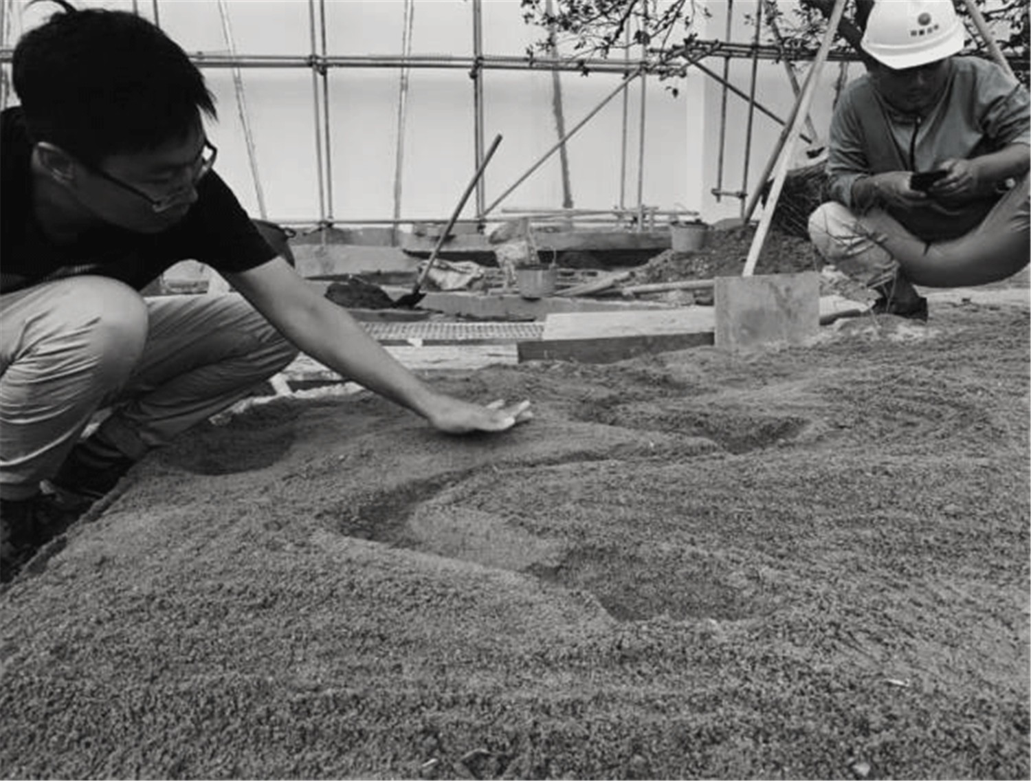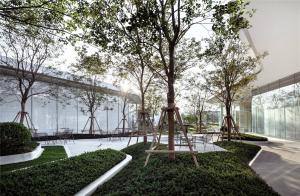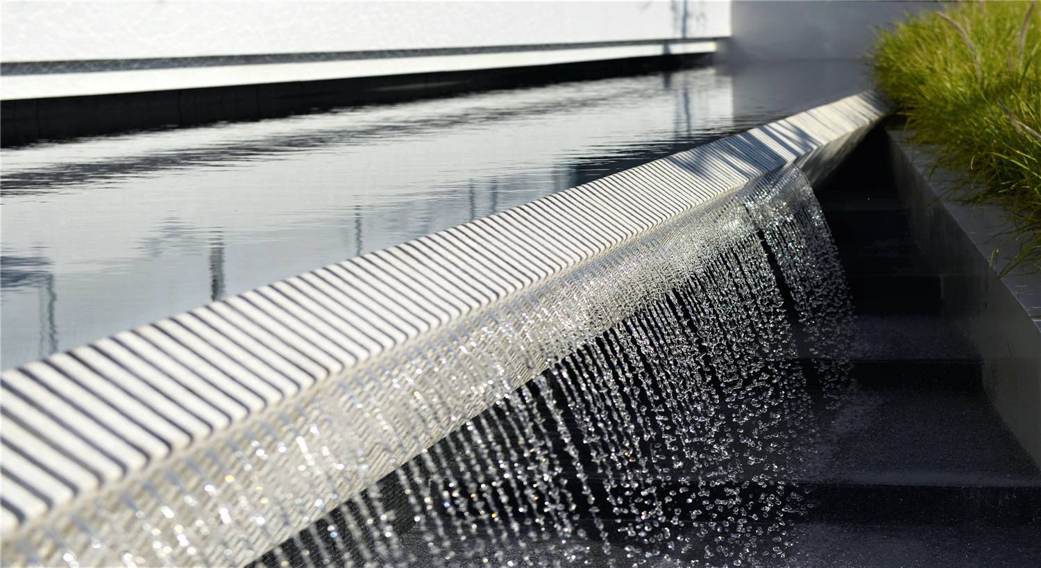 臨近建筑,幽靜的環(huán)境中,落瀑跌至池底的清脆聲漸響,低矮的草木隨風搖曳,使人心生期待。