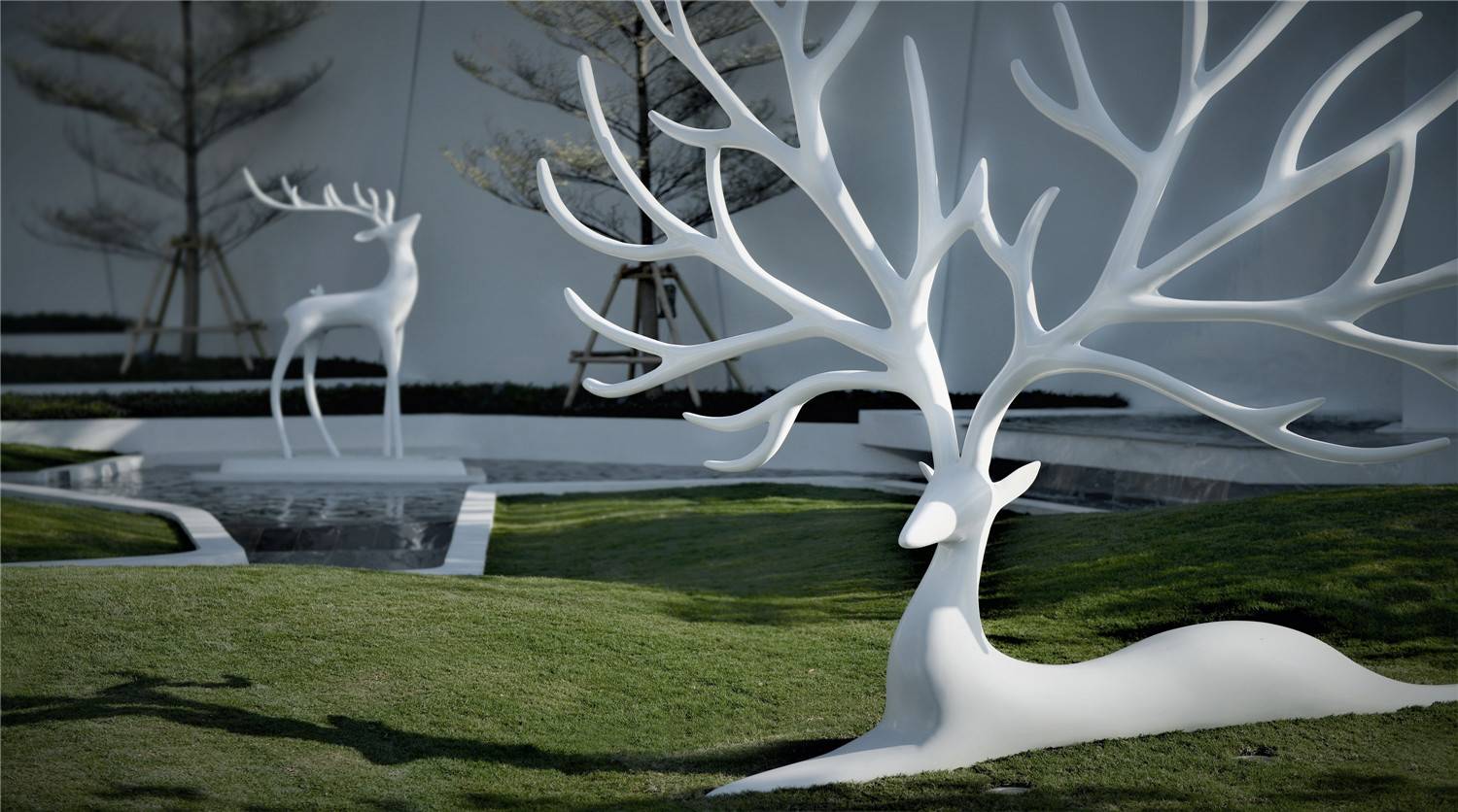 草坪上,兩只小鹿一臥一立,臥鹿徜徉、立鹿觀瀑,形態(tài)可掬的模樣頓增寧靜祥和之感,讓整個空間更為靈動?;叵胍幌?,上次親近自然,是在記憶都模糊的許久以前了嗎?