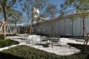 在建筑之間,我們營造了一處林下休息空間,供來訪者停留休憩。在林下草地中穿插的石階,層疊咬合后繼而統(tǒng)一,形成仿佛無重力的層疊空間。步行其中,宛如漂浮于整個庭院之中,身姿似乎也跟著輕盈起來。