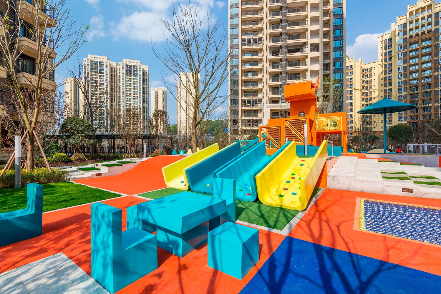 Surrounded by small pixels of greenery as a border solution to provide privacy and safety confining the playscape, the plaza is also equipped with lounge resting areas, picnic areas with seats & tables, seating box structures to provide shadow, sunken communal benches, sloped lawns to lay down and small amphitheatres for gatherings.
