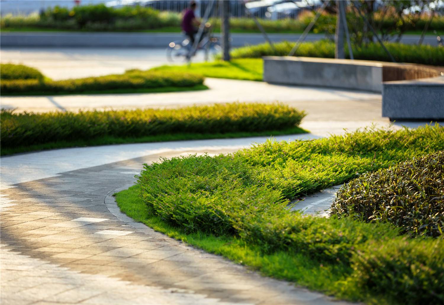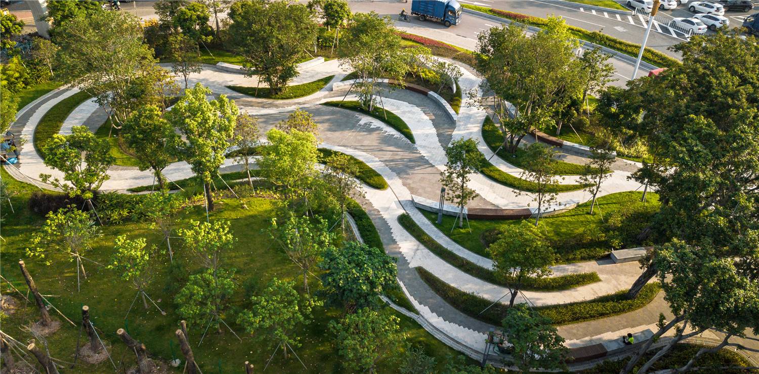 On the east side of the street square, the shape of Datansha Island continues, with the element of water, adding paving, benches, and short walls to build an interesting rest place.