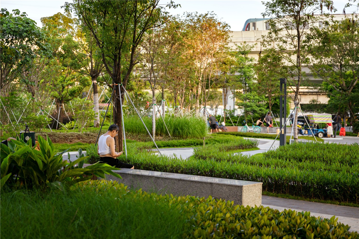 As to the construction of public space, we adopted the method of creating gathering node space to provide an atmosphere for communication and interaction; as to the design of outdoor furniture, we made flexible arrangement on the metro square and street parks. People can stay, walk, sit or talk. This place has become a comfortable space for people to chat, sit and rest, and children to play.