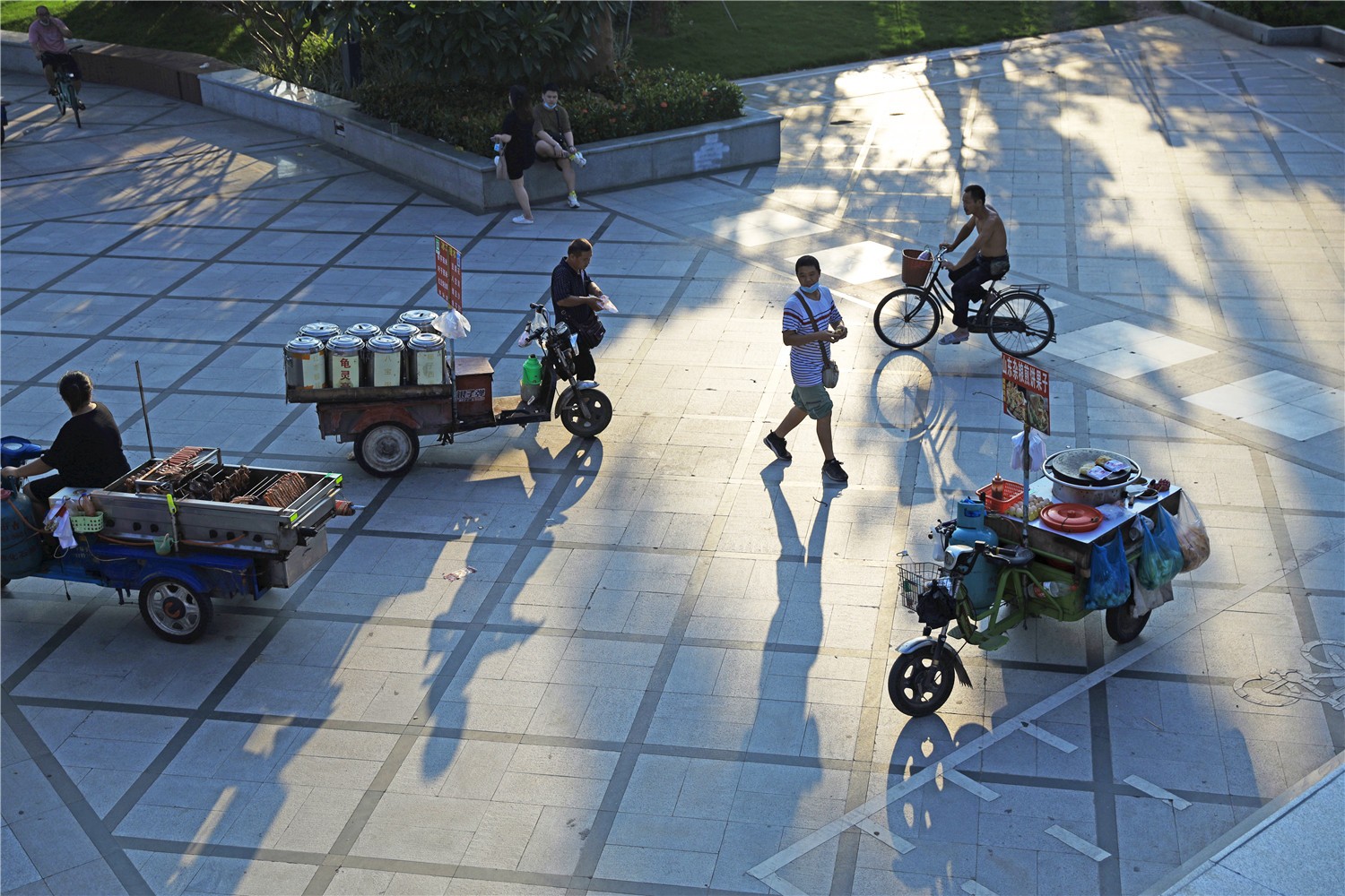 On the metro square, the "street vending" is rejuvenated. Vendors are running their own businesses; pedestrians have a short rest and eat something; motor scooter riders are waiting for more passengers quietly...How prosperous Guangzhou is here!