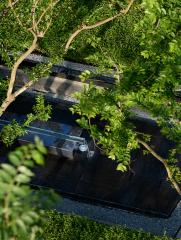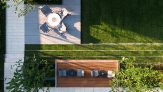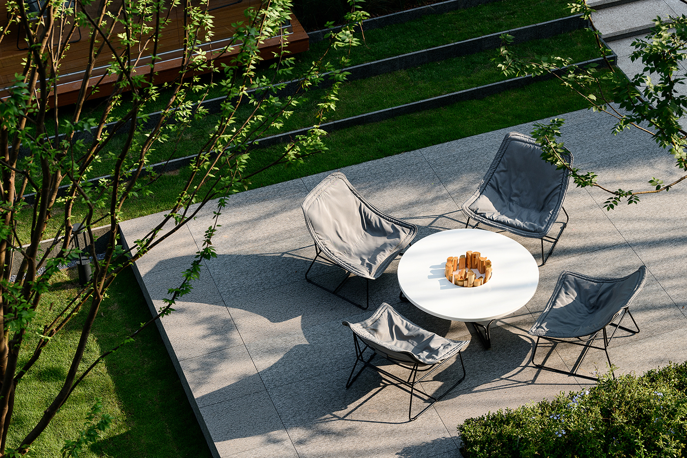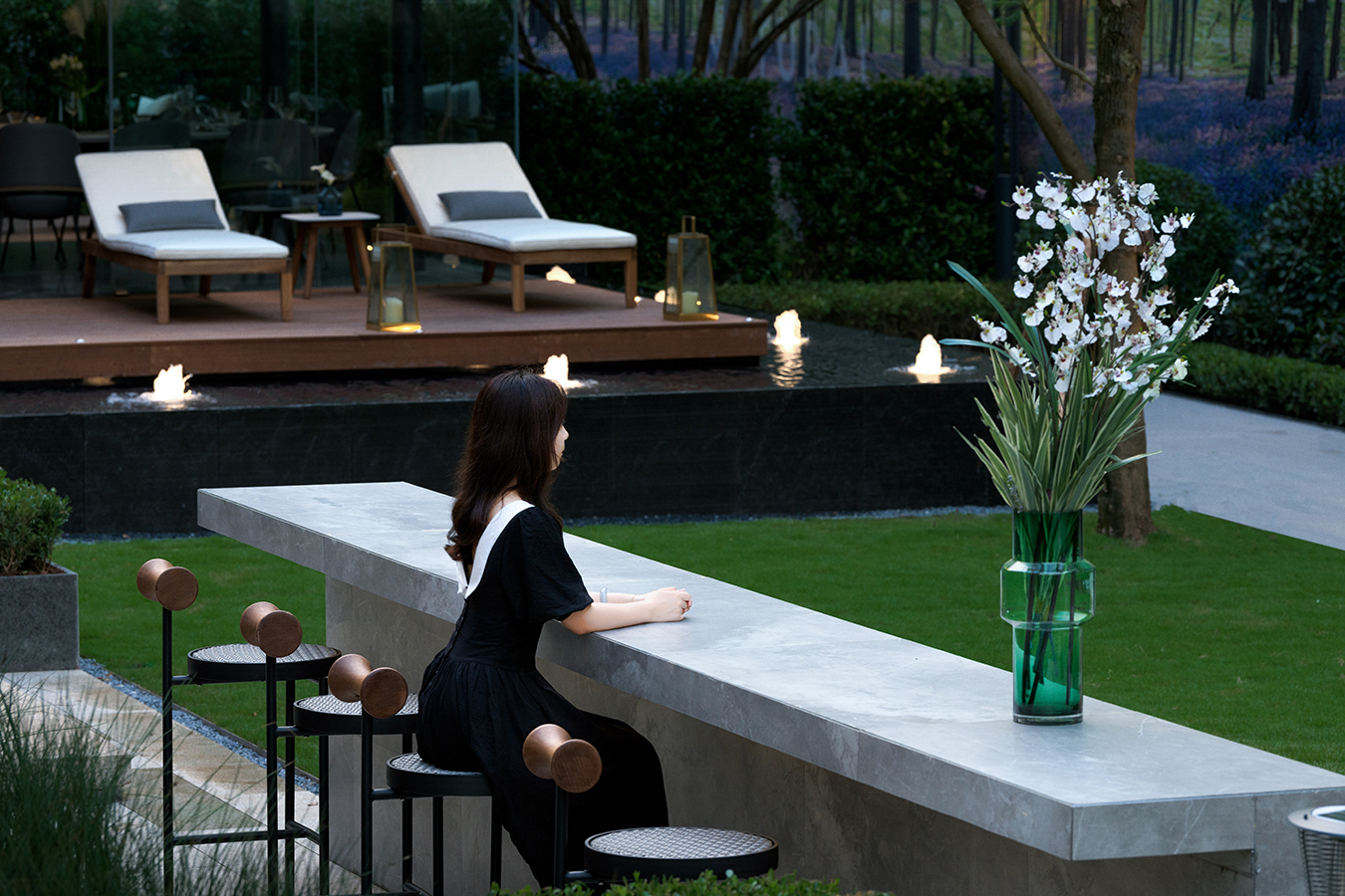 會客廳是風(fēng)景里的生活社交場,下沉卡座隱于樹木灌叢之中,營造半私密、親和安靜的會客空間,風(fēng)雨連廊延伸至Q會客廳,串聯(lián)自然與生活。夏日午后,鳥鳴啾啾、花木在側(cè),可與好友在此洽談,享受山林的低密時光。