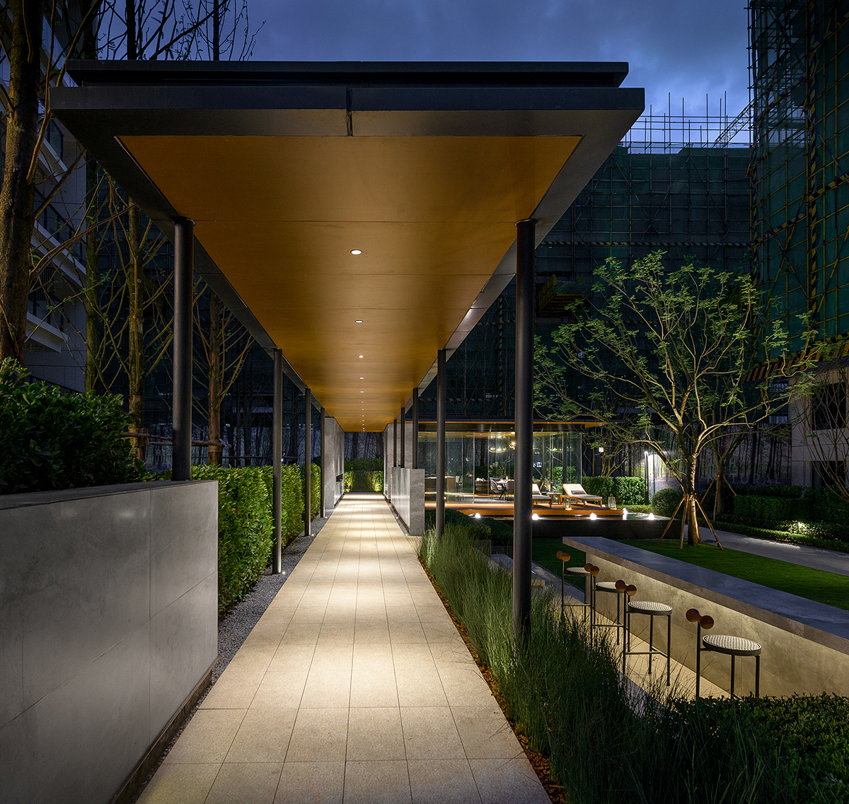 這是一次尊重場地和自然的挑戰(zhàn),場地現(xiàn)狀地勢并不平坦,入口界面12米垂直高差,怎樣去解決景觀功能與界面昭示性?是景觀需要去解決的問題。經(jīng)過反復(fù)考量推敲,前期與甲方及各方專業(yè)的碰撞,我們將劣勢轉(zhuǎn)化為優(yōu)勢,利用高差塑造多層次立體居住空間。