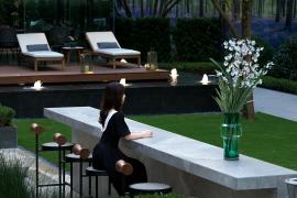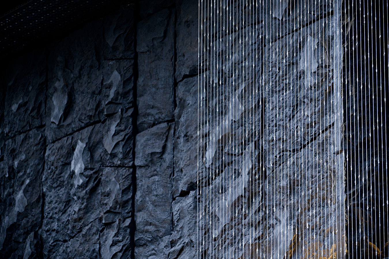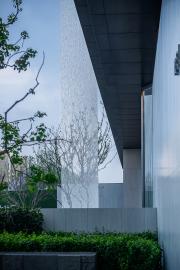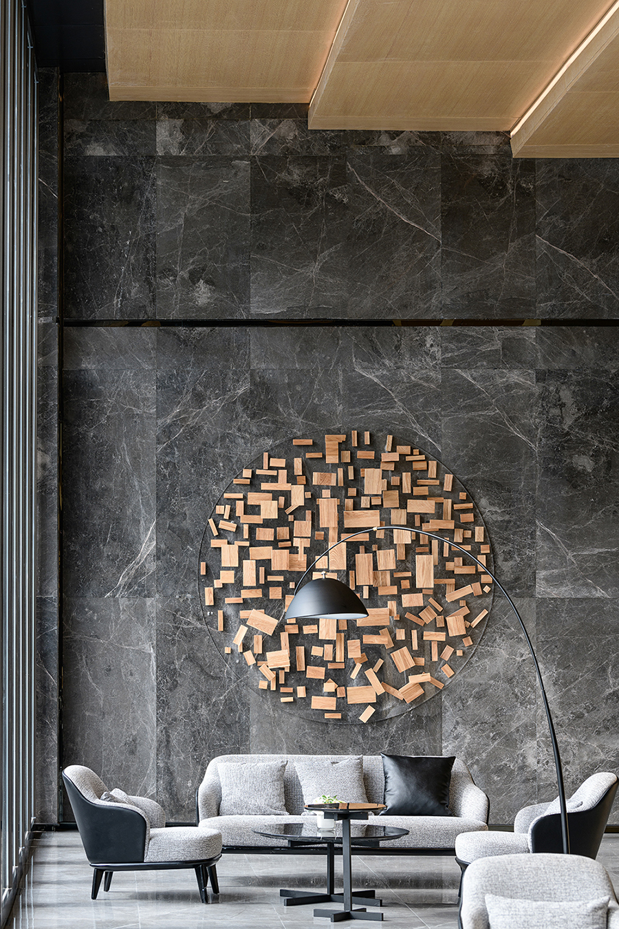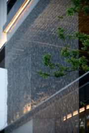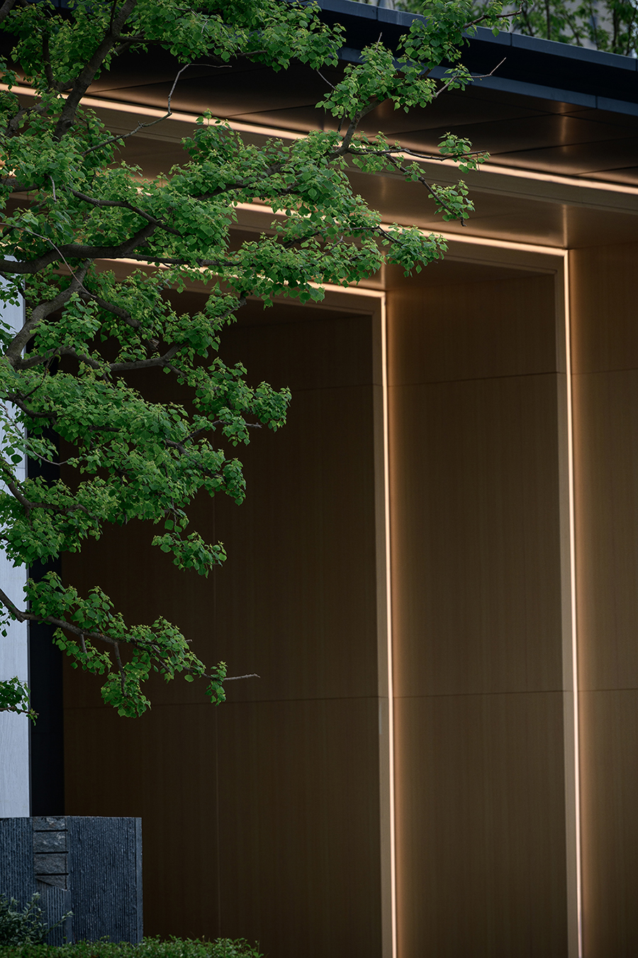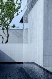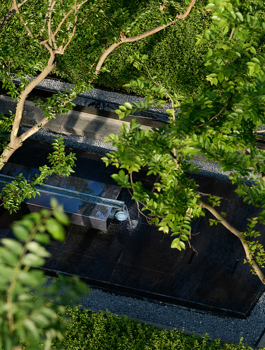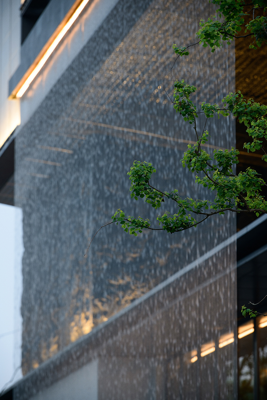 5米挑高,59米橫向延展的大尺度酒店式歸家大堂讓歸家成為秩序體驗。景觀與建筑融合——展示界面水幕,滴水匯聚成簾,隔絕外界喧囂,讓歸家即享受一份寧靜。