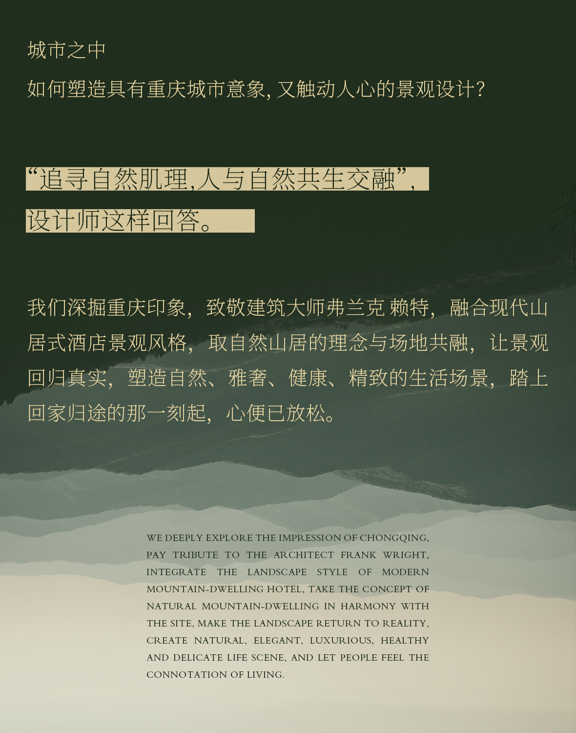 我們以人與自然共生交融的設(shè)計手法處理景觀與自然界的關(guān)系,依山就勢,讓景觀與山水、草木自然地結(jié)合在一起,喚醒人們對于生活的共鳴。