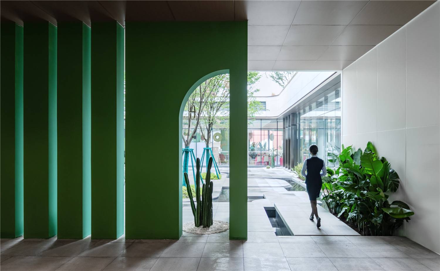 體驗(yàn)伴隨腳步的推進(jìn)開啟,啟程-探索-相伴-曲折-歸宿,串聯(lián)起入口、內(nèi)庭、側(cè)院、屋頂四大主題空間,一個(gè)年輕時(shí)尚、趣味神秘的色彩異想世界展示在眼前。隨我們,在一個(gè)又一個(gè)具有強(qiáng)烈記憶點(diǎn)的轉(zhuǎn)角中,不安分地穿行。