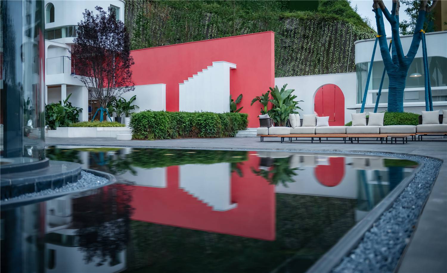 反映于項(xiàng)目,我們運(yùn)用了構(gòu)成幾何與濃烈色彩的設(shè)計(jì)手法,加上不斷變幻的自然光線,讓這里變成現(xiàn)實(shí)與夢(mèng)幻的交匯之處,同時(shí)不失重慶獨(dú)特的地理文化。強(qiáng)烈的視覺沖擊感和豐富的空間層次感,一定能像重慶這座8D魔幻之都一般,給你留下深刻的印象。