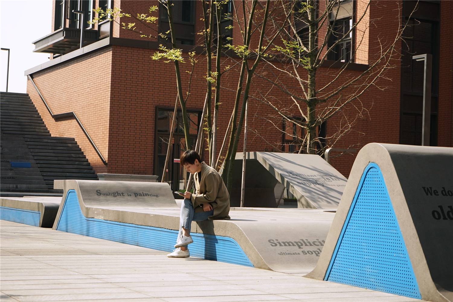 為了讓整體的交通更連貫舒適,設(shè)計(jì)用臺(tái)地將建筑的外圍邊界環(huán)繞起來,將上下交通的臺(tái)階,戶外休息坐凳,種植池甚至場(chǎng)所文化的表達(dá),庭院的色彩性格都融入其中,形成了一個(gè)形式統(tǒng)一,功能多元,內(nèi)蘊(yùn)豐富的場(chǎng)地邊界形象,并將幾個(gè)孤立的島嶼連成了一片完整的大陸。不僅園區(qū)外場(chǎng)從任何一個(gè)接口都可以輕松愉悅的進(jìn)入內(nèi)部,各個(gè)建筑庭院之間的交通聯(lián)結(jié)也更為流暢和緊密。