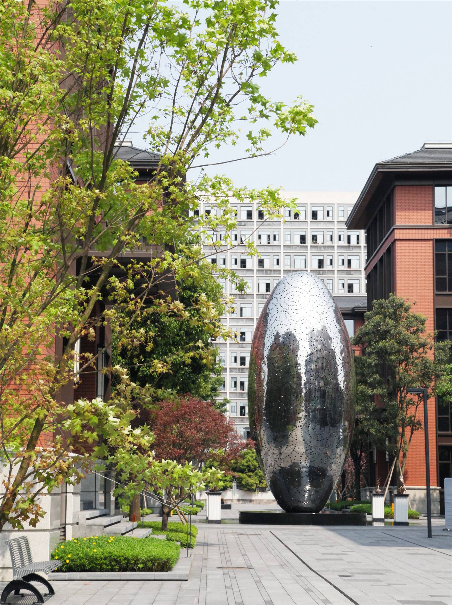 在兩條主軸線交匯處,設(shè)計(jì)選擇以一個(gè)象征萬物關(guān)聯(lián)與平衡藝術(shù)雕塑形成視覺中心聚焦點(diǎn),形成一處開放的中心小廣場(chǎng),既體現(xiàn)了空間的自由和藝術(shù)氣質(zhì),也增添了幾分趣味。
