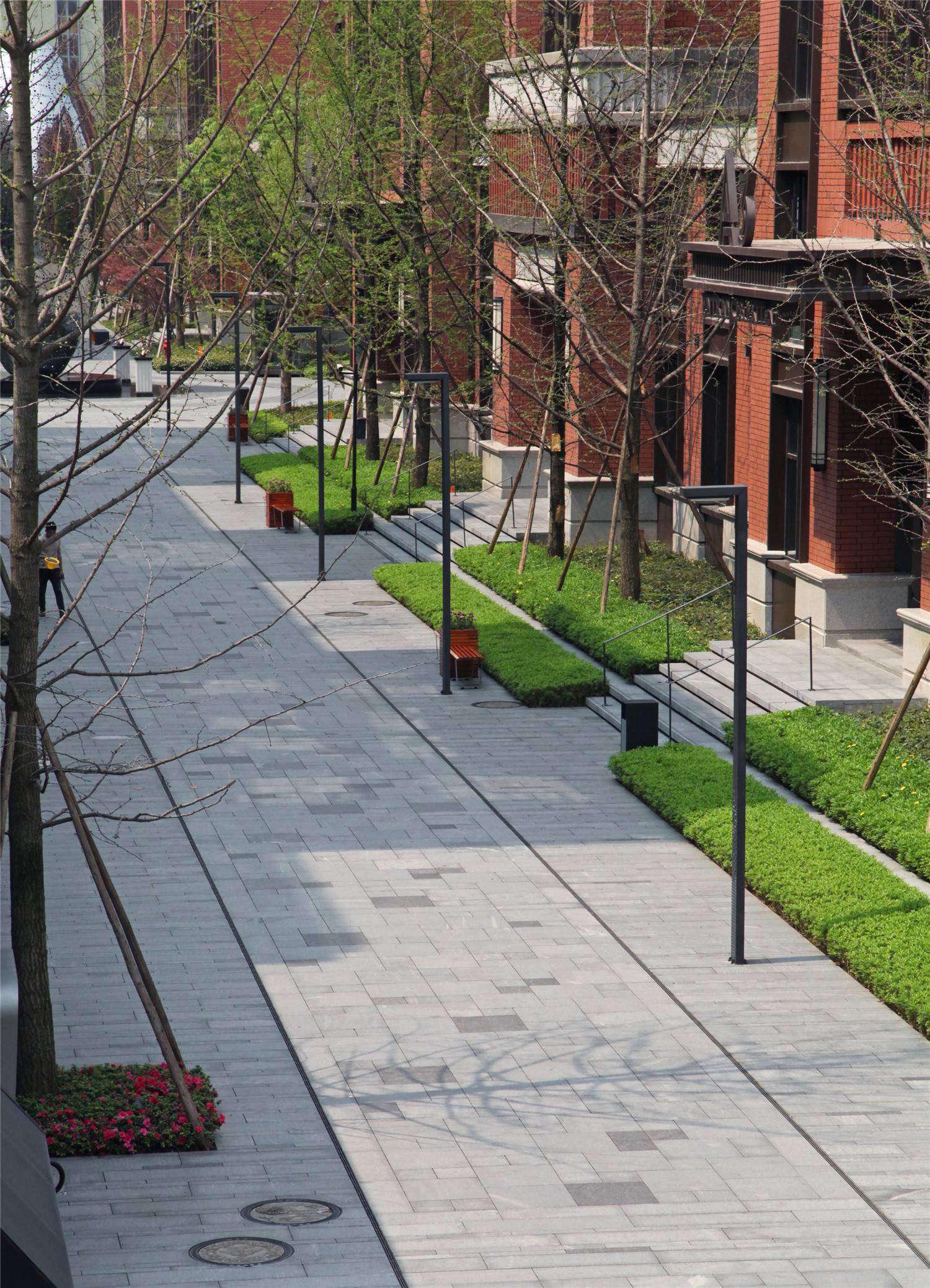 In order to improve the use density and strength of the streamline, the design has carefully treated all the relatively cramped spaces of the original traffic to make the traffic more comfortable. For example, above the two garage entrances on the west side, just at the boundary of the two building courtyards, the distance between the openings of the entrances and the building walls on both sides is already very narrow, but in order to prevent this end of the courtyard from becoming a dead end, the design will This narrow passage opens to communicate with the outside of the park. Through the artistic design of the roof of the garage entrance and the careful treatment of the soft landscape, this narrow space is also full of walking fun.