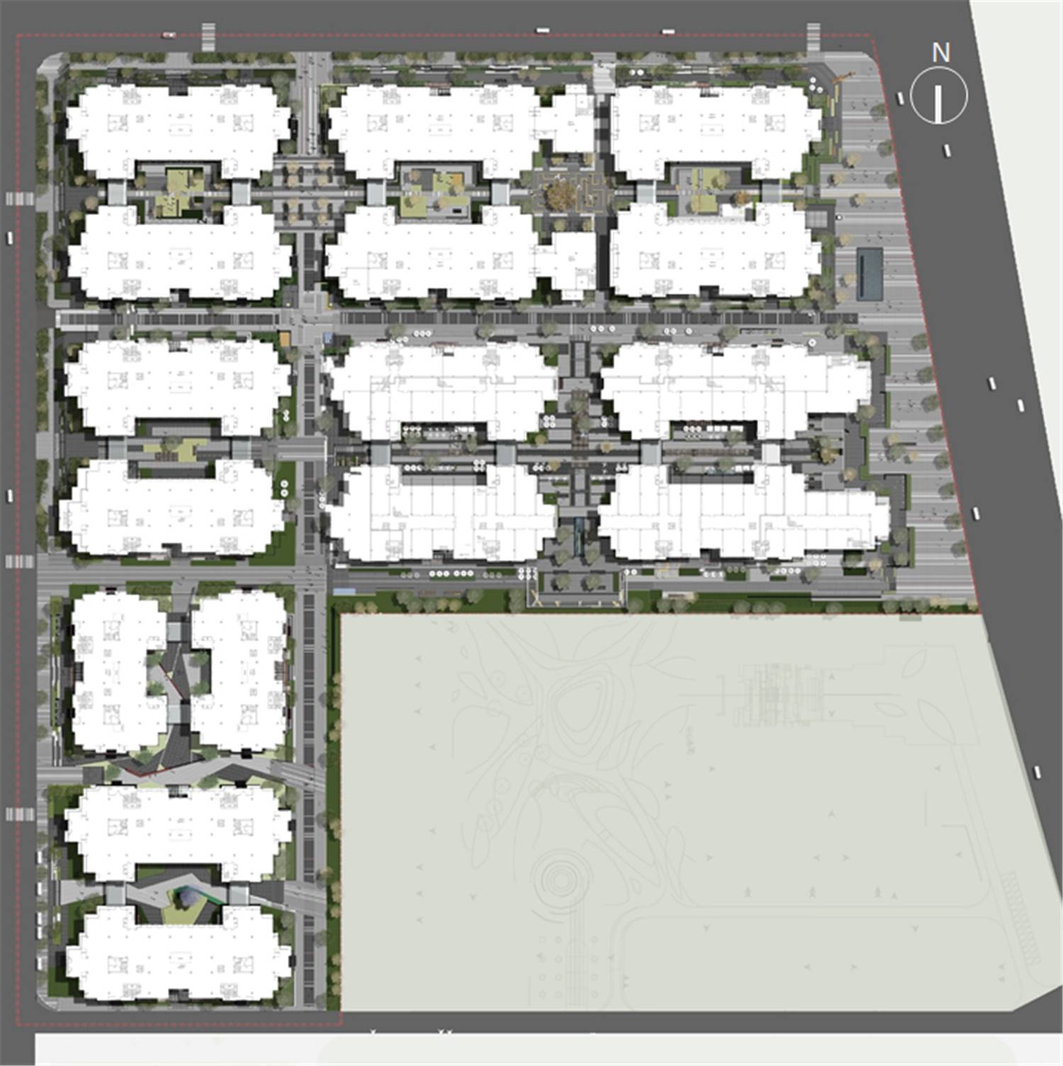 The project is divided into three phases of development. The first phase has a construction area of 96,997 square meters and a building area of 40,955 square meters. It is mainly an enterprise office building. The architectural planning layout is one vertical and two horizontal. The three streets divide the office area into six building courtyards, of which 5 A ground courtyard is connected to the first floor of the building, and the other is on the roof of the second and third floors of the building. The fire lanes of the entire project are allowed to be treated as invisible lanes, which also provides opportunities for the continuity and integrity of the ground pavement.