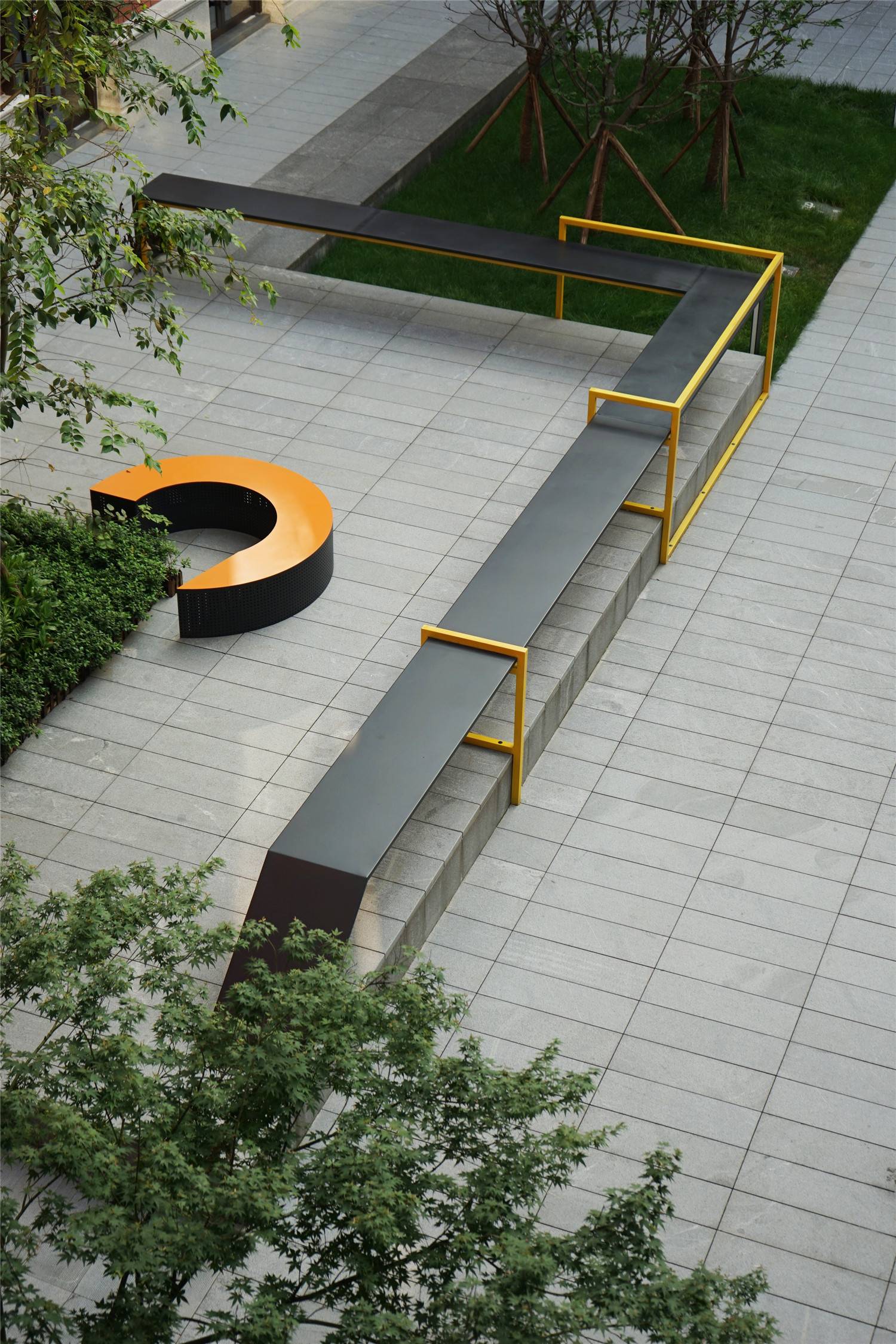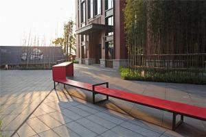 In order to improve the recognition of the courtyard, based on the simple black and gray tones of the entire park, the design gives each courtyard a different color and personality through the color changes of guides, courtyard furniture, facilities, etc. For example, the open courtyard-yellow Lively and bright, passionate and unrestrained in red, free and fun in blue, harmonious and quiet in green, each courtyard is designed with an in-depth space atmosphere around its main color and character, so that the original similar spaces become diverse and clear.