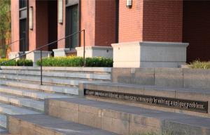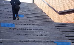 從商業(yè)主軸線到二三樓的屋頂庭院空間,只有兩條夾在建筑立面的步行臺(tái)階可以到達(dá),為了削減在兩面高大的山墻之間行走的逼仄感,設(shè)計(jì)將臺(tái)階進(jìn)行了藝術(shù)化的處理,在臺(tái)階的中斷停留處設(shè)置雕塑,植入場(chǎng)所的文化理念,讓臺(tái)階本身就成為一處視覺記憶和停留空間,再加上在屋頂庭院對(duì)景焦點(diǎn)處的景觀引導(dǎo),讓整個(gè)行走變得趣味盎然。
