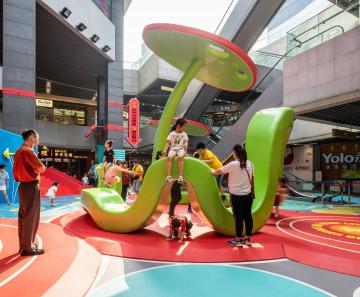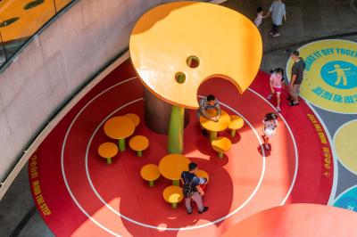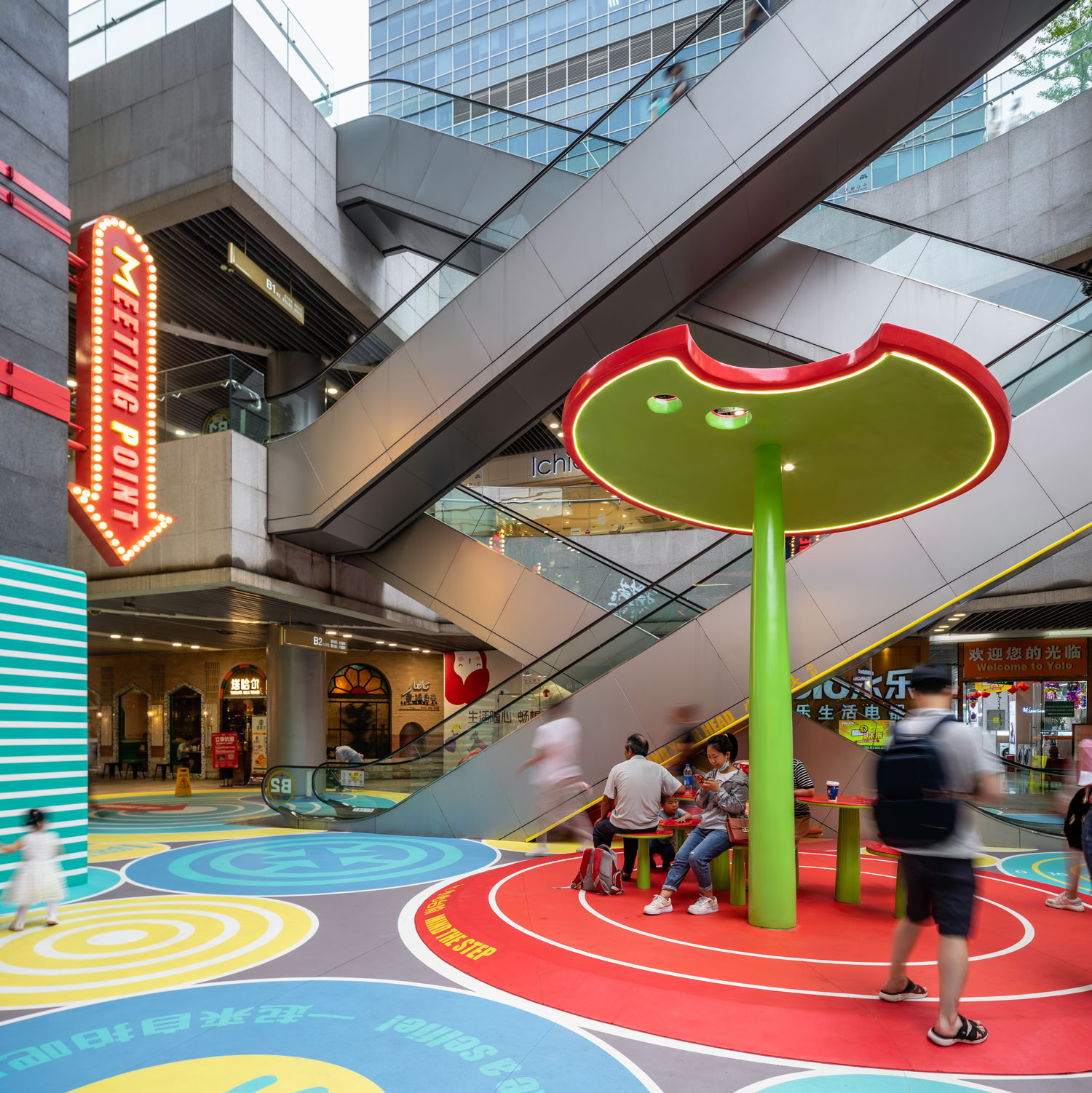 將這座幾乎被閑置的下沉式廣場翻新改造的主要想法是將灰色和無趣的空間轉(zhuǎn)化成一個引人注目、色彩鮮艷和充滿活力的公共空間。在閔行繁華的交叉路口,能夠促進(jìn)公眾社交互動、提高商場娛樂性以及增加身臨其境的體驗。