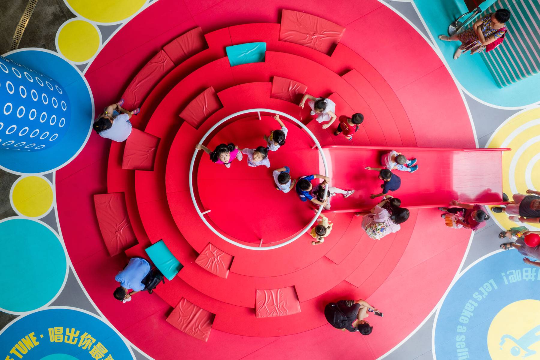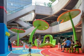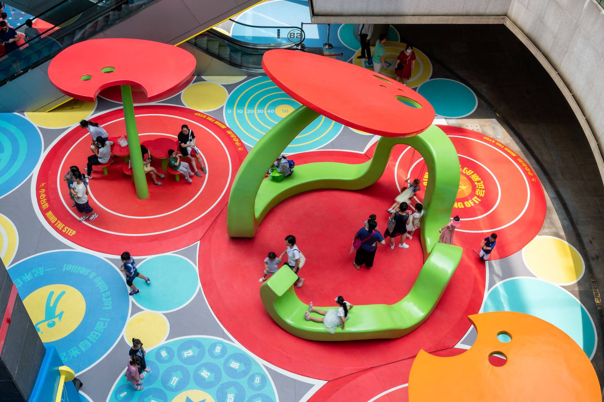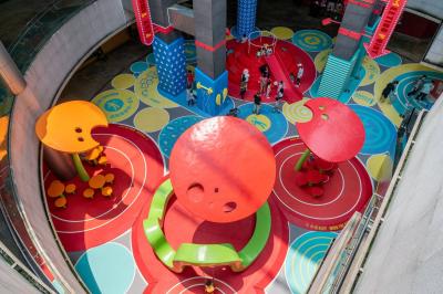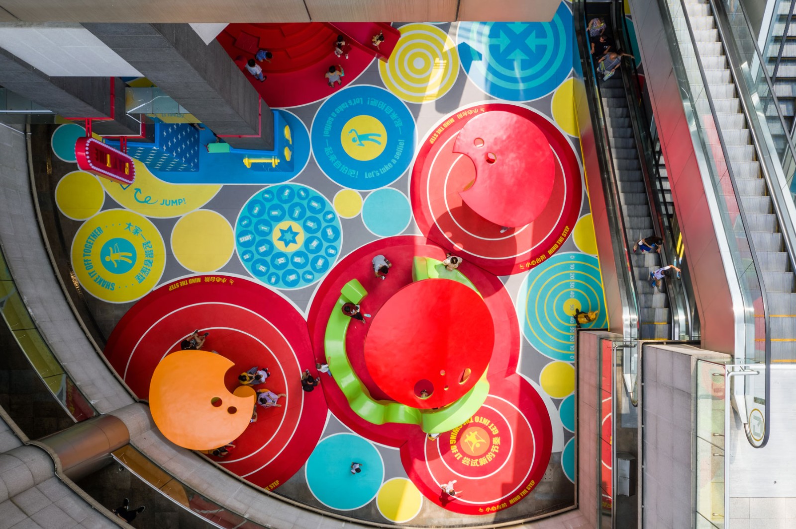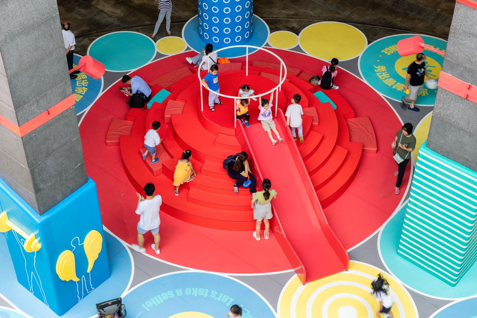 This revamp of this almost abandoned sunken plaza had as a main objective turning the grey and obsolete space into an eye-catching, bold and vibrant public space fostering social interactions, entertainment and a fun immersive experience below the surface of buzzy intersection streets in Minhang.